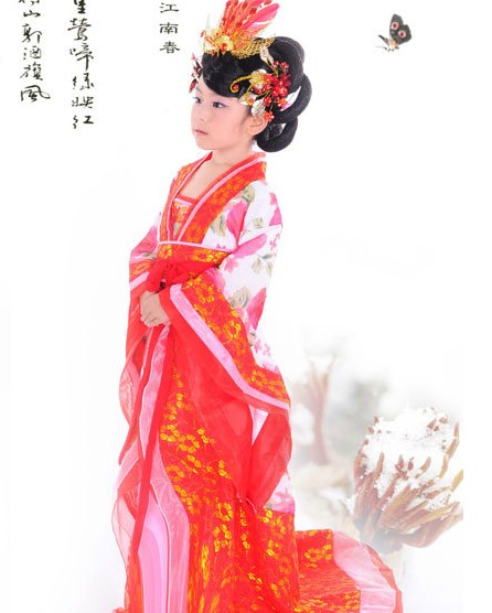 This exquisite children's Hanfu captures the elegance of the Tang Dynasty with its flowing pink and white floral fabrics and vibrant red accents. Crafted from lightweight, breathable materials, the costume features wide sleeves and a layered skirt that moves beautifully, making it perfect for young performers. The ensemble includes a stunning golden hairpiece adorned with red flowers, completing the authentic ancient Chinese princess look. Ideal for cultural festivals, stage performances, Halloween, or traditional celebrations, this outfit allows children to experience the beauty of classical Chinese heritage.