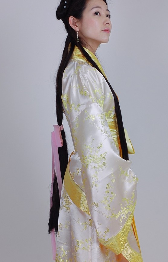 Step into the elegance of ancient China with this exquisite white and gold Hanfu, crafted from lustrous fabric featuring delicate floral brocade patterns. This traditional ensemble includes a cross-collar upper garment with flowing wide sleeves and a matching sash, perfectly capturing the graceful silhouette of historical Han Dynasty attire. Ideal for cultural festivals, tea ceremonies, stage performances, or immersive cosplay, this costume allows you to experience the timeless beauty of Chinese heritage. The intricate gold design and classic cut make it a stunning choice for photography and celebrating traditional aesthetics.