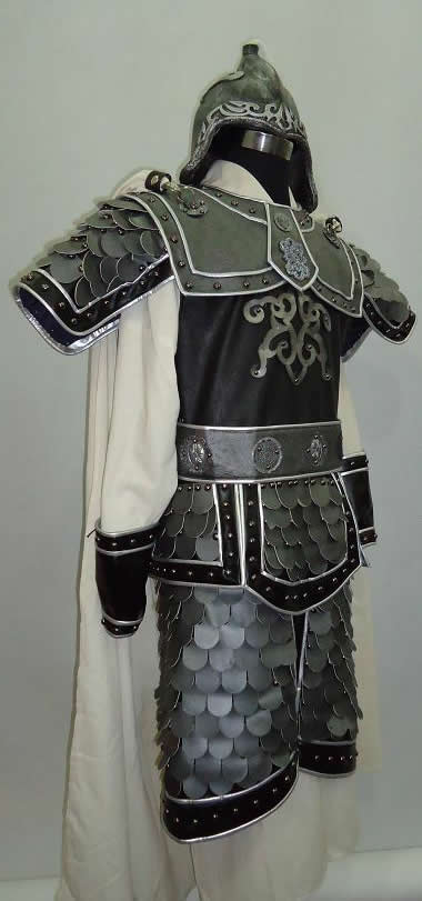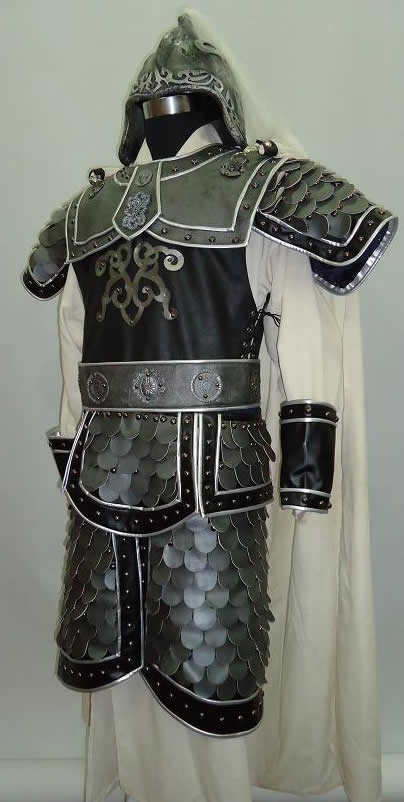 Step back in time with this stunning Ancient Chinese General armor set, designed to bring historical warriors to life. Crafted with intricate silver scale mail and durable black accents, this costume features a detailed chest plate, sturdy belt, and a matching helmet for a complete look. Perfect for cosplay conventions, theatrical productions, or martial arts demonstrations, this outfit captures the majestic essence of traditional Chinese military culture. The layered white sleeves add an elegant touch, blending battlefield readiness with imperial dignity.