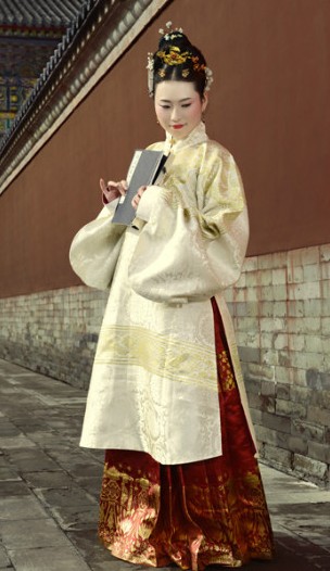 Step back in time with this exquisite Ming Dynasty Hanfu set, featuring a luxurious cream Pifeng coat paired with a majestic maroon Mamianqun skirt. Crafted from high-quality fabric with a subtle sheen, the ensemble showcases intricate gold embroidery along the hemlines and wide, flowing sleeves that embody ancient Chinese elegance. Perfect for traditional culture enthusiasts, this authentic costume is ideal for Hanfu gatherings, historical reenactments, photography sessions, or special ceremonial occasions. Embrace the grace of imperial history with this complete outfit that captures the sophisticated aesthetic of traditional Chinese aristocracy.