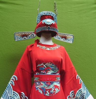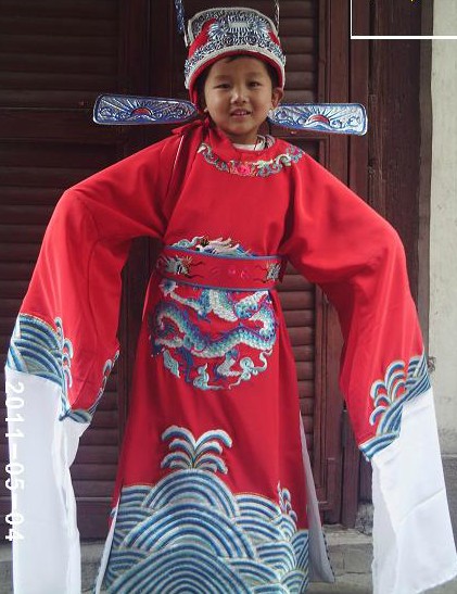 This exquisite traditional Chinese costume features a vibrant red robe adorned with intricate blue dragon embroidery and classic wave motifs at the hem. Designed for young boys, the outfit includes an elaborate headdress and distinctive shoulder flags, perfectly capturing the regal look of an ancient prince or opera general. Crafted with high-quality fabrics and detailed stitching, this ensemble is ideal for stage performances, cultural festivals, and special occasions like the Lunar New Year. Immerse your child in rich heritage with this authentic attire that celebrates the artistry of Chinese opera and history.