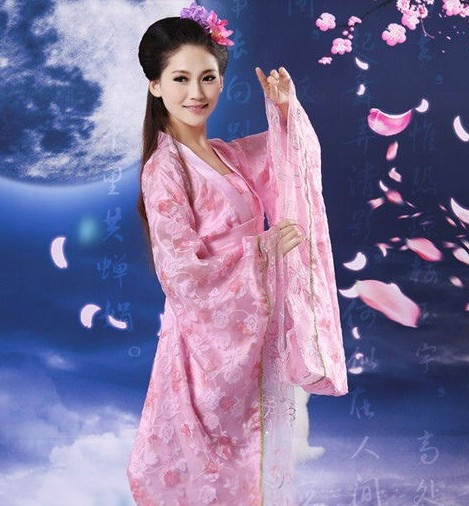 Embrace the elegance of ancient China with this stunning pink floral Hanfu set, featuring a sheer embroidered robe and a flowing blue skirt. Inspired by the legend of Chang'e and the Jade Rabbit, this costume is perfect for Mid-Autumn Festival celebrations or traditional cultural performances. Crafted from lightweight, breathable fabrics, the wide-sleeved design offers a graceful silhouette ideal for photography and cosplay events. Experience the beauty of traditional Chinese heritage with this exquisite outfit that blends historical style with modern comfort.