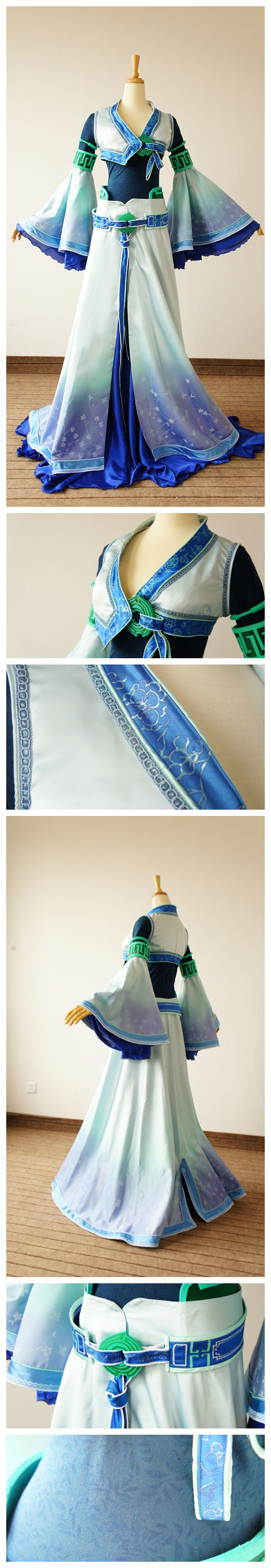 Step into the world of ancient legends with this exquisite blue gradient Hanfu, designed to evoke the elegance of a celestial fairy or skilled swordswoman. Crafted from flowing, high-quality fabrics, the outfit features dramatic wide sleeves with green geometric accents and a detailed sash that cinches the waist for a flattering silhouette. The skirt cascades in a beautiful ombre effect from white to deep blue, adorned with subtle floral patterns, making it perfect for traditional culture enthusiasts and cosplayers alike. Ideal for stage performances, photoshoots, or cultural celebrations, this ensemble captures the ethereal beauty of Chinese Wuxia and Xianxia aesthetics.