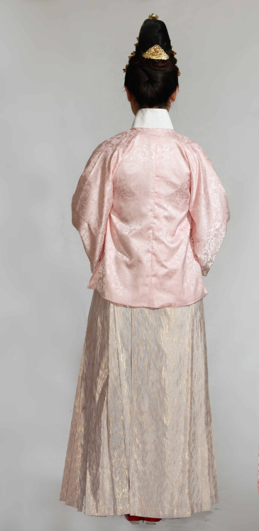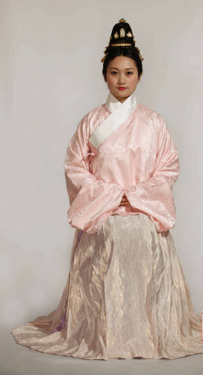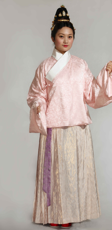 Embrace the elegance of ancient China with this exquisite Ming Dynasty-style Hanfu set, featuring a soft pink silk-blend jacket with wide sleeves and a contrasting white collar. The ensemble is completed by a flowing, pleated skirt in shimmering gold tones accented with a traditional purple sash, capturing the refined aesthetic of historical nobility. Perfect for cultural festivals, theatrical performances, or traditional photography, this costume includes an ornate black headpiece with gold detailing to complete the authentic look. Crafted for comfort and style, this traditional attire allows women to experience the grace and cultural heritage of classic Chinese fashion.