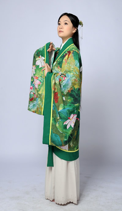 This exquisite traditional Chinese Hanfu features a stunning green robe adorned with vibrant lotus flower prints, capturing the elegance of the Ming Dynasty. Crafted with flowing wide sleeves and a classic cross-collar design, the outfit is paired with a graceful cream-colored pleated skirt for a complete historical look. Perfect for cultural festivals, tea ceremonies, or historical reenactments, this clothing allows wearers to immerse themselves in the beauty of ancient Chinese fashion.