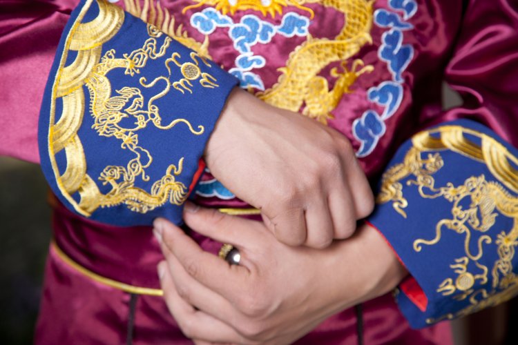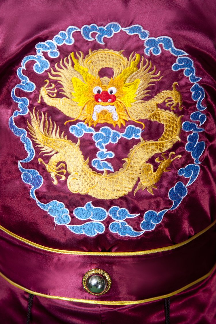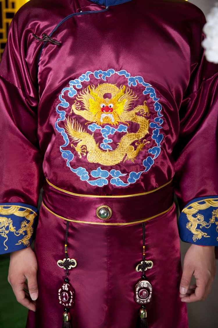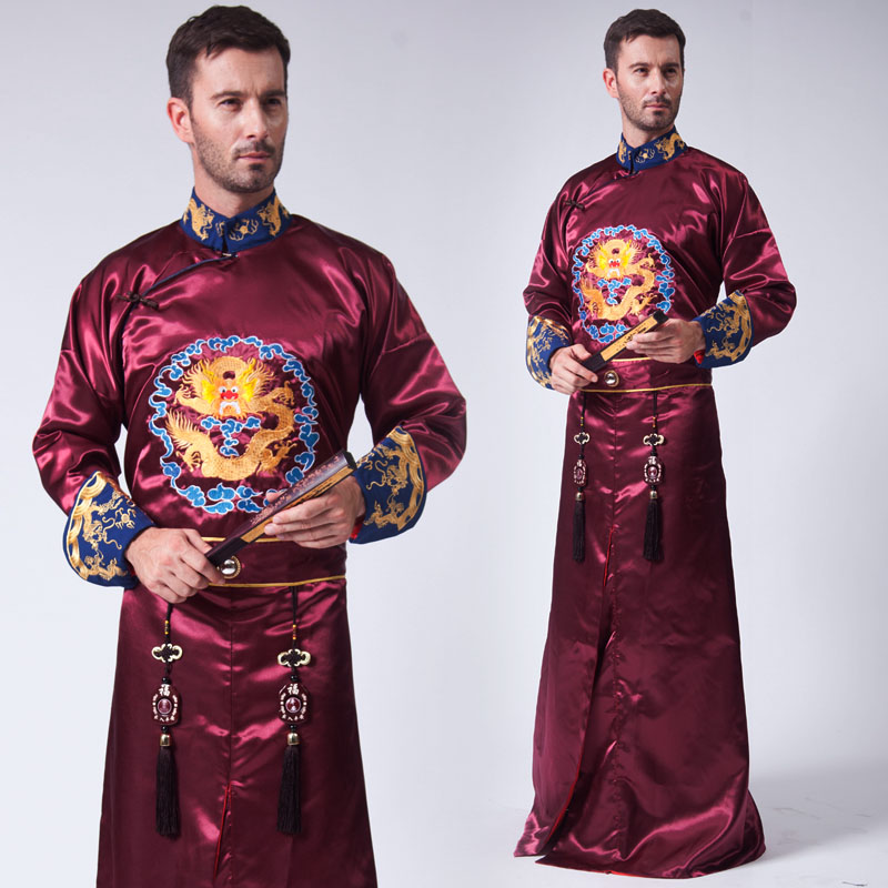 This elegant burgundy Tang suit features exquisite gold dragon embroidery on the chest and cuffs, symbolizing power and good fortune in Chinese culture. Crafted from high-quality satin fabric, this traditional garment offers a luxurious sheen and comfortable fit for special occasions. The design includes a classic mandarin collar with intricate blue patterns and decorative hanging tassels for an authentic traditional look. Perfect for wedding ceremonies, cultural performances, or Lunar New Year celebrations, this outfit allows men to showcase traditional Chinese heritage with style.
