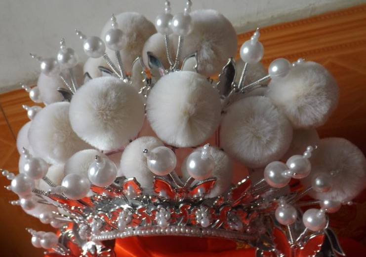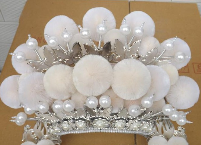 This exquisite traditional Chinese headdress features a stunning silver filigree crown adorned with plush white pom-poms and lustrous pearls. Designed for Peking Opera and Hanfu enthusiasts, it includes elegant long tassels that sway with movement, adding dramatic flair to any performance. Perfect for stage plays, cultural festivals, or historical cosplay, this accessory captures the regal elegance of ancient Chinese royalty.