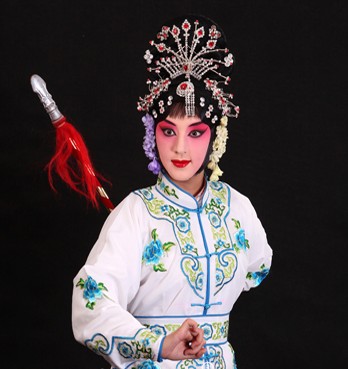 Immerse yourself in the elegance of ancient China with this exquisite white Peking Opera costume, featuring intricate blue and green floral embroidery on premium fabric. Designed for the dynamic "Daomadan" warrior role, this ensemble includes a stunning beaded headdress and a traditional spear with vibrant red tassels for authentic stage presence. Perfect for cultural festivals, theatrical productions, or cosplay events, this outfit captures the dramatic beauty and martial spirit of traditional Chinese performing arts.