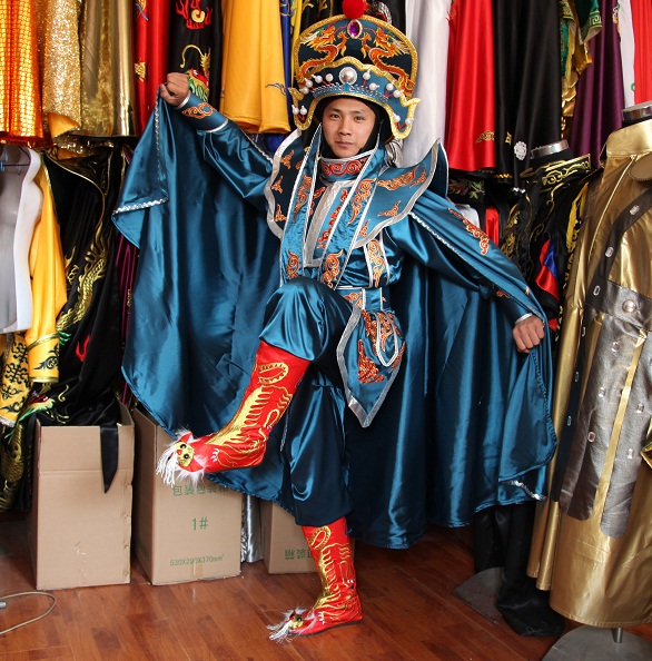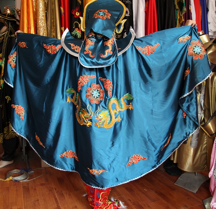 Step into the spotlight with this magnificent blue Chinese Opera General costume, designed for men seeking authentic traditional attire. Crafted from lustrous satin fabric, the ensemble features intricate gold and red embroidery depicting auspicious dragons and clouds, symbolizing power and nobility. The complete set includes a majestic cape, structured shoulder armor, and an elaborate phoenix headdress, perfect for Peking Opera performances, cultural festivals, or theatrical productions. Finish the look with the included red embroidered boots to fully embody the spirit of a legendary Chinese warrior.
