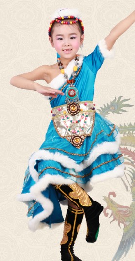 This vibrant blue costume captures the elegance of traditional Mongolian folk dance, featuring intricate gold embroidery and a regal beaded headpiece. The dress is designed with a flared, tiered skirt edged in plush white fur trim, ensuring graceful movement for young dancers. Perfect for stage performances, cultural festivals, or themed events, this outfit allows children to celebrate ethnic heritage in style. The look is completed with traditional black boots adorned with gold patterns, offering an authentic nomadic aesthetic.