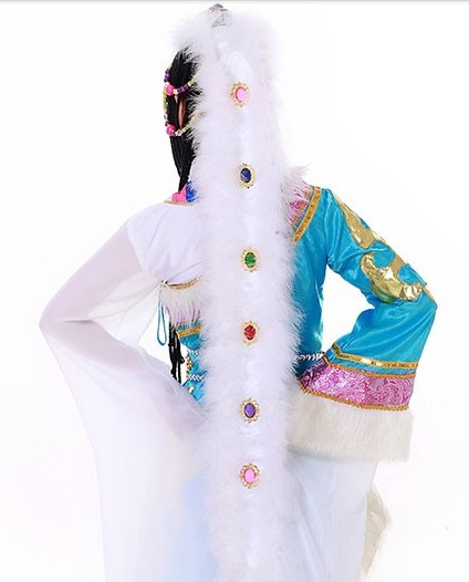 This stunning traditional ethnic dance costume features a vibrant turquoise gown adorned with intricate pink and gold embroidery. Designed for graceful movement, the outfit includes signature long white water sleeves and luxurious white fur trim along the cuffs and hem. The ensemble is completed with an ornate fur hat featuring dangling beads and braids, perfect for authentic folk dance performances. Ideal for stage shows and cultural celebrations, this attire captures the elegance and spirit of Tibetan heritage.