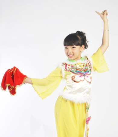 This vibrant yellow traditional Chinese folk dance costume is designed for young girls to shine during stage performances and cultural festivals. Featuring exquisite embroidery on the bodice and a plush fur collar, it captures the elegance of classic Yangge or ribbon dance attire. The flowing, wide sleeves allow for graceful, expressive movements, making it an essential piece for any dance troupe. Crafted for both comfort and visual impact, this outfit beautifully celebrates traditional heritage while ensuring the dancer stands out.