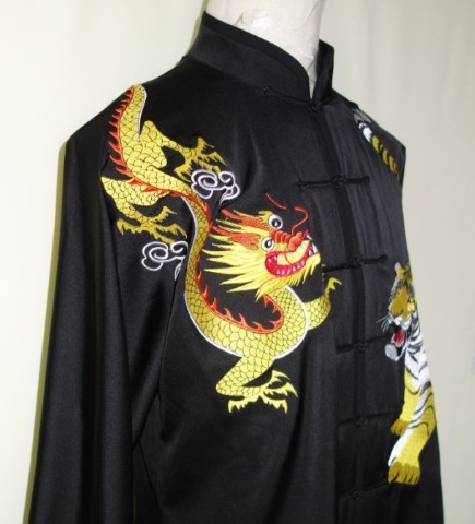 This striking black martial arts uniform features intricate golden embroidery of a dragon and tiger, symbolizing the harmonious balance of power and agility in traditional Chinese culture. Crafted from a smooth, silk-like fabric, the set includes a long-sleeved top with a classic Mandarin collar and traditional frog buttons, paired with loose-fitting trousers for unrestricted movement. Ideal for Tai Chi, Kung Fu, or Wushu practice, this costume offers both comfort and style for performances and daily training. The detailed cloud motifs on the pant legs add an authentic touch, making it a perfect choice for cultural festivals or meditation sessions.