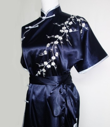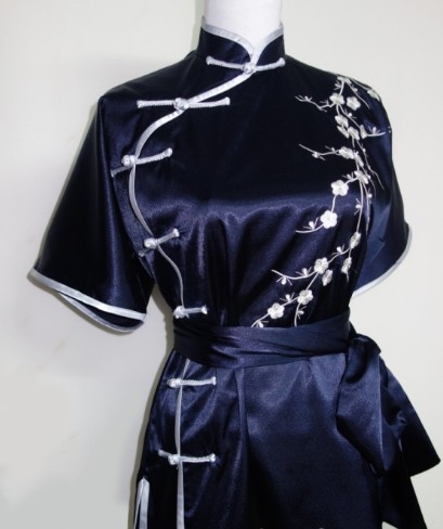 Crafted from lustrous navy blue satin, this traditional Chinese Kung Fu uniform set features a classic mandarin collar and elegant frog button closures for an authentic look. The outfit is beautifully adorned with delicate white plum blossom embroidery on the chest and pant leg, symbolizing resilience and purity in Chinese culture. Designed for comfort and fluid movement, this breathable two-piece suit is perfect for Tai Chi, Wushu practice, martial arts performances, or casual cultural wear. The matching trousers offer a relaxed fit, ensuring ease of motion during training or daily activities.