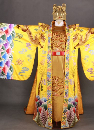 This exquisite traditional Chinese Taoist priest robe features magnificent gold dragon embroidery and intricate cloud patterns on premium yellow fabric, symbolizing supreme spiritual authority. The ensemble includes a flowing outer robe with detailed mountain and wave hems, a matching inner garment, a red sash, and an ornate ceremonial crown. Perfect for Taoist rituals, Chinese opera performances, or cultural exhibitions, this costume allows wearers to embody the grandeur of ancient Chinese religious heritage.