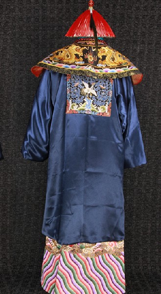 Immerse yourself in imperial history with this authentic Qing Dynasty official costume, crafted from lustrous blue silk and featuring a detailed embroidered rank badge (Buzi) on the chest. The ensemble includes traditional Manchu elements such as horse-hoof cuffs, a colorful "water and cliff" hem pattern, a red official's hat, and a long court bead necklace. Ideal for theater productions, historical cosplay, or cultural displays, this majestic attire accurately reflects the sartorial elegance and status symbols of ancient Chinese civil officials.