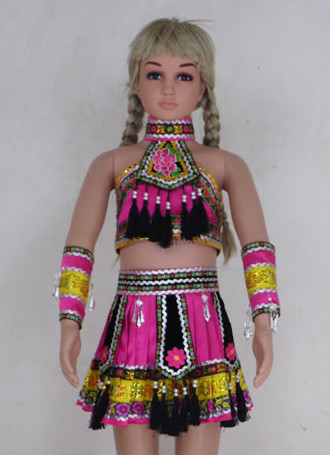This vibrant pink and black costume is inspired by the traditional attire of the Chinese Miao ethnic minority, designed specifically for young dancers. It features intricate embroidery, layered ruffled skirts with colorful tassels, and matching leg gaiters, capturing the authentic look of folk celebrations. The ensemble includes a distinctive silver-style headpiece and is perfect for performances involving bamboo stick dancing or drumming routines. Ideal for cultural festivals, stage competitions, and school talent shows, this outfit allows children to celebrate heritage through movement and color.
