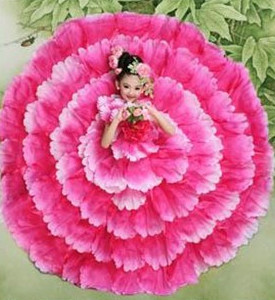 This stunning pink peony dance costume features a voluminous, multi-layered skirt designed to mimic the lush petals of a blooming flower. The ensemble includes a matching floral headpiece and a large bodice flower, creating a cohesive and eye-catching look for young performers. Celebrating the beauty of the peony, a symbol of prosperity and honor in Chinese culture, this outfit is perfect for folk dance recitals, stage performances, and festive cultural celebrations.