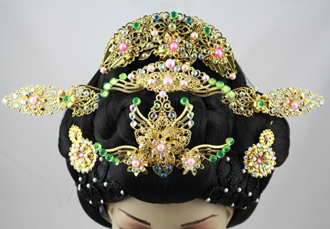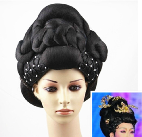 Step back in time with this exquisite Ancient Chinese Tang Dynasty-inspired hair wig and headpiece set, designed to transform you into a noble palace princess. The ensemble features a voluminous black chignon adorned with intricate gold metalwork, vibrant rhinestones, and delicate pearl accents that capture the opulence of traditional imperial aesthetics. Perfect for Hanfu enthusiasts, historical reenactments, stage performances, or bridal photography, this complete hair solution offers an authentic and regal look. The durable craftsmanship ensures the ornate phoenix motifs and side wings stay secure, allowing you to embody the grace and elegance of ancient Chinese culture with confidence.