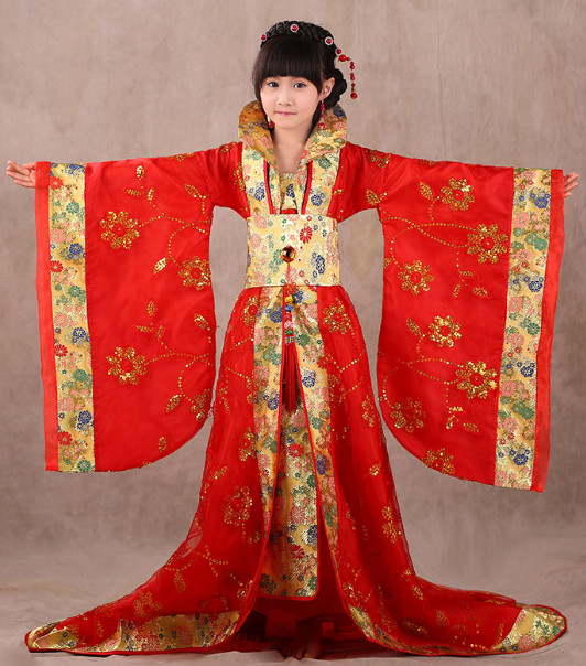 This exquisite red Hanfu features intricate gold floral embroidery and wide sleeves, capturing the elegance of ancient Chinese royalty. Crafted from high-quality fabric with a flowing train, it is perfect for young girls to wear during cultural festivals, stage performances, or traditional celebrations. The vibrant red color symbolizes good luck and joy, making it an ideal choice for Chinese New Year or special occasions. Designed with authentic details like patterned borders and a high collar, this costume allows children to immerse themselves in traditional heritage.