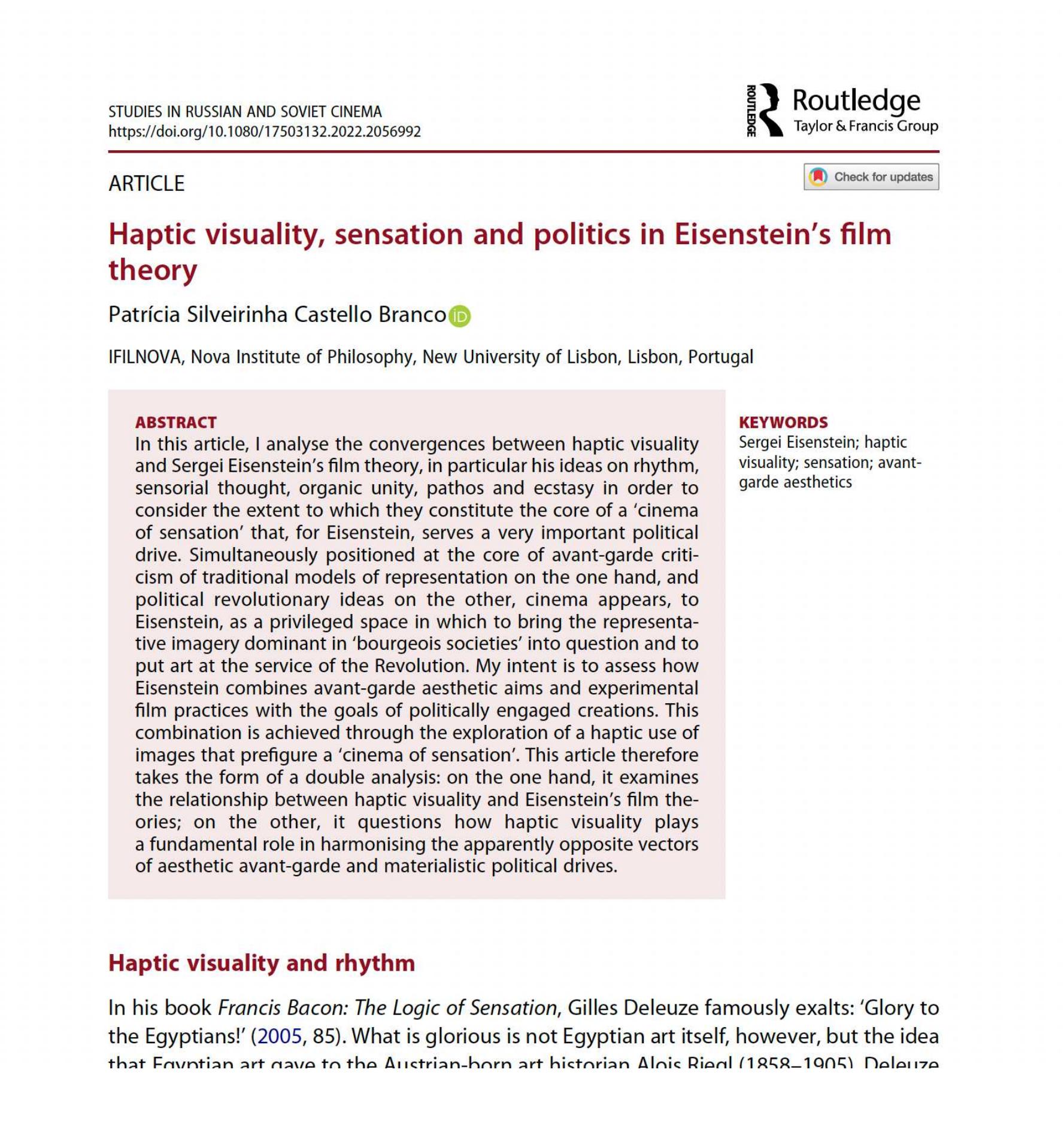 In this article, I analyse the convergences between haptic visuality and Sergei Eisenstein’s film... more In this article, I analyse the convergences between haptic visuality and Sergei Eisenstein’s film theory, in particular his ideas on rhythm, sensorial thought, organic unity, pathos and ecstasy in order to consider the extent to which they constitute the core of a ‘cinema of sensation’ that, for Eisenstein, serves a very important political drive. Simultaneously positioned at the core of avant-garde criti- cism of traditional models of representation on the one hand, and political revolutionary ideas on the other, cinema appears, to Eisenstein, as a privileged space in which to bring the representa- tive imagery dominant in ‘bourgeois societies’ into question and to put art at the service of the Revolution. My intent is to assess how Eisenstein combines avant-garde aesthetic aims and experimental film practices with the goals of politically engaged creations. This combination is achieved through the exploration of a haptic use of images that prefigure a ‘cinema of sensation’. This article therefore takes the form of a double analysis: on the one hand, it examines the relationship between haptic visuality and Eisenstein’s film the- ories; on the other, it questions how haptic visuality plays a fundamental role in harmonising the apparently opposite vectors of aesthetic avant-garde and materialistic political drives.