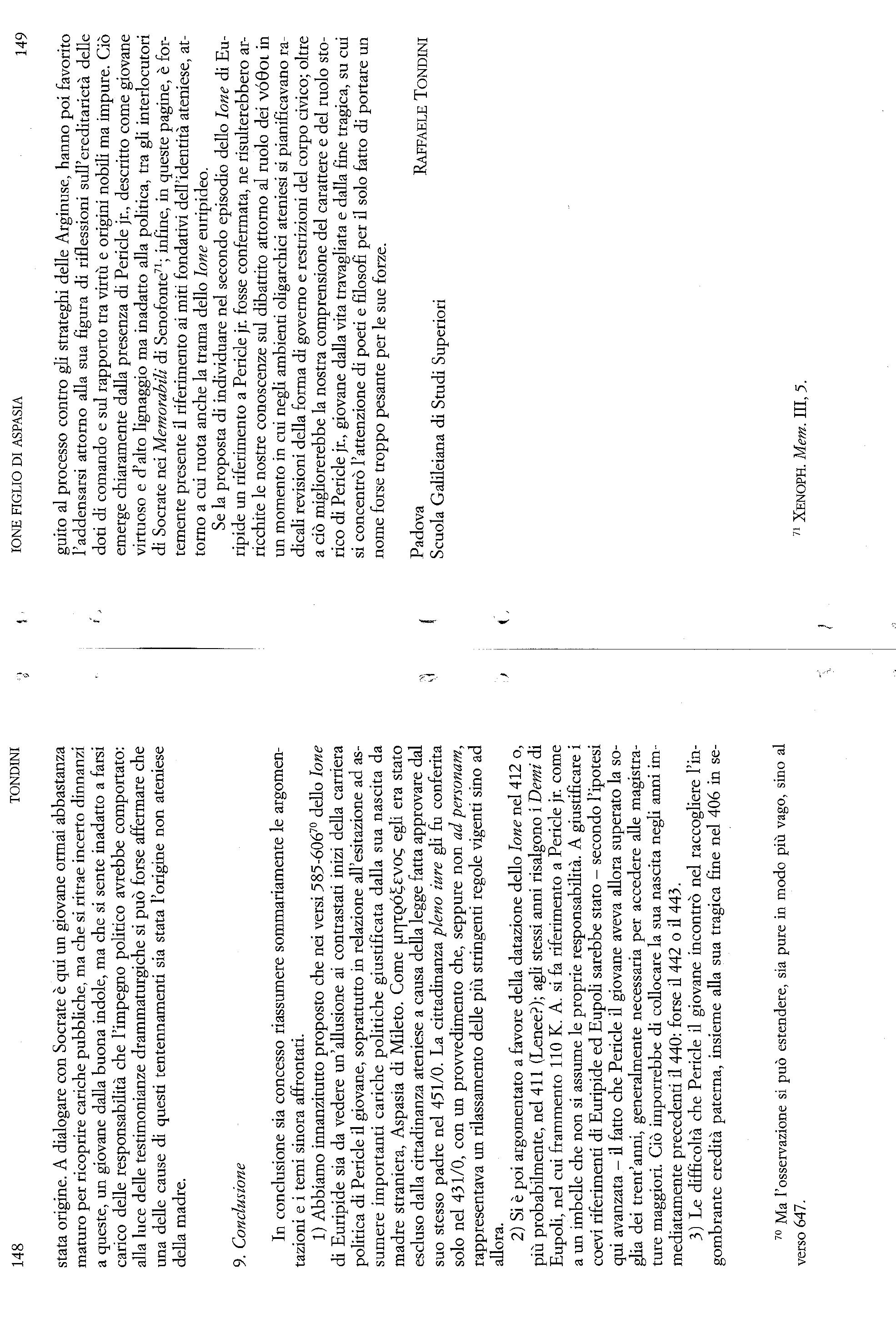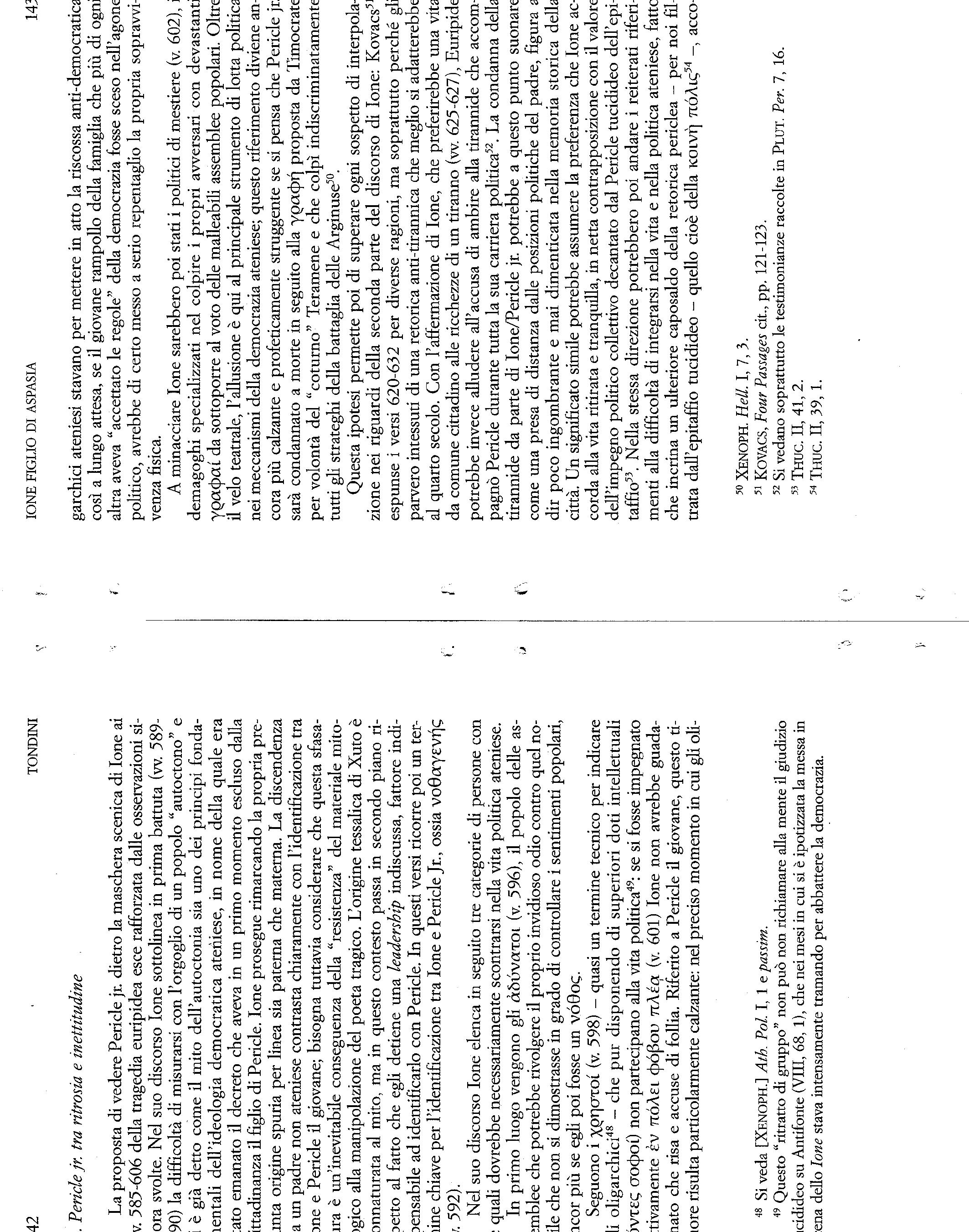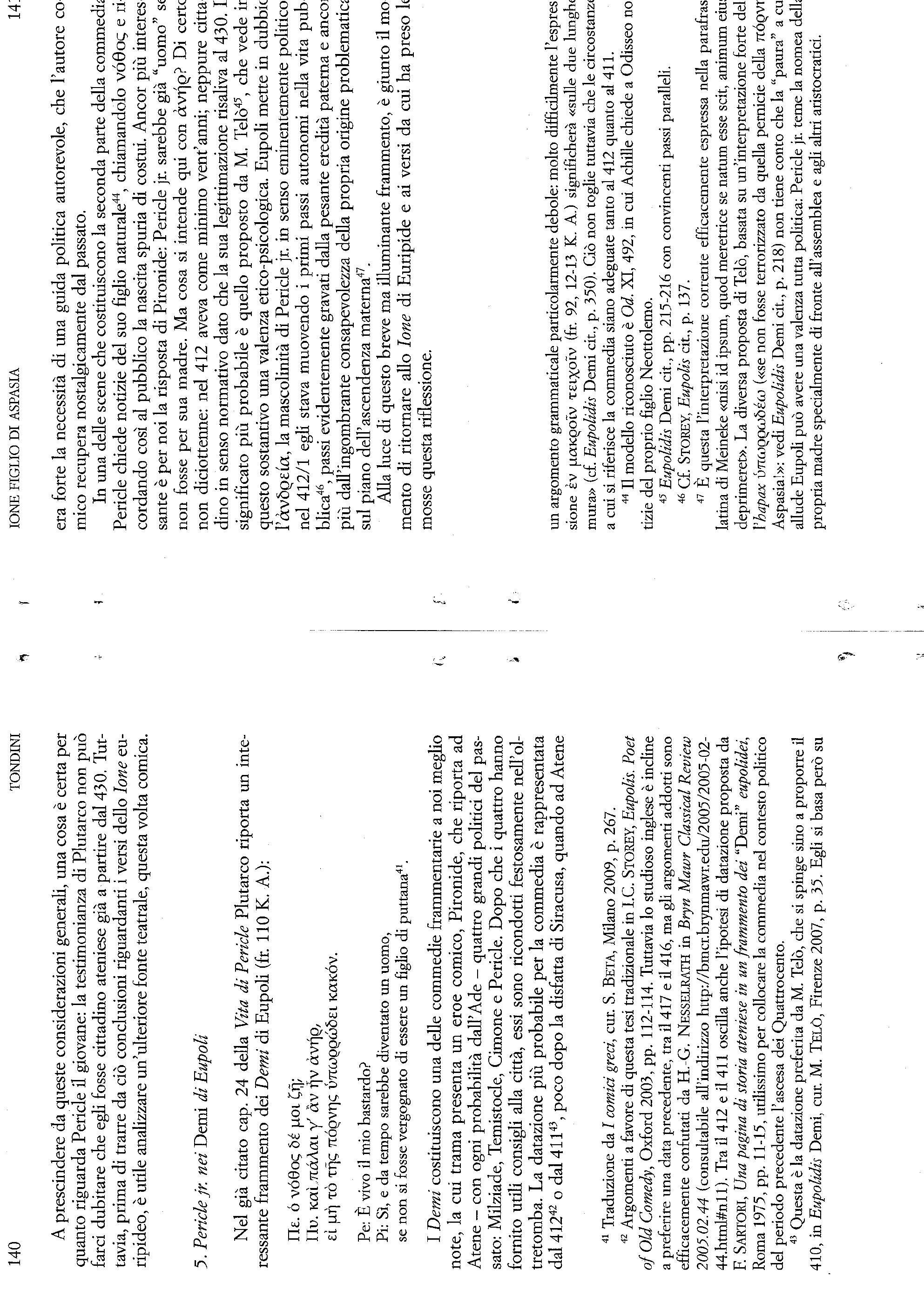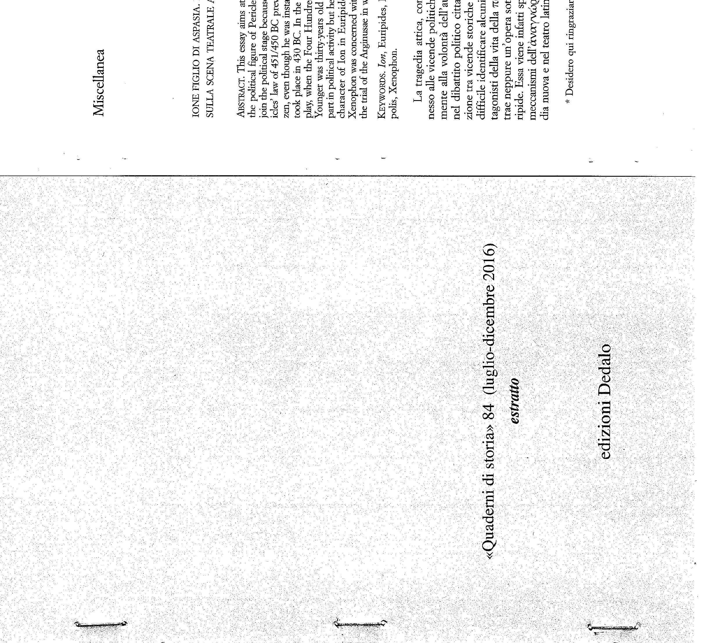 This essay aims at showing that ll. 582-606 of Euripides’ Ion alludes to the political figure of ... more This essay aims at showing that ll. 582-606 of Euripides’ Ion alludes to the political figure of Pericles the Younger. Ion and Pericles’ son are reluctant to join the political stage because of their not entirely Attic ancestry. In particular, Pericles’ law of 451/450 BC prevented Pericles the Younger from being Athenian citizen, even though he was instated into the citizenship later thanks to a reform which took place in 430 BC. In the year 411 BC, a likely date for the performance of the play, when the Four Hundreds established an oligarchic government, Pericles the Younger was thirty-years old (or more) and, as argued in the essay, he could take part in political activity but he was hesitant and this attitude of his was shown by the character of Ion in Euripides’ tragedy and by a line of Eupolis’ Demoi. Even Xenophon was concerned with the figure of Pericles the Younger (Men. III,5) after the trial of the Arginusae in which the latter had been put to death.