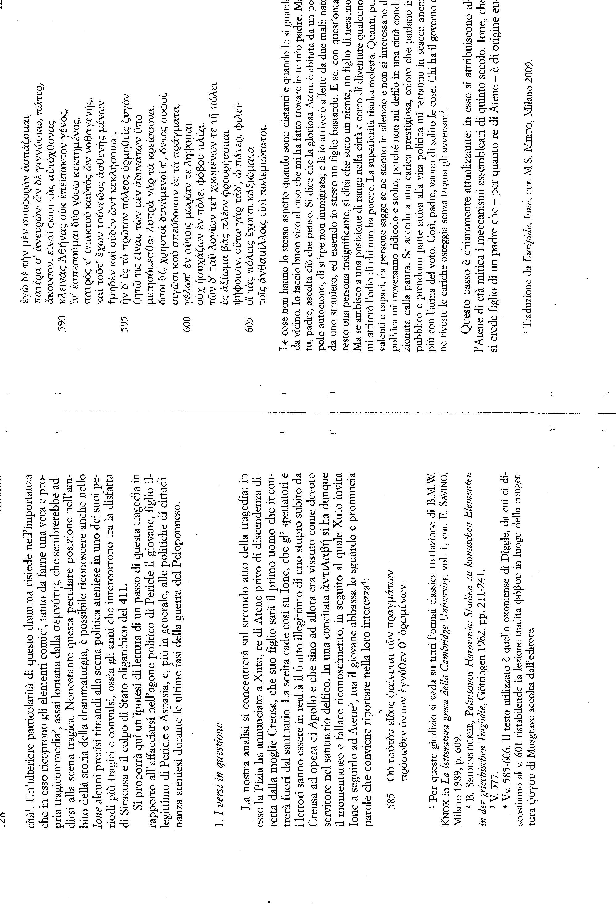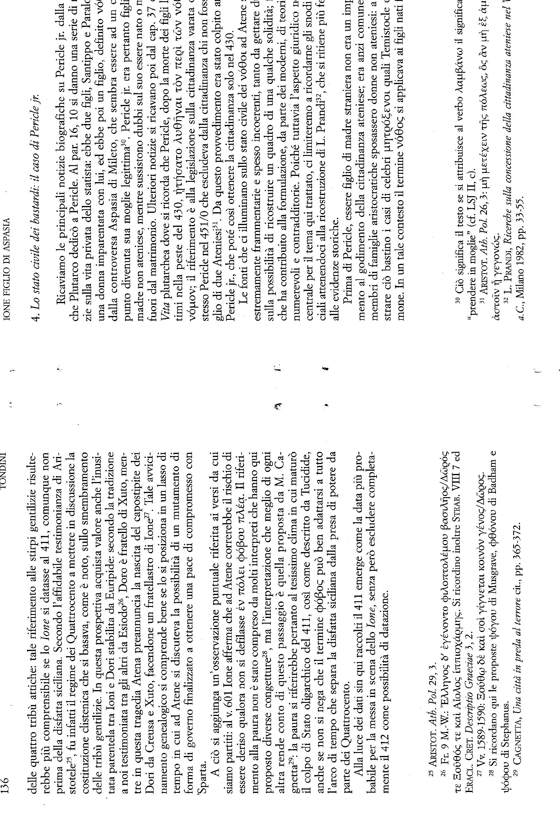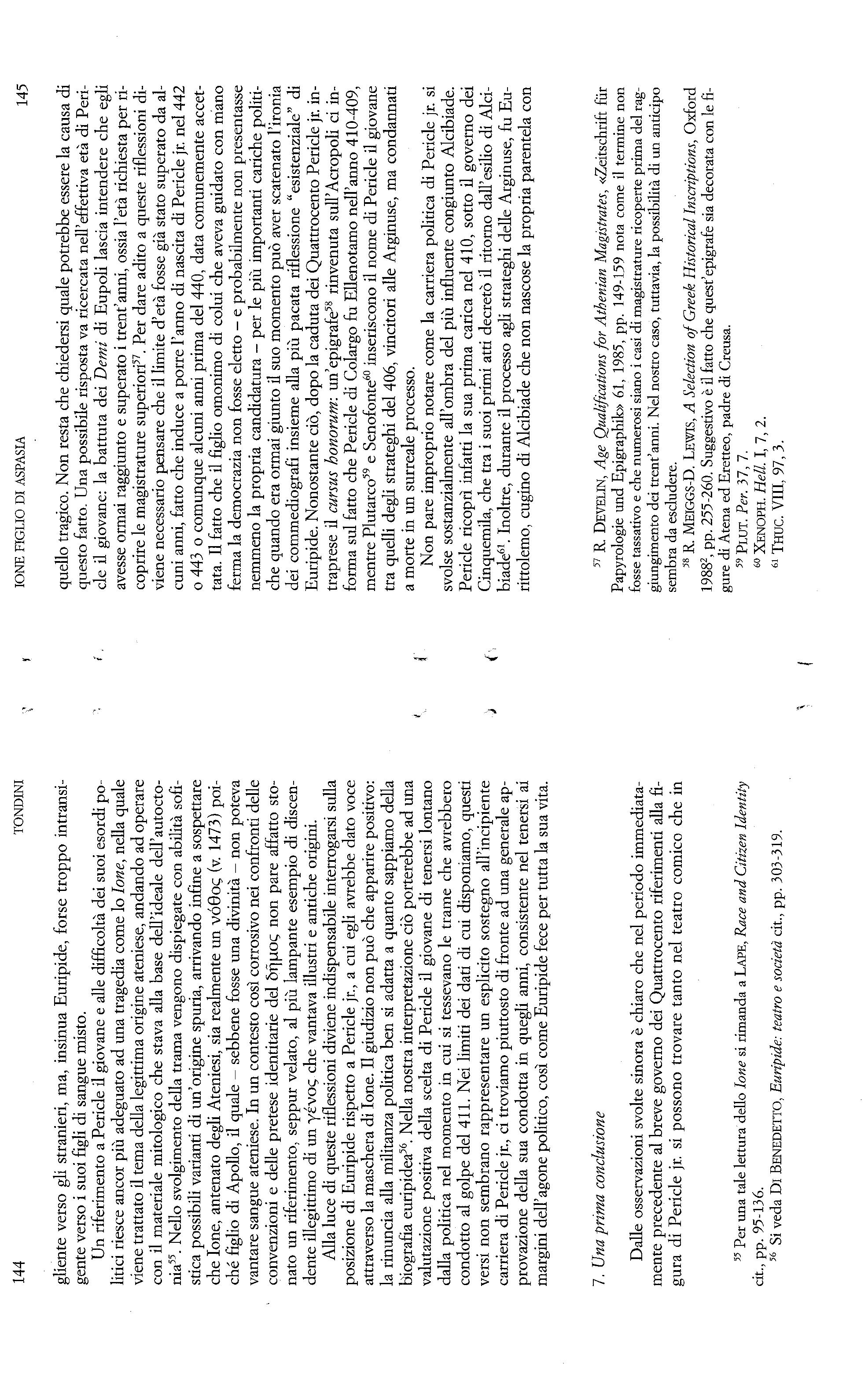 This essay aims at showing that ll. 582-606 of Euripides’ Ion alludes to the political figure of ... more This essay aims at showing that ll. 582-606 of Euripides’ Ion alludes to the political figure of Pericles the Younger. Ion and Pericles’ son are reluctant to join the political stage because of their not entirely Attic ancestry. In particular, Pericles’ law of 451/450 BC prevented Pericles the Younger from being Athenian citizen, even though he was instated into the citizenship later thanks to a reform which took place in 430 BC. In the year 411 BC, a likely date for the performance of the play, when the Four Hundreds established an oligarchic government, Pericles the Younger was thirty-years old (or more) and, as argued in the essay, he could take part in political activity but he was hesitant and this attitude of his was shown by the character of Ion in Euripides’ tragedy and by a line of Eupolis’ Demoi. Even Xenophon was concerned with the figure of Pericles the Younger (Men. III,5) after the trial of the Arginusae in which the latter had been put to death.