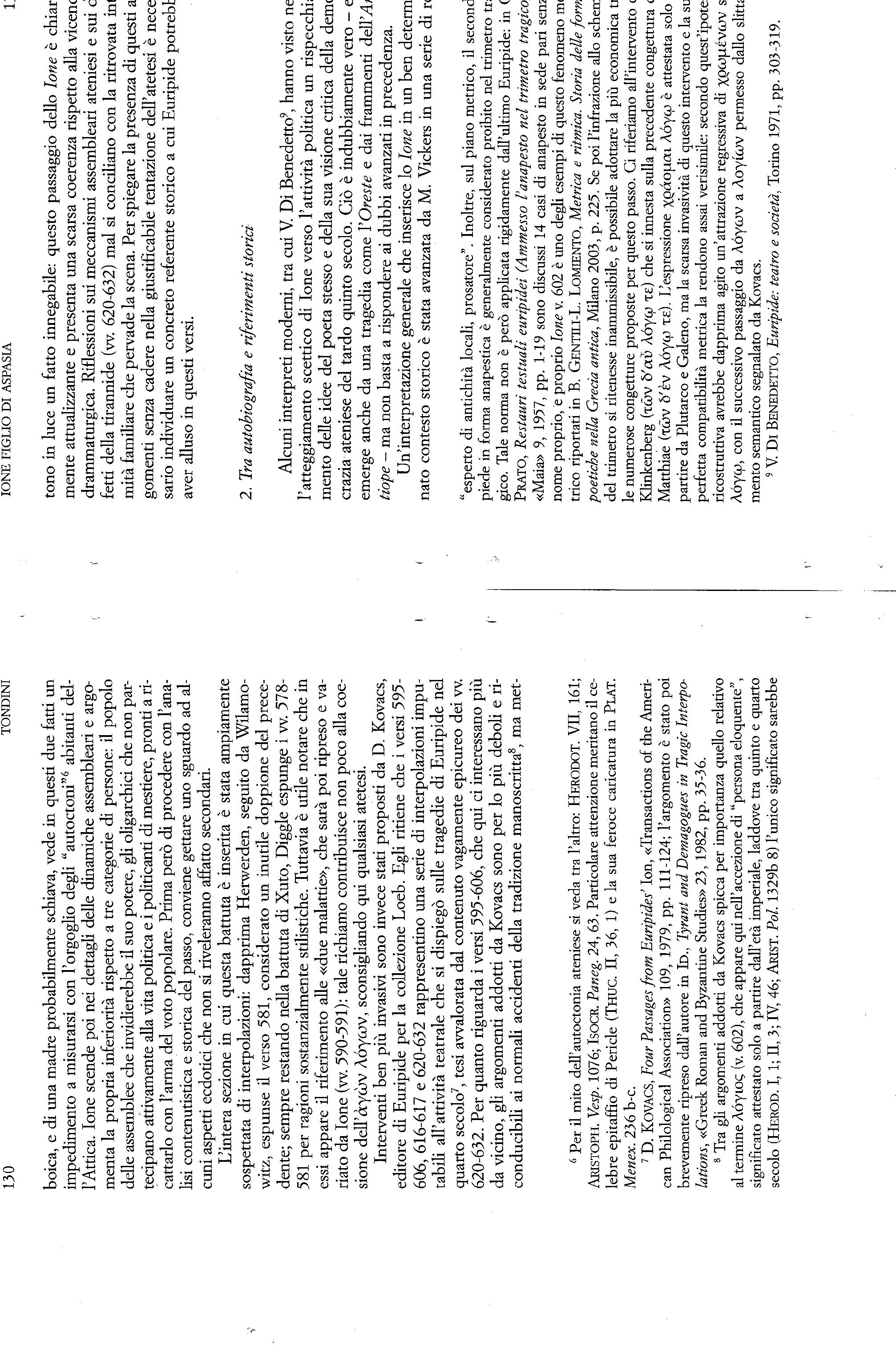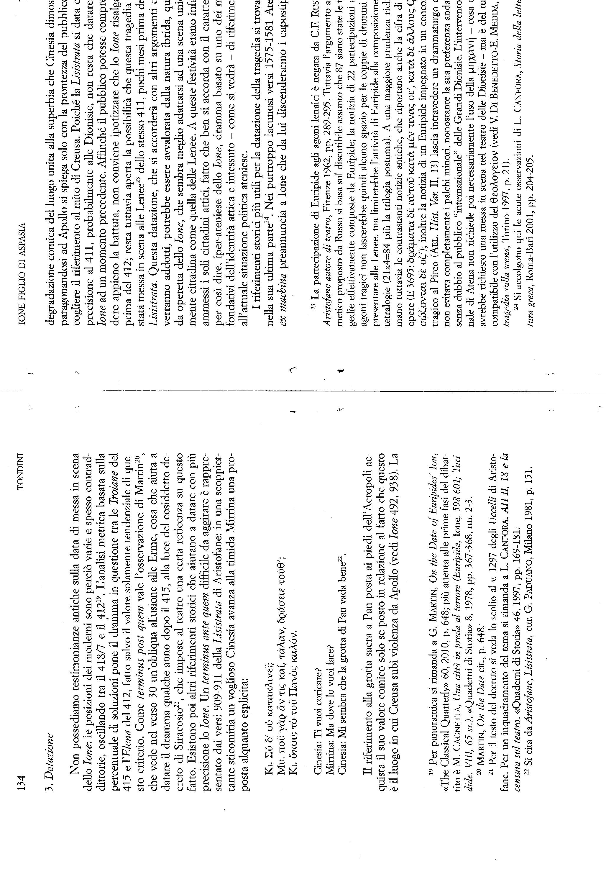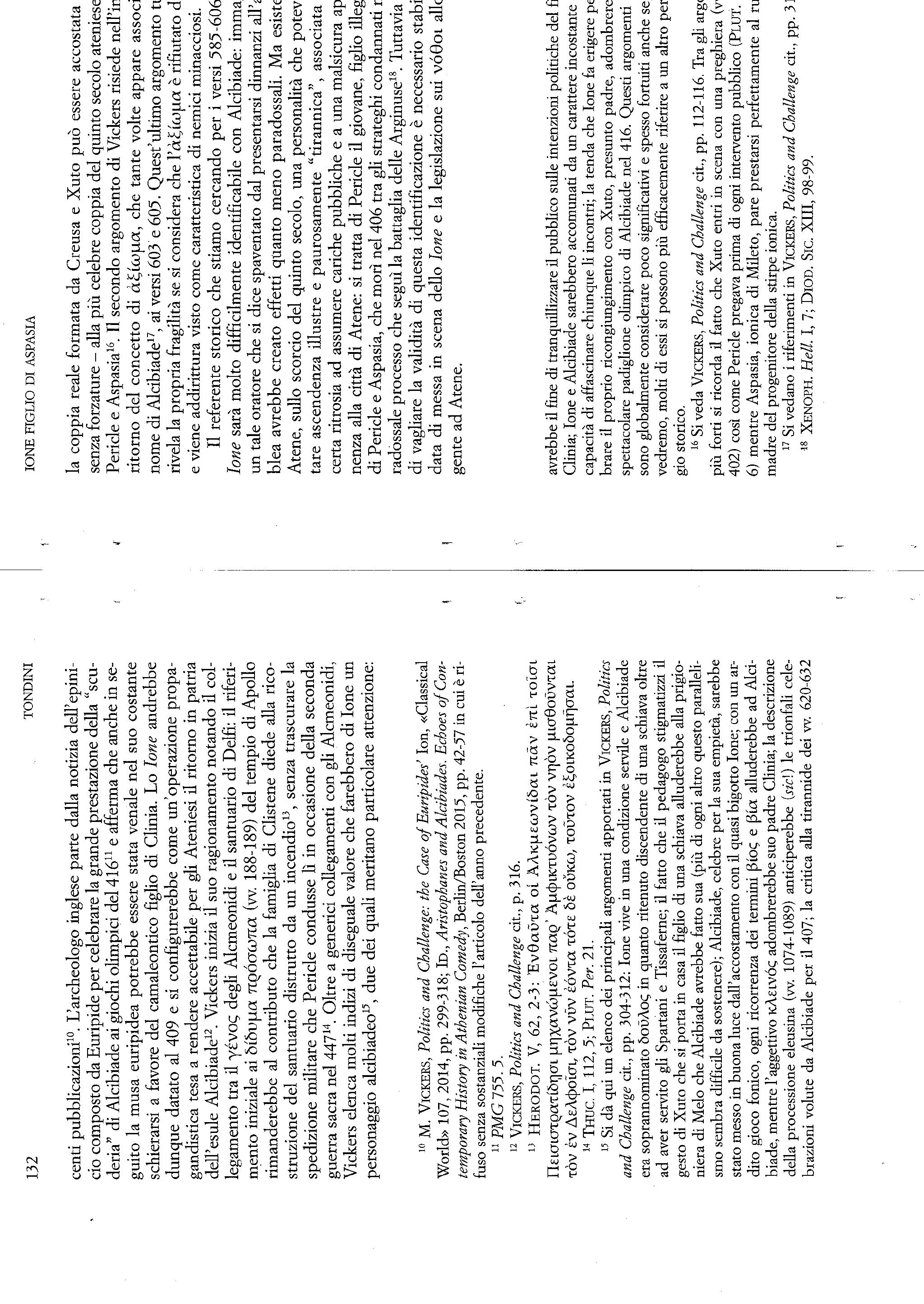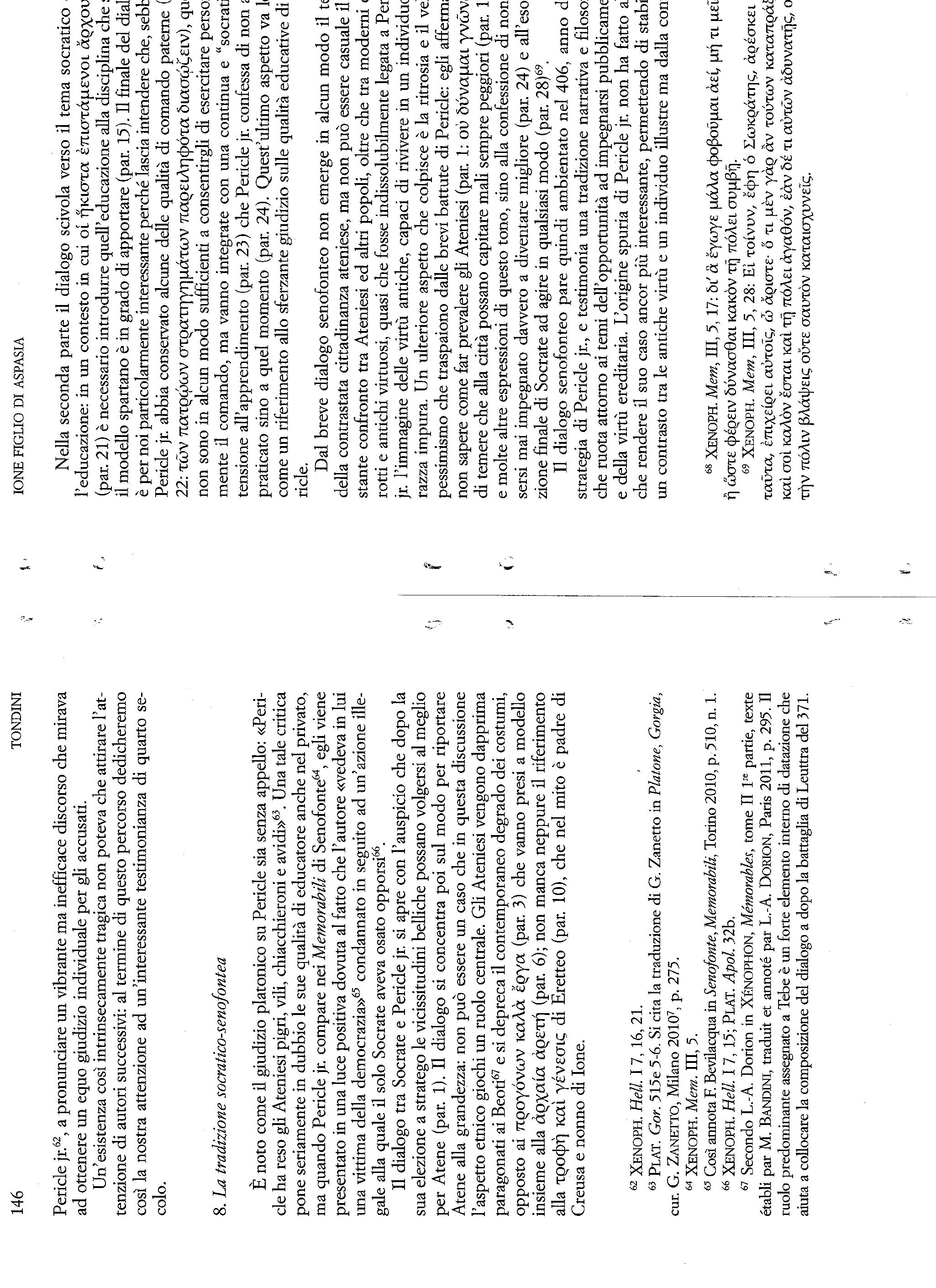 This essay aims at showing that ll. 582-606 of Euripides’ Ion alludes to the political figure of ... more This essay aims at showing that ll. 582-606 of Euripides’ Ion alludes to the political figure of Pericles the Younger. Ion and Pericles’ son are reluctant to join the political stage because of their not entirely Attic ancestry. In particular, Pericles’ law of 451/450 BC prevented Pericles the Younger from being Athenian citizen, even though he was instated into the citizenship later thanks to a reform which took place in 430 BC. In the year 411 BC, a likely date for the performance of the play, when the Four Hundreds established an oligarchic government, Pericles the Younger was thirty-years old (or more) and, as argued in the essay, he could take part in political activity but he was hesitant and this attitude of his was shown by the character of Ion in Euripides’ tragedy and by a line of Eupolis’ Demoi. Even Xenophon was concerned with the figure of Pericles the Younger (Men. III,5) after the trial of the Arginusae in which the latter had been put to death.
