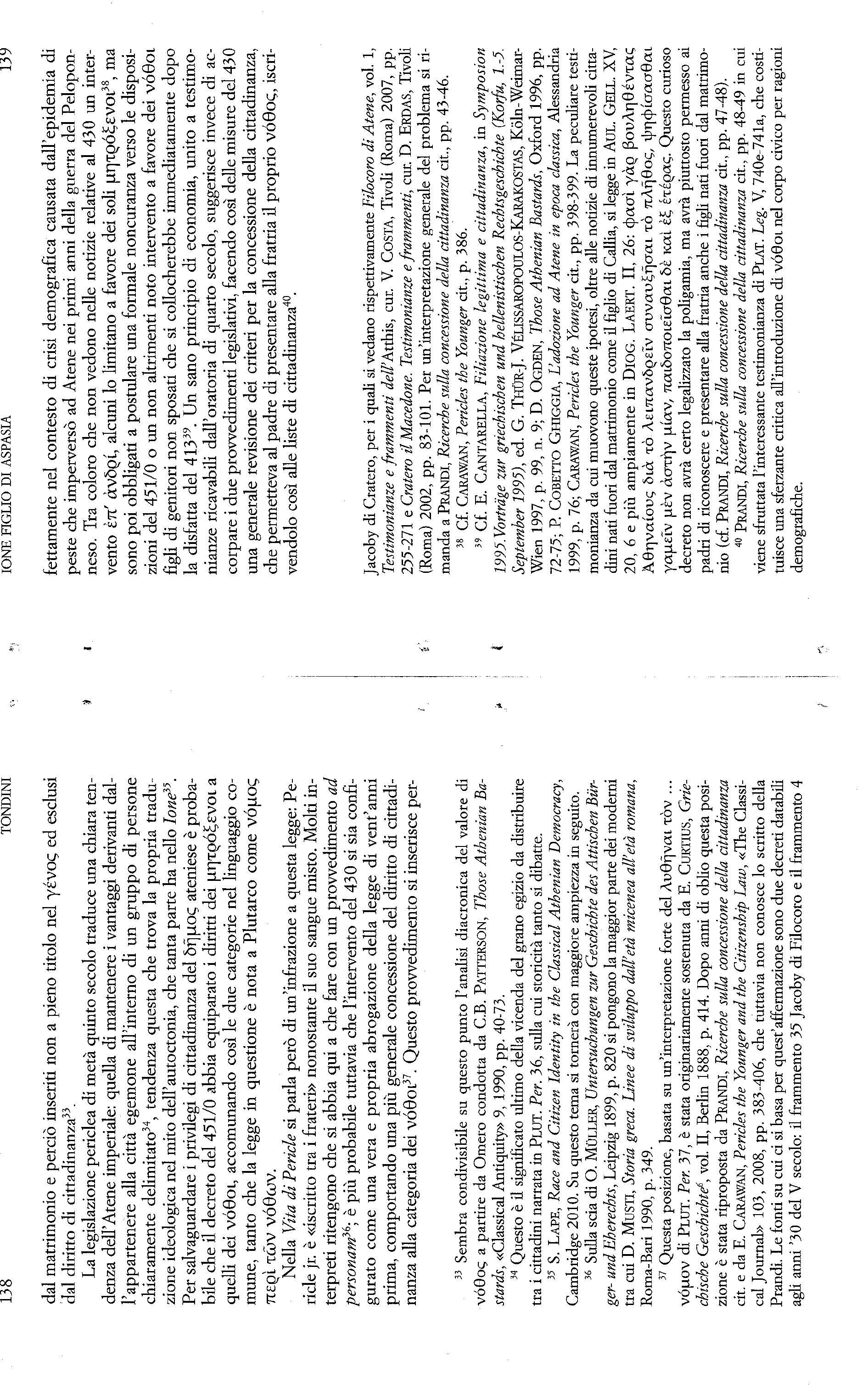 This paper aims at offering a general interpretation of Pericles’ citizenship law of 451/50 BC. A... more This paper aims at offering a general interpretation of Pericles’ citizenship law of 451/50 BC. A first section is devoted to the development of Athenian citizenship rules in the archaic period: the role of phratries in defining the legitimate birth – and consequently the possibility to obtain citizenship – is shown as crucial. The central part of the paper takes into consideration ancient witnesses and modern interpretations of Pericles’ citizenship law and argues legislative action was mainly aimed at strengthening social cohesion in a critical moment for the Athenian democracy. It is finally stated that this Periclean law, as it was not retroactive and was substantially abolished during the Peloponnesian War, had limited effects in the 5th century but was definitively re-established in 403/402 BC.