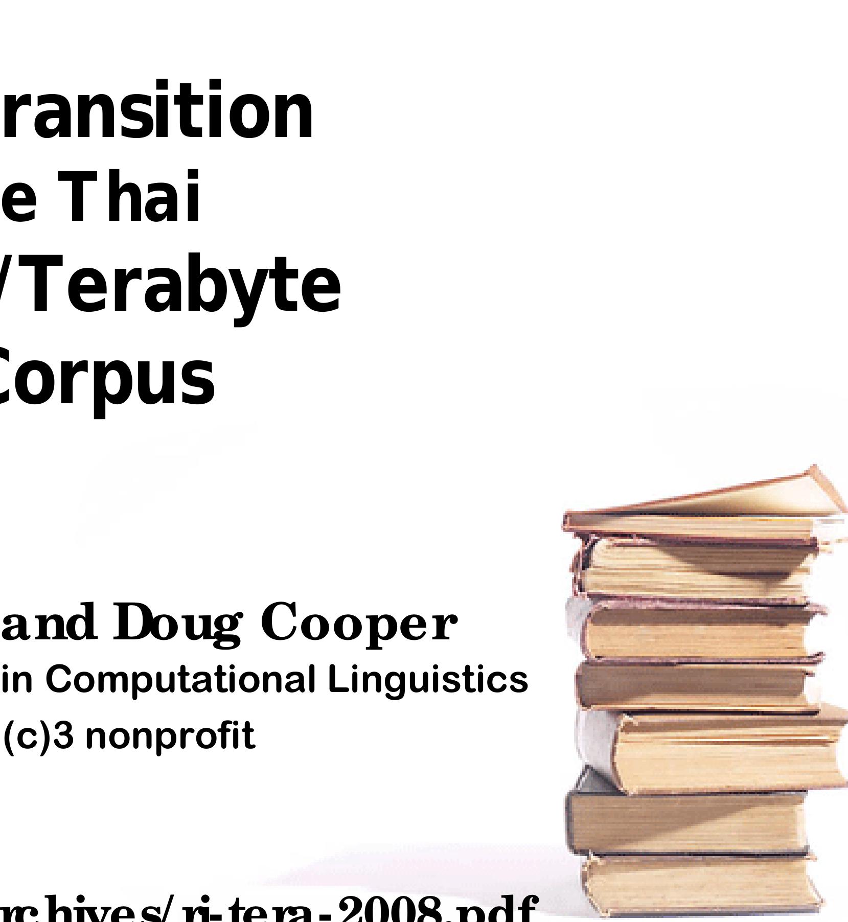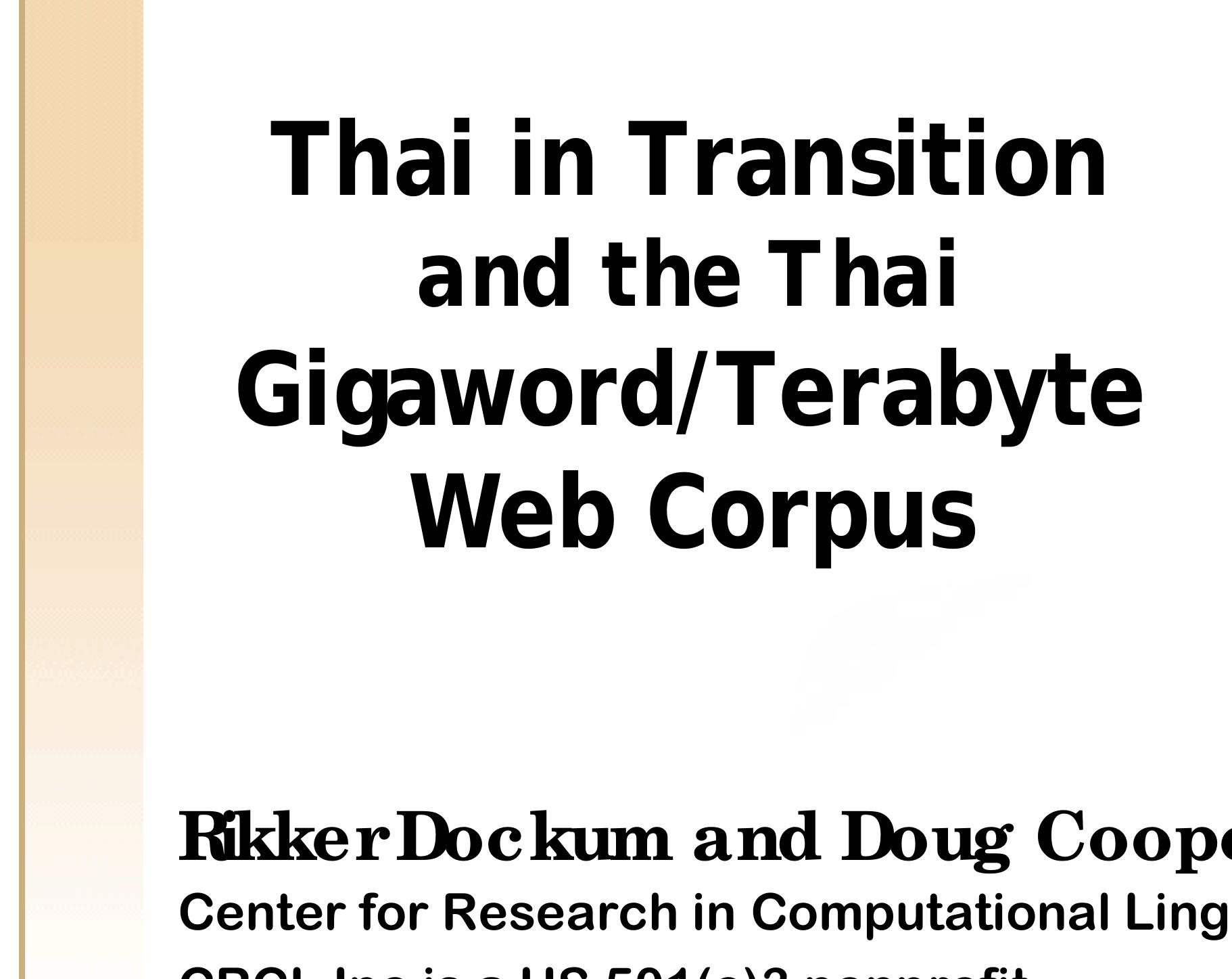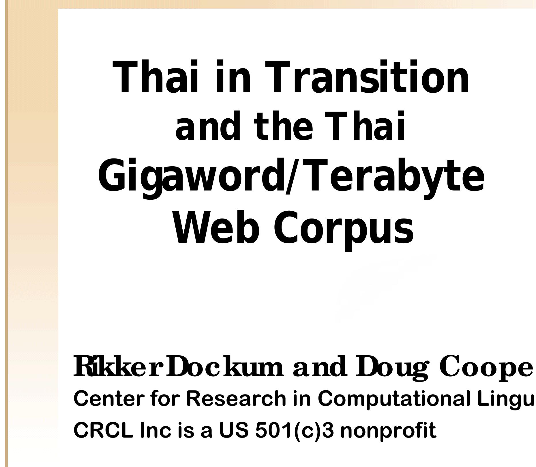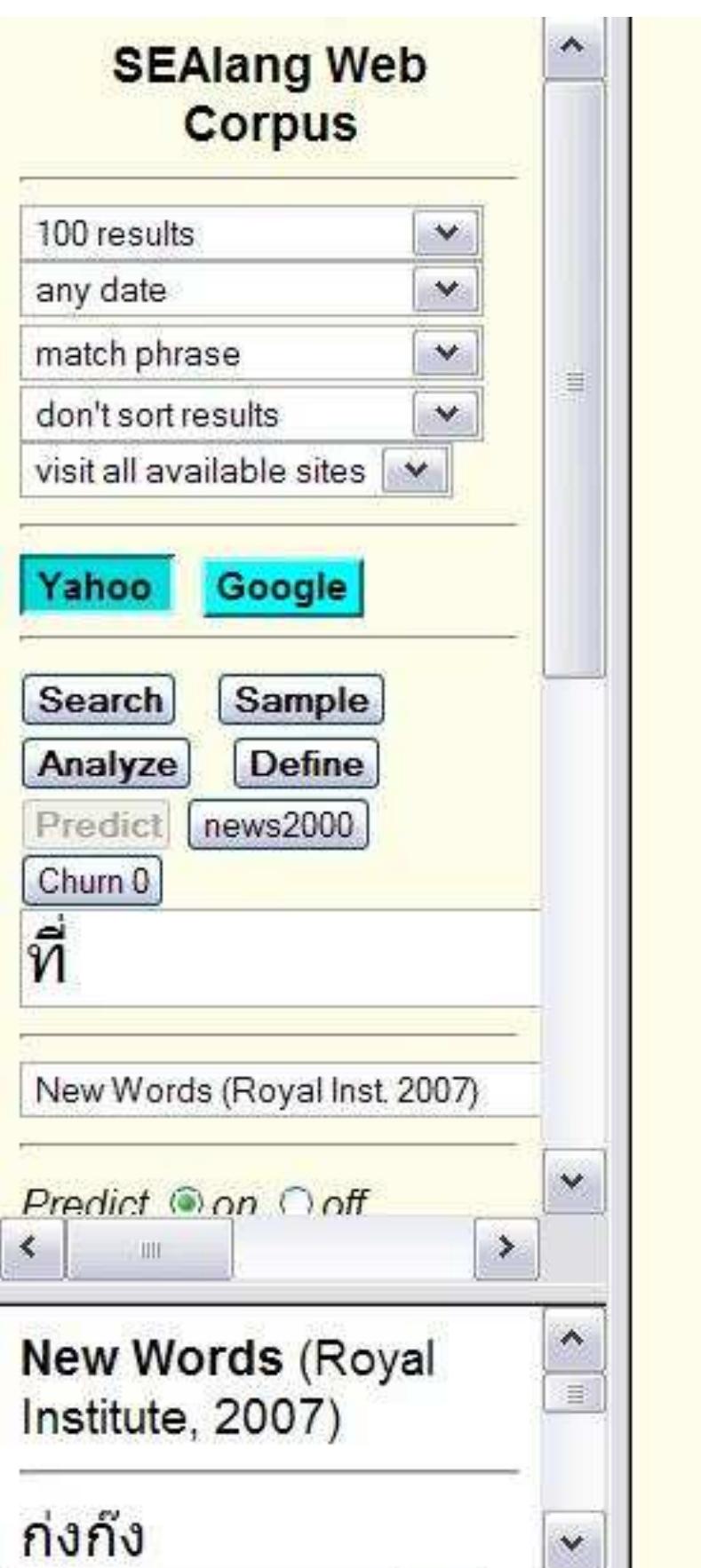 It is only within the past few years, however, that we are able to observe the transition of Thai in progress via the Internet. We estimate that at the end of 2007, roughly 100 million Thai-language Web pages have been indexed by the major search engines (based on counts of the extremely common word ที่). A conservative estimate of 1,000 Thai characters per page implies that this Web corpus includes some 100 billion characters, or more than 25 billion words. Thus, we are already able to consult a gigaword corpus 25 times over, and can anticipate access to a terabyte corpus within a few years.