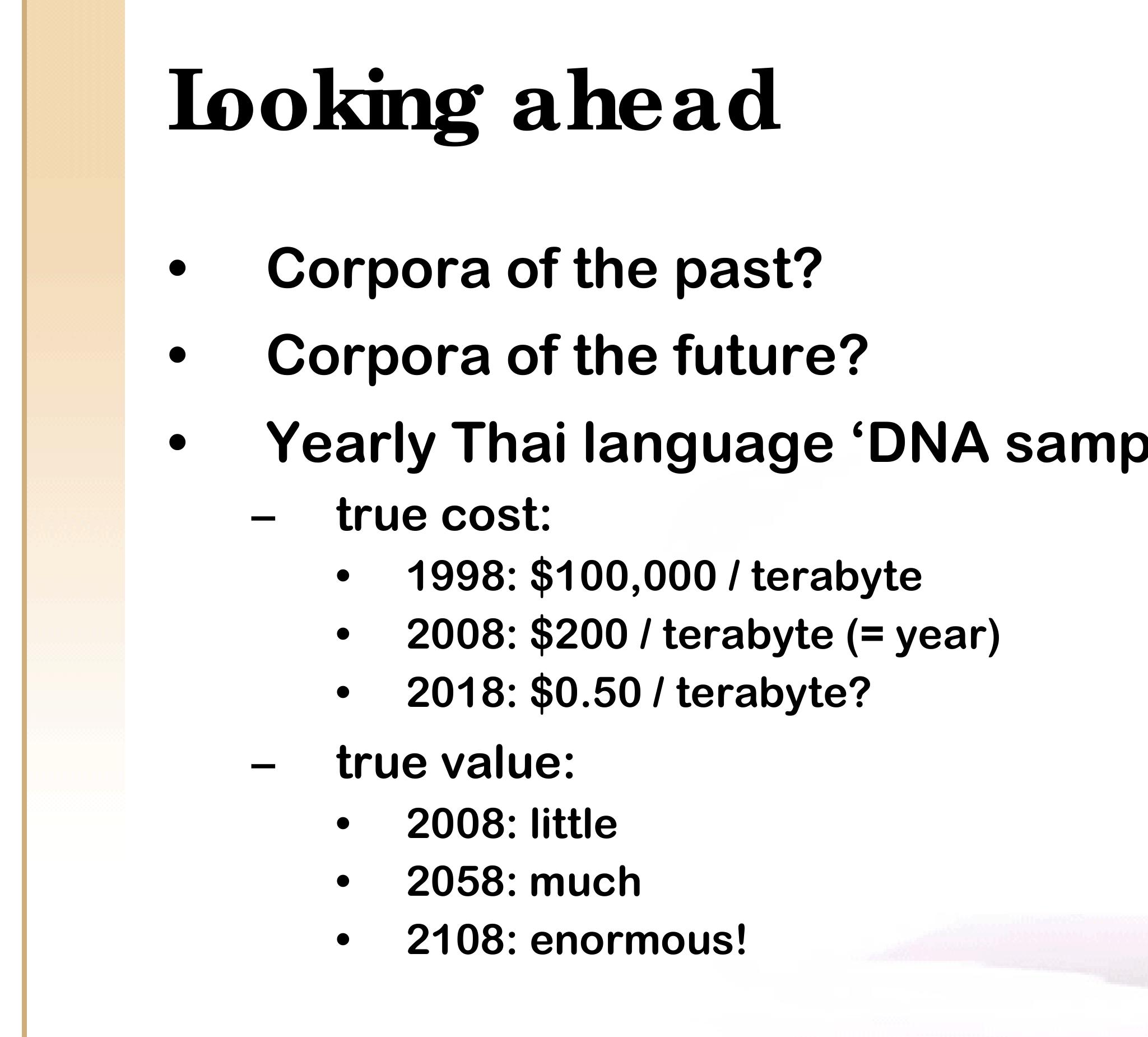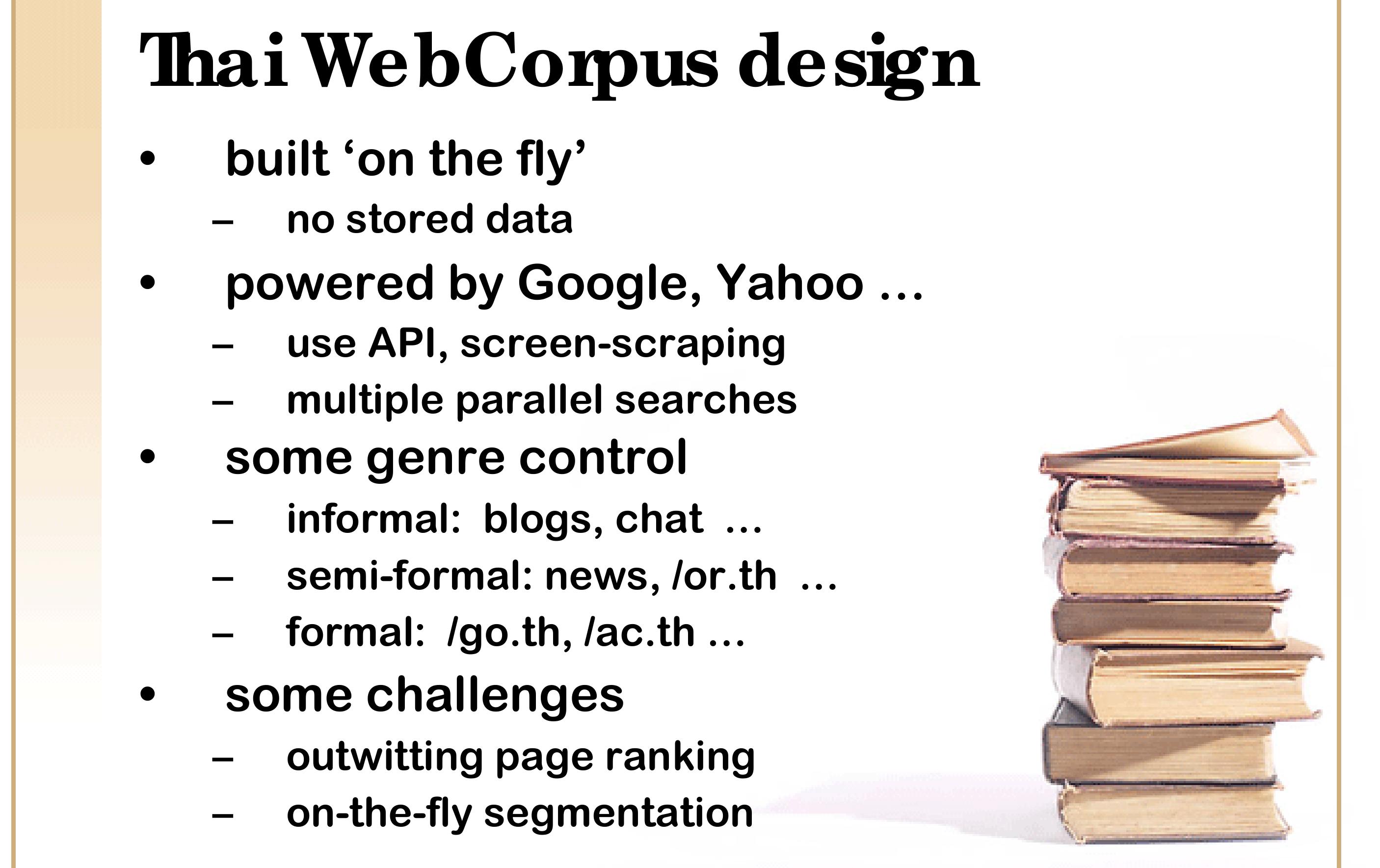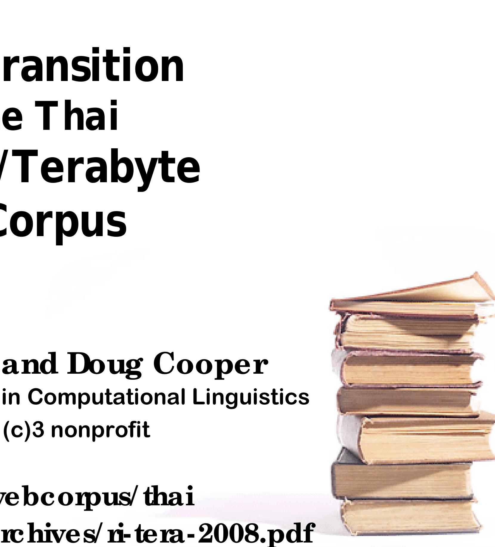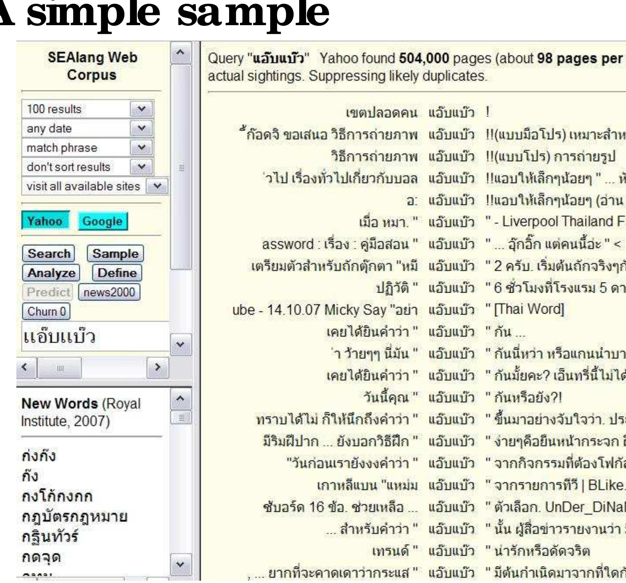 It is only within the past few years, however, that we are able to observe the transition of Thai in progress via the Internet. We estimate that at the end of 2007, roughly 100 million Thai-language Web pages have been indexed by the major search engines (based on counts of the extremely common word ที่). A conservative estimate of 1,000 Thai characters per page implies that this Web corpus includes some 100 billion characters, or more than 25 billion words. Thus, we are already able to consult a gigaword corpus 25 times over, and can anticipate access to a terabyte corpus within a few years.