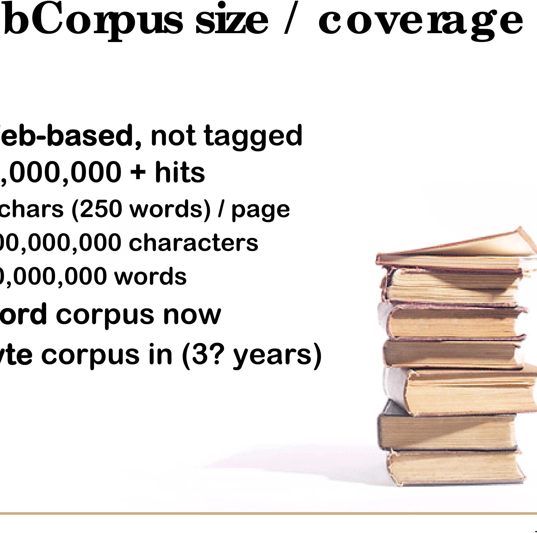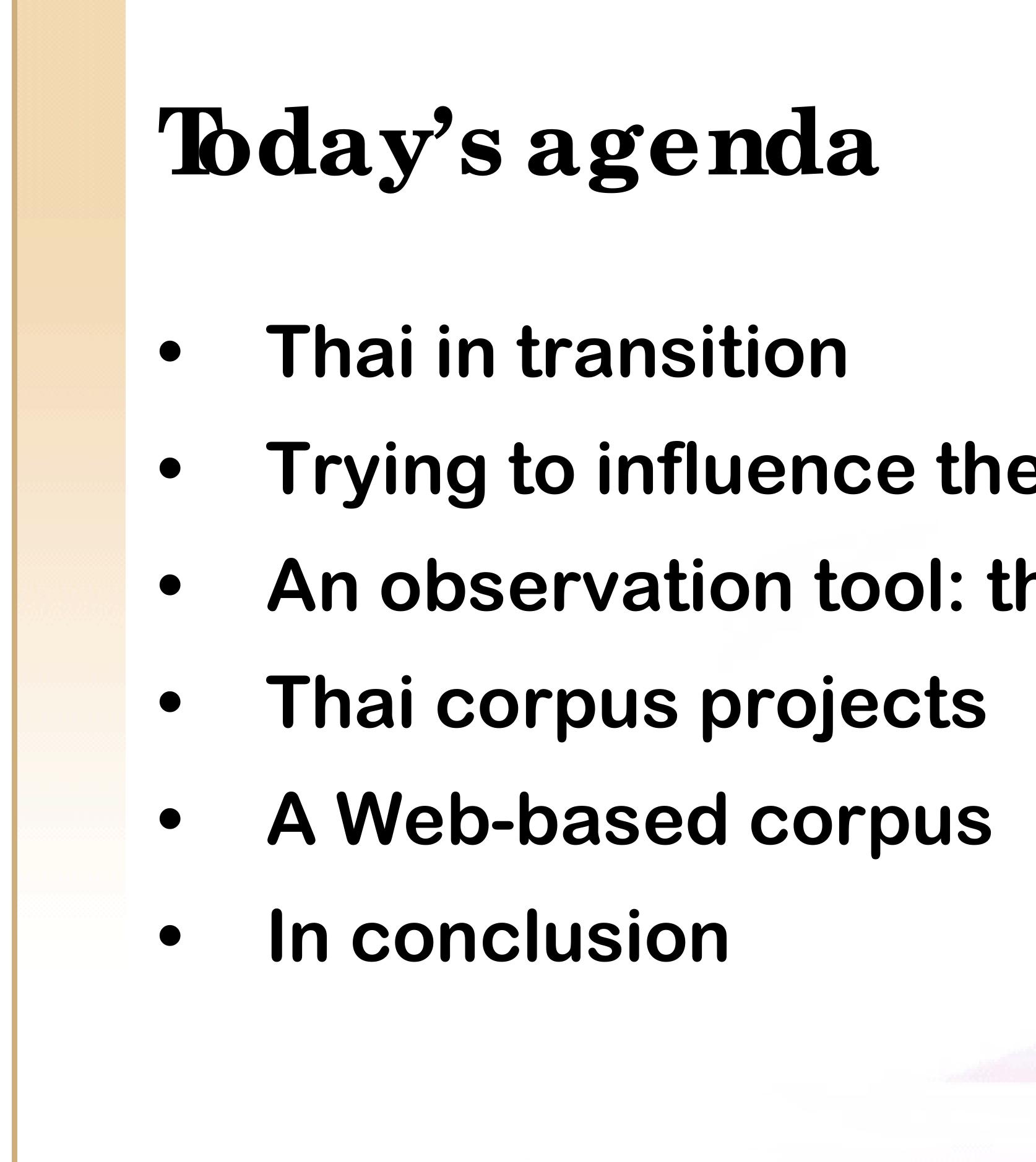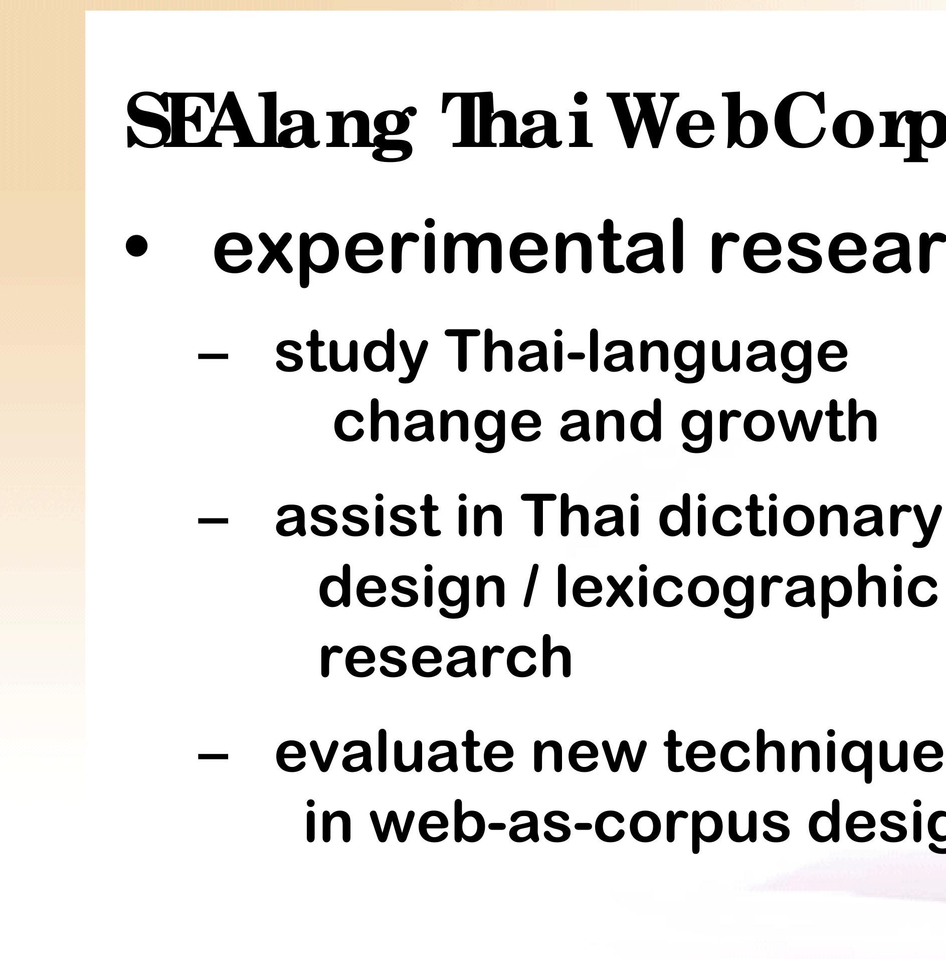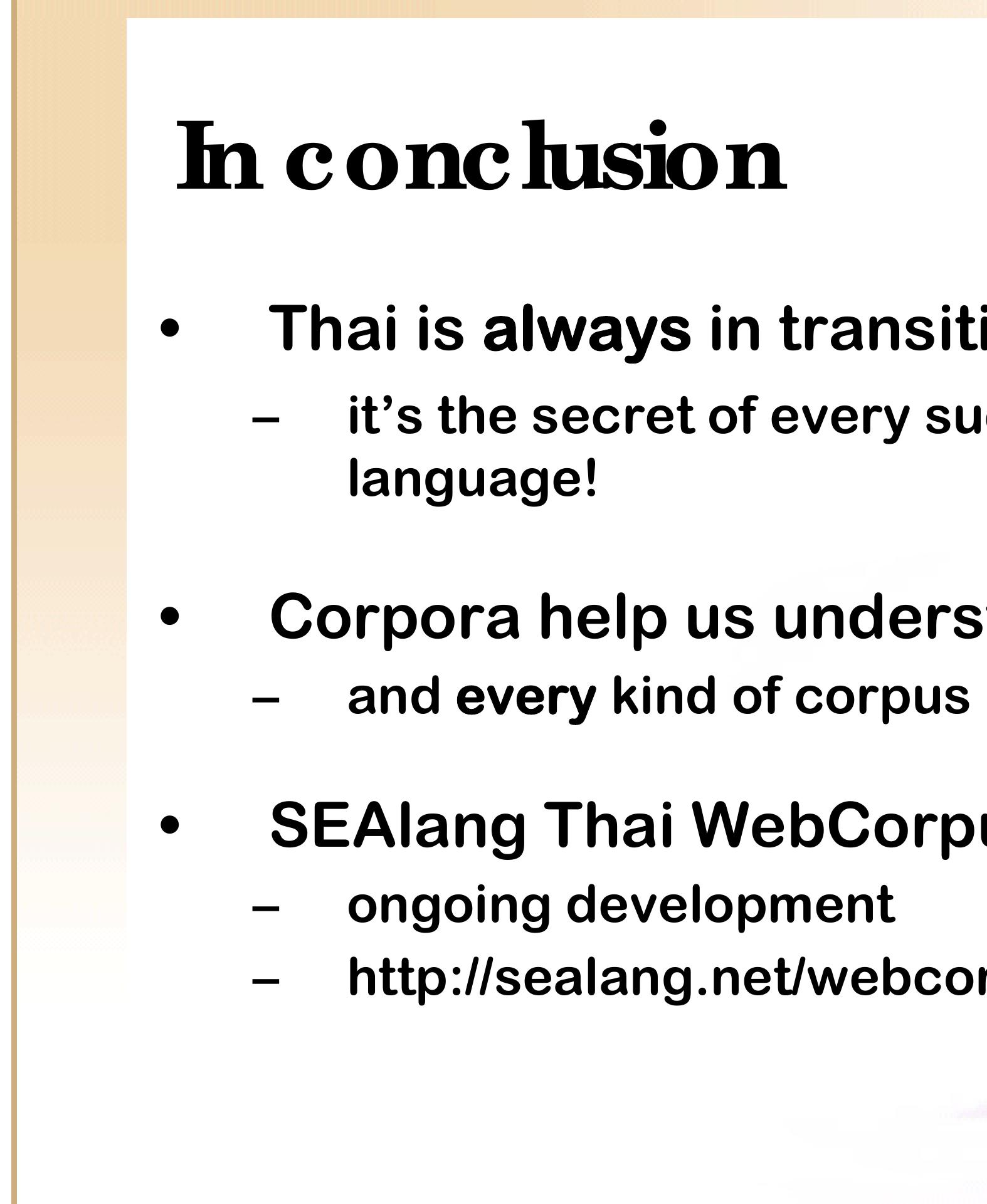 It is only within the past few years, however, that we are able to observe the transition of Thai in progress via the Internet. We estimate that at the end of 2007, roughly 100 million Thai-language Web pages have been indexed by the major search engines (based on counts of the extremely common word ที่). A conservative estimate of 1,000 Thai characters per page implies that this Web corpus includes some 100 billion characters, or more than 25 billion words. Thus, we are already able to consult a gigaword corpus 25 times over, and can anticipate access to a terabyte corpus within a few years.