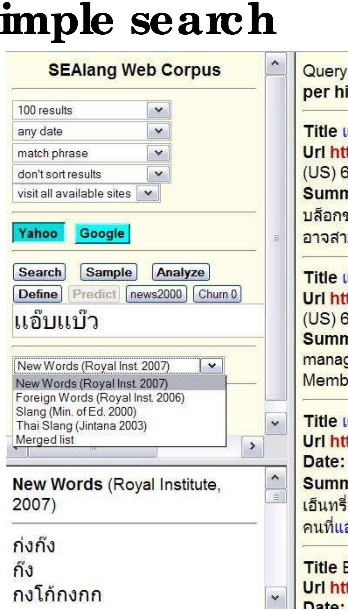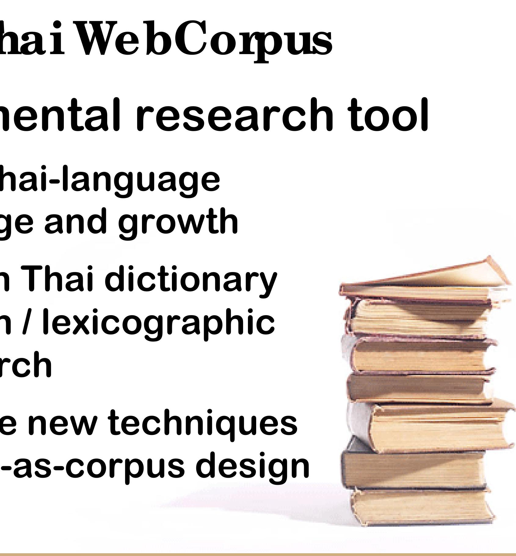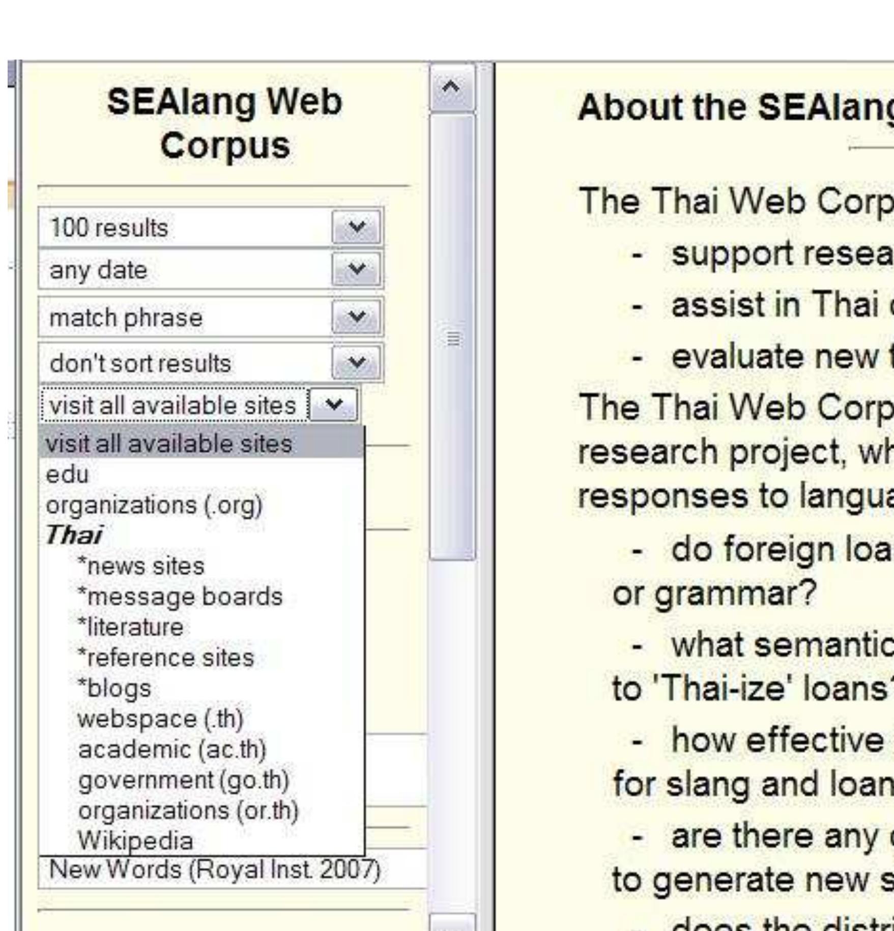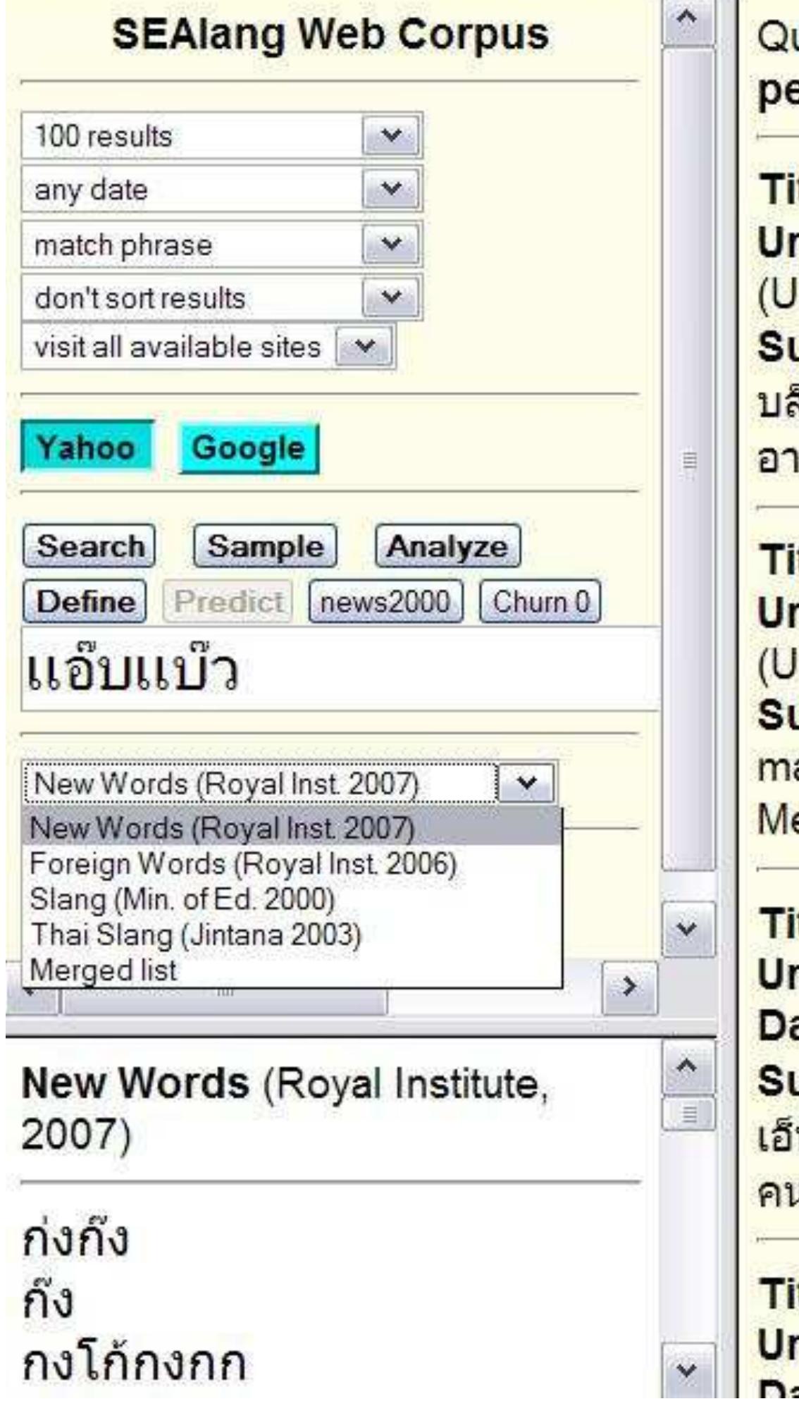 This paper discusses the Thai Web Corpus, part of a suite of tools and lexical resources for Southeast Asian language study. We describe its design and operation, and show how it is used to explore two new works by the Royal Institute: the Dictionary of New Words (2006), and Foreign Words that Can be Replaced with Thai Words (2007).
