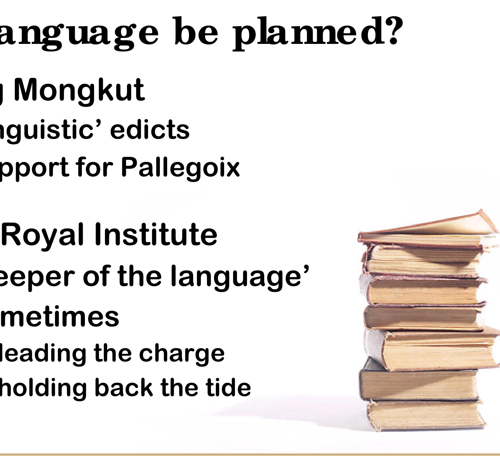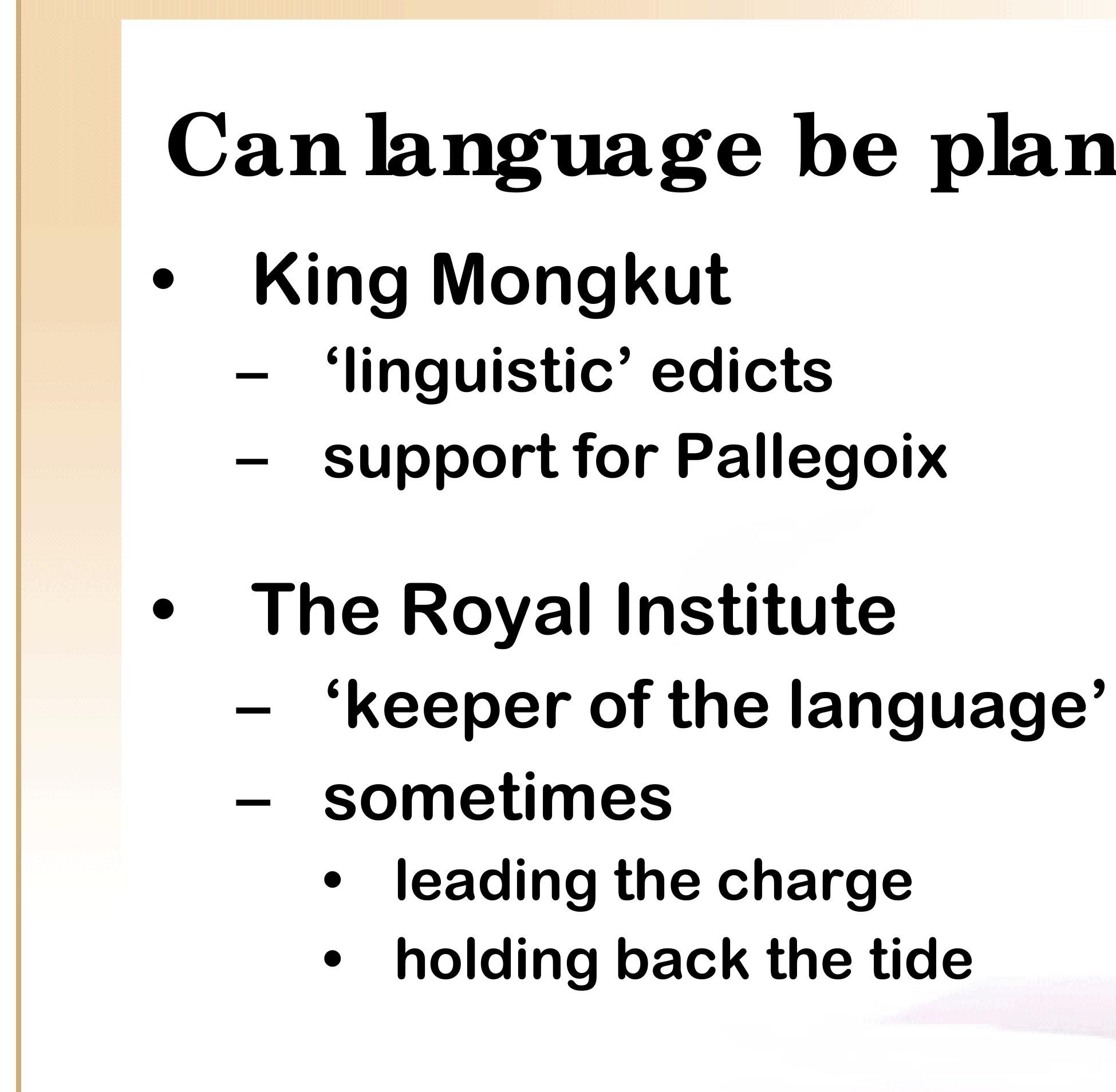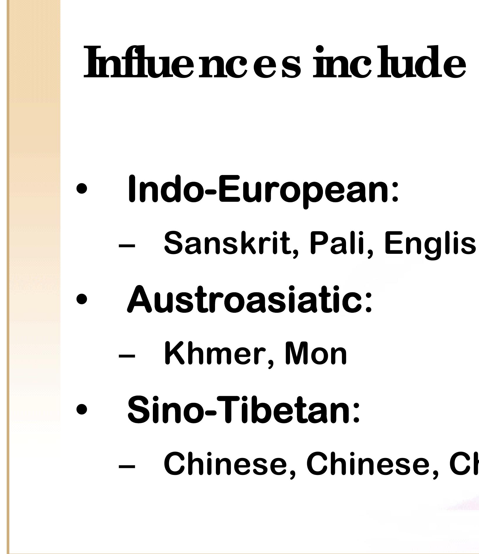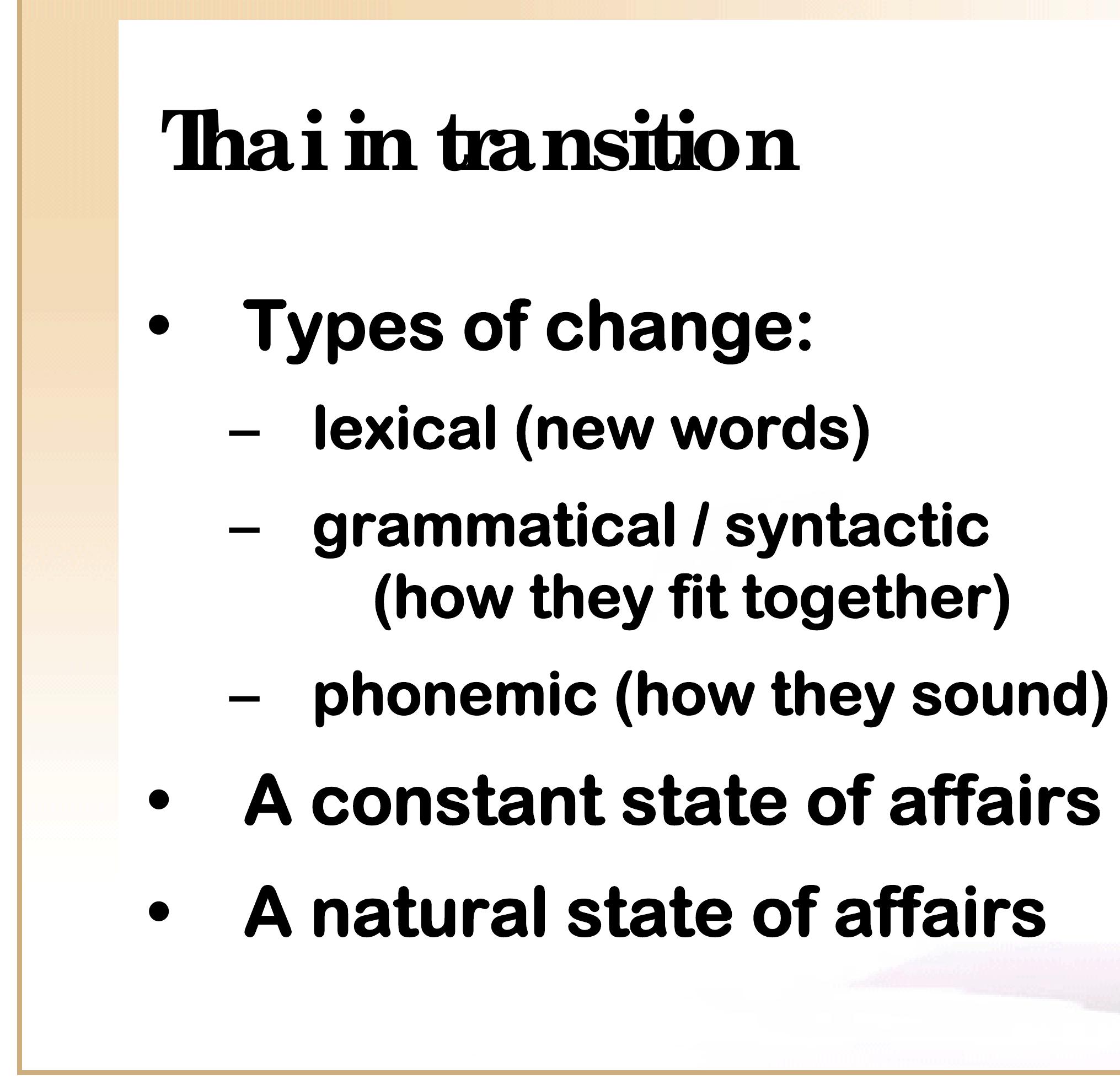 The Thai language has always been in transition; the result of both external influence and intern... more The Thai language has always been in transition; the result of both external influence and internal innovation. English influence is only the most recent in a long line; over the past 1,000 years, Chinese, Khmer, Mon, Sanskrit, and Pali have all left substantial marks on the language. Thai has changed internally as well, with new patterns of nominalization, use and intent of passive forms, and innovations in the form of classifiers all appearing in the last century or two. These changes are sometimes prescriptive, as in the ‘linguistic’ edicts promulgated by King Mongkut, and in the work of the Royal Institute’s word-coining committee. But they are also entirely spontaneous; created by the tongues and hands of more than 60 million Thai speakers and writers.