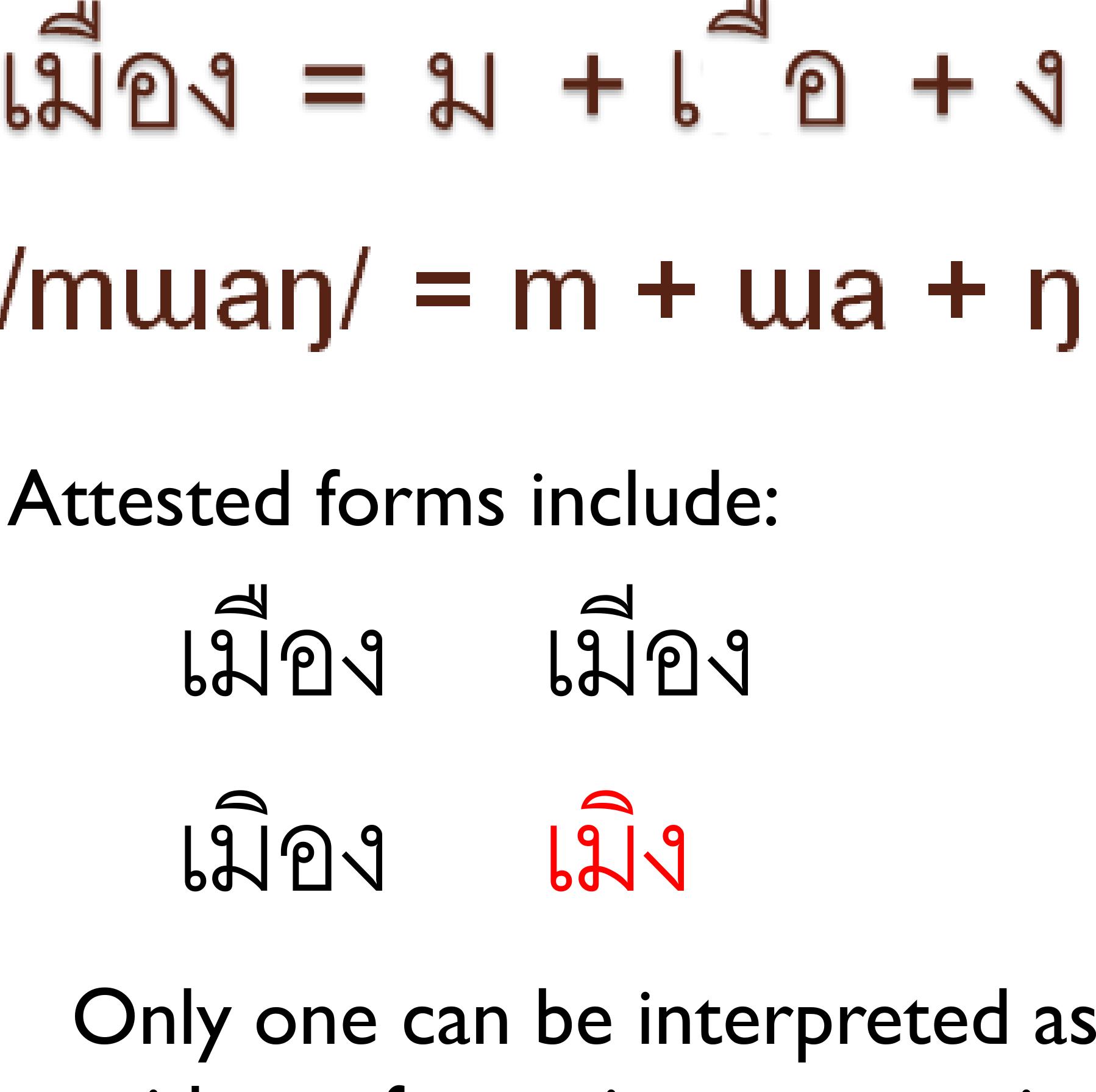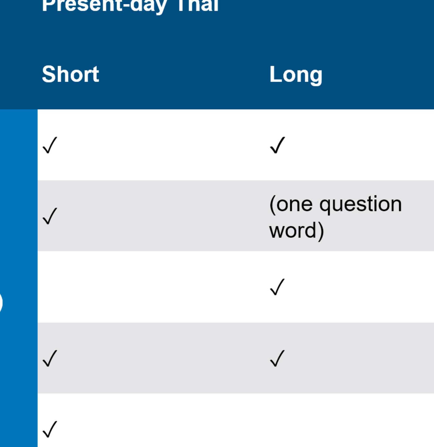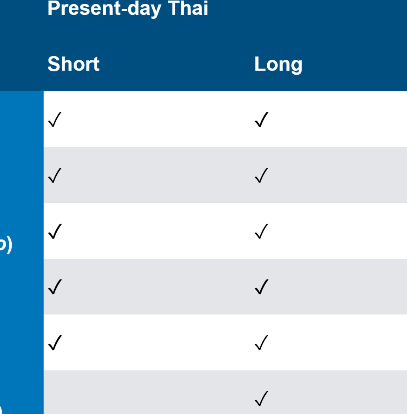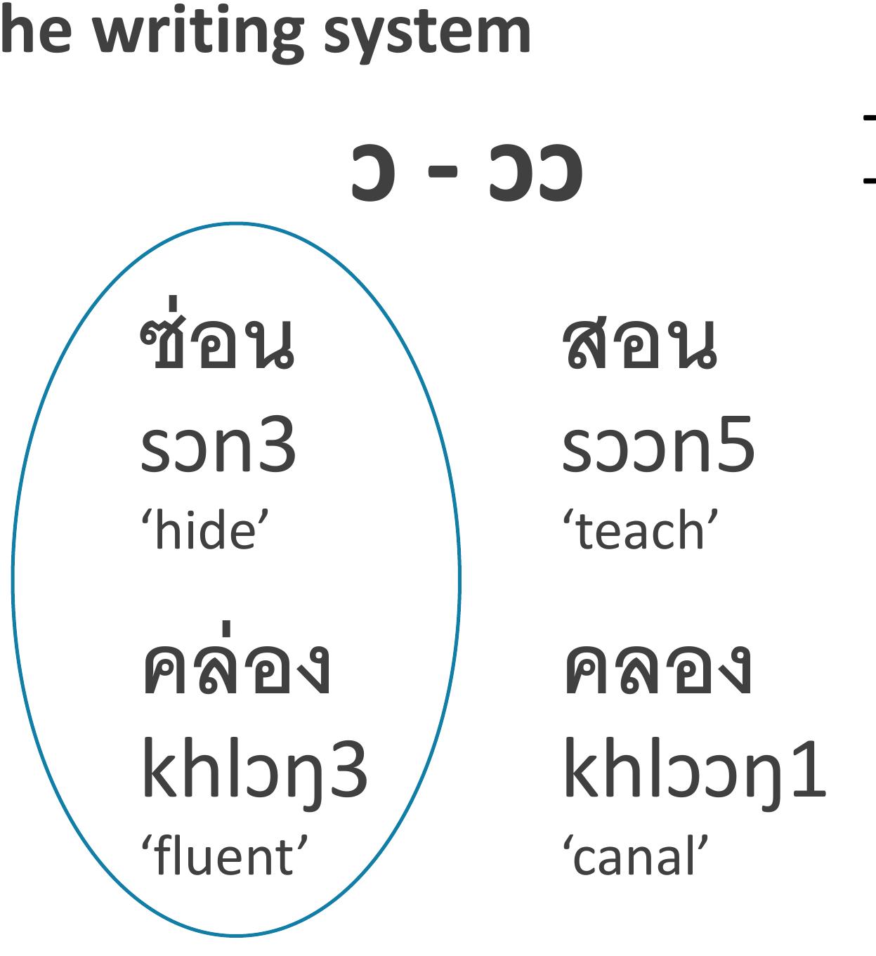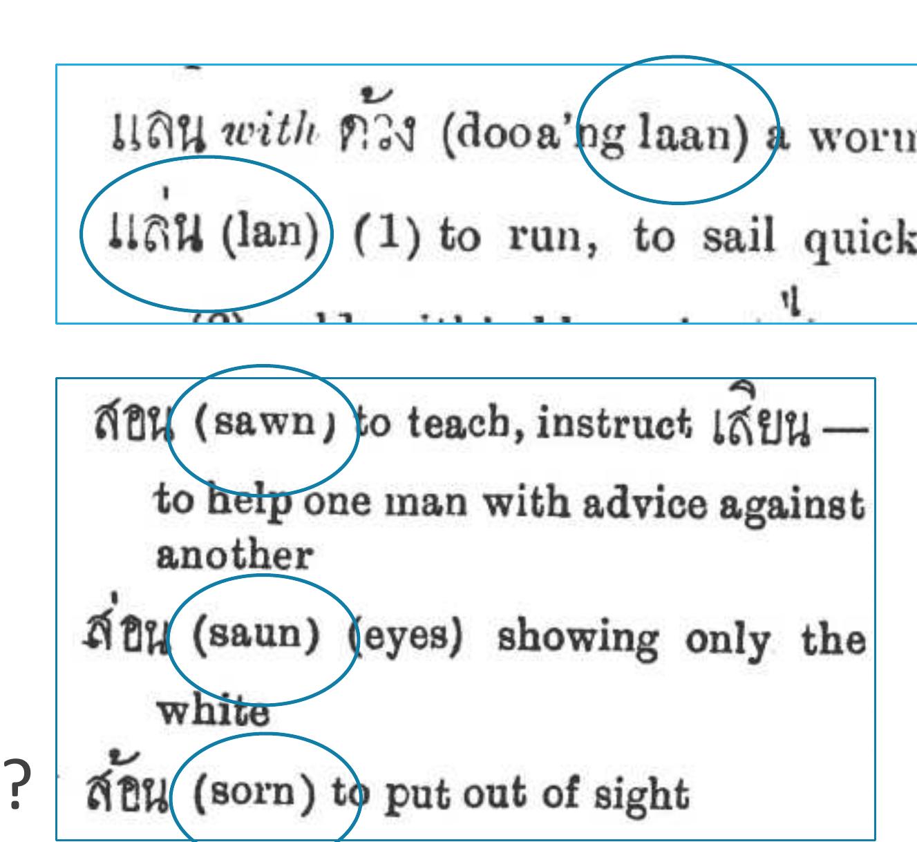 From Haas (1964) we can establish that at some point prior to the publication of that dictionary,... more From Haas (1964) we can establish that at some point prior to the publication of that dictionary, length contrast had emerged in the vowels แ- /æ/ and -อ /ɔ/ that the Thai script had not, and still has not, fully adapted to reflect. One of the dictionary’s useful innovations is the careful recording in IPA of a phonemic rendition of each word, regardless of its spelling in Thai script. Words whose pronunciation differ from that expected by their spelling are marked with an asterisk, to draw attention to their unexpected pronunciation and confirm that they are not typographic errors (Haas 1964: xxv). Entries thus marked include both unexpected long vowels, as in เช้า /cháaw/ ‘morning’, and unexpected short vowels, as in แล่น /læ̂n/ ‘to run’.