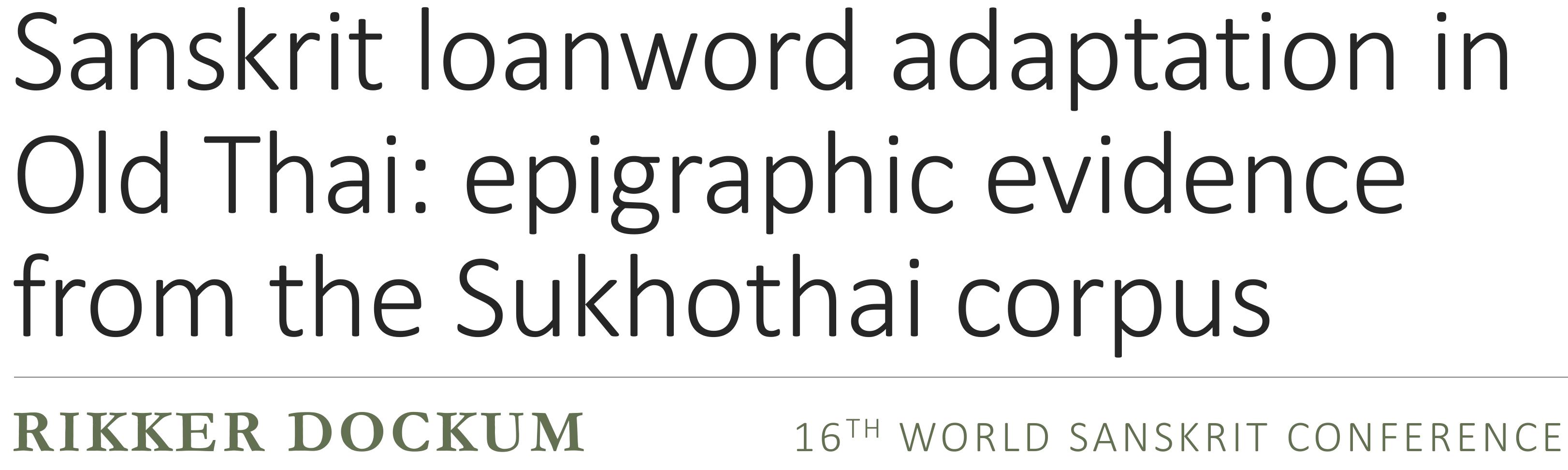 Sanskrit loanwords in the Sukhothai corpus provide an untapped source of linguistic evidence into the influence of Sanskrit in a transitional period of Southeast Asian history. As the neighboring Khmer empire was gradually undergoing a change in religion, a parallel shift in linguistic influence was also taking place throughout Southeast Asia, from the Sanskrit of Hinduism to the Pali of Buddhism. The Sukhothai texts offer us a glimpse into this changing world, through the window of these Sanskrit loanwords.