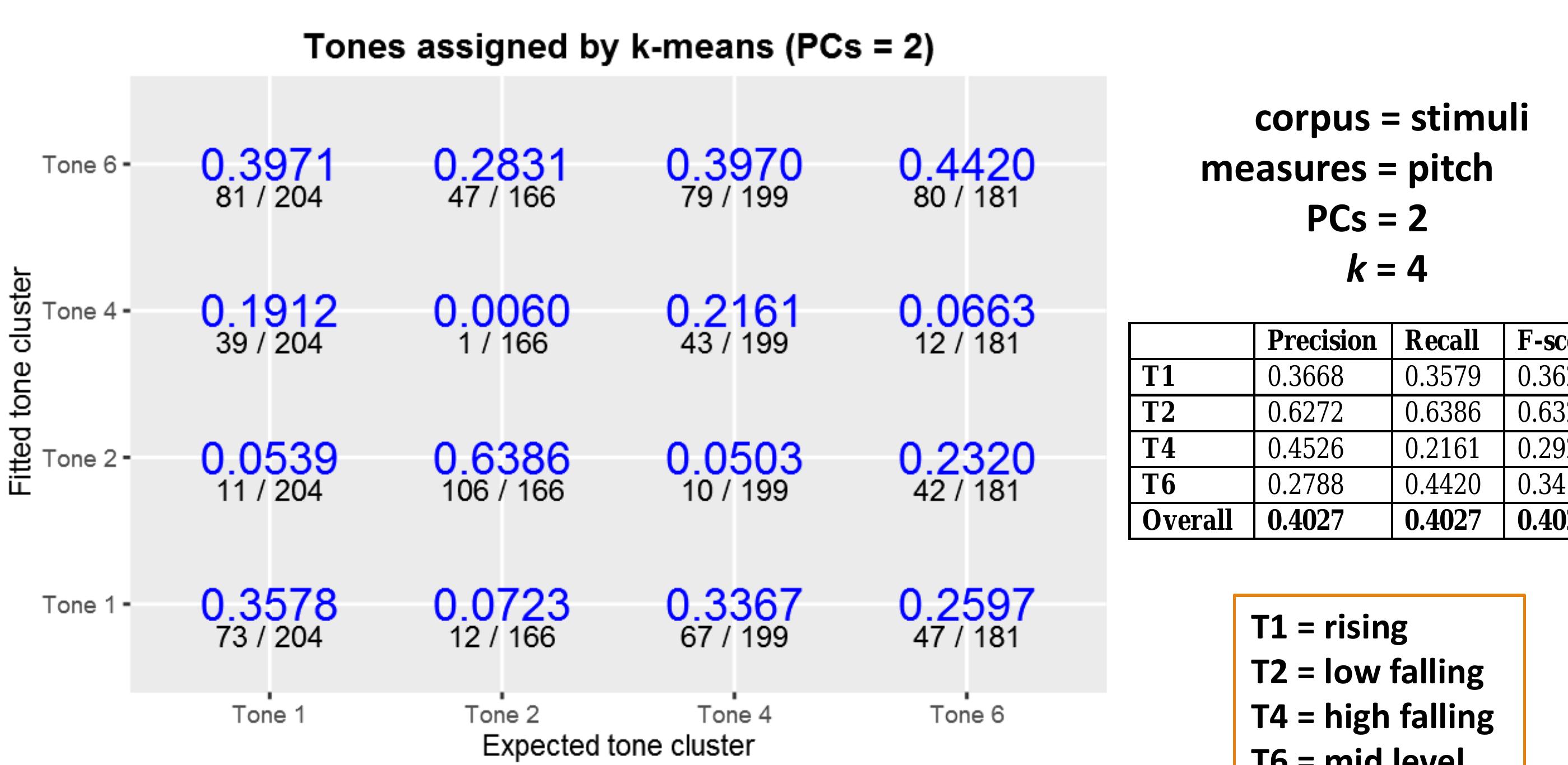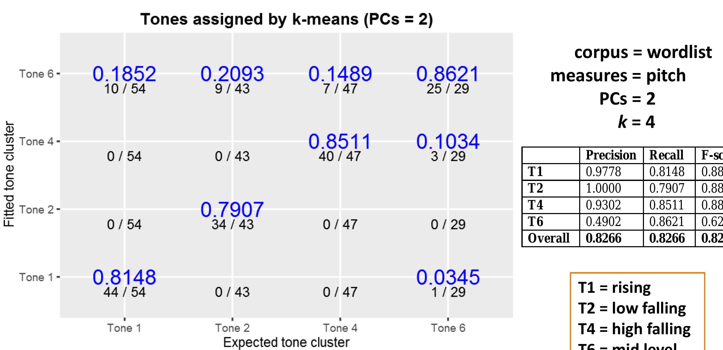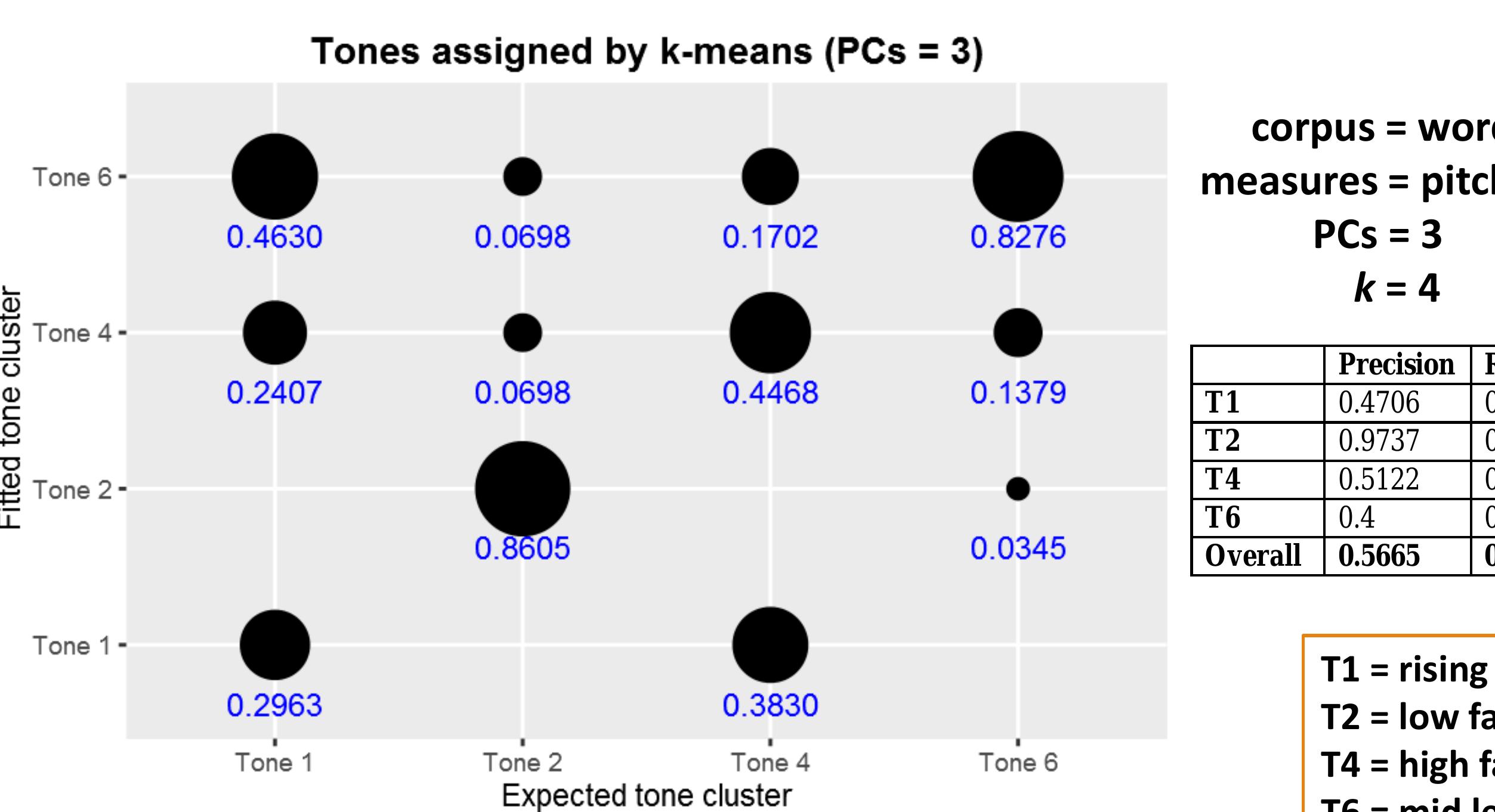 Results such as these motivate the expanded use of computational methods in comparison with traditional methods. This study implements and expands on methods outlined in Shosted et al (2014), and applies them to Chindwin Khamti, a variety of Khamti [kht] spoken in Khamti District, Sagaing Region, Burma. Khamti tones were manually segmented and extracted, and then modeled using principal components analysis (Johnson 2008:95) and k-means clustering in R (R Core Team 2015). This paper compares the results of this modeling against the author’s earlier work assigning tone categories using traditional methods of researcher audition and instrumental analysis, in consultation with native informants.