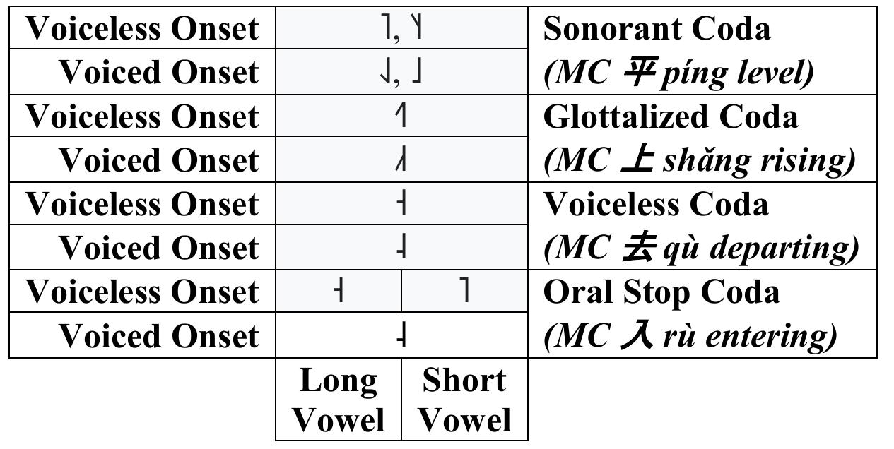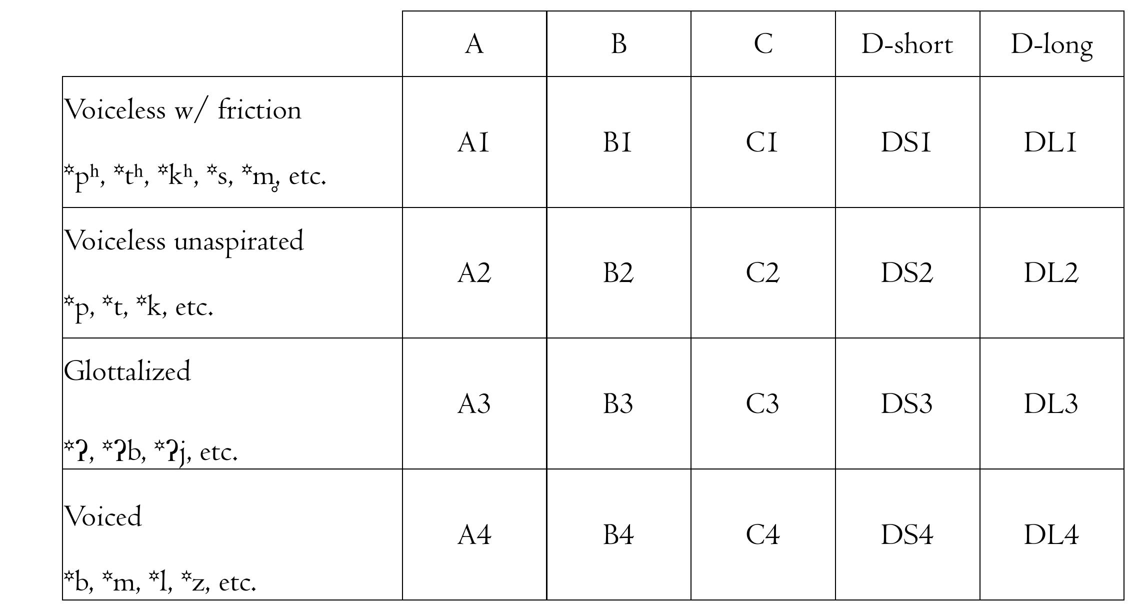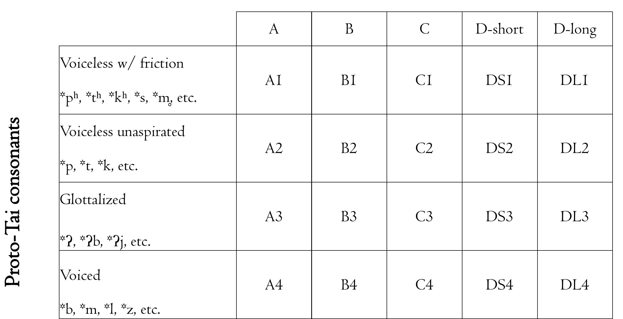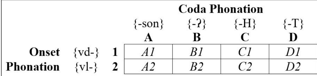 The notion of the dialexical set is inspired by insights from two distinct comparative traditions: English lexical sets (Wells 1982) and Tai tone boxes (Gedney 1972). Wellsian lexical sets are ‘large groups of words which tend to share the same vowel’ and represented by a keyword. For example, the set KIT comprises ‘those words whose form in the two standard accents [RP and General American English] has the stressed vowel /ɪ/’ (1982:127). While not an explicitly diachronic concept, lexical sets neatly reflect and reveal sound changes in the many varieties of English across the globe. Tai tone boxes, on the other hand, group etyma based on shared segmental environments that conditioned modern tone categories (e.g. voiced vs. voiceless proto-onsets). Each cell represents some combination of proto-tone and natural class of proto-onsets; it comprises a set of etyma that pattern together tonally across the set of Tai lects. Reflexes of these etyma share a modern tone in a given Tai language, regardless of subsequent changes to onsets.