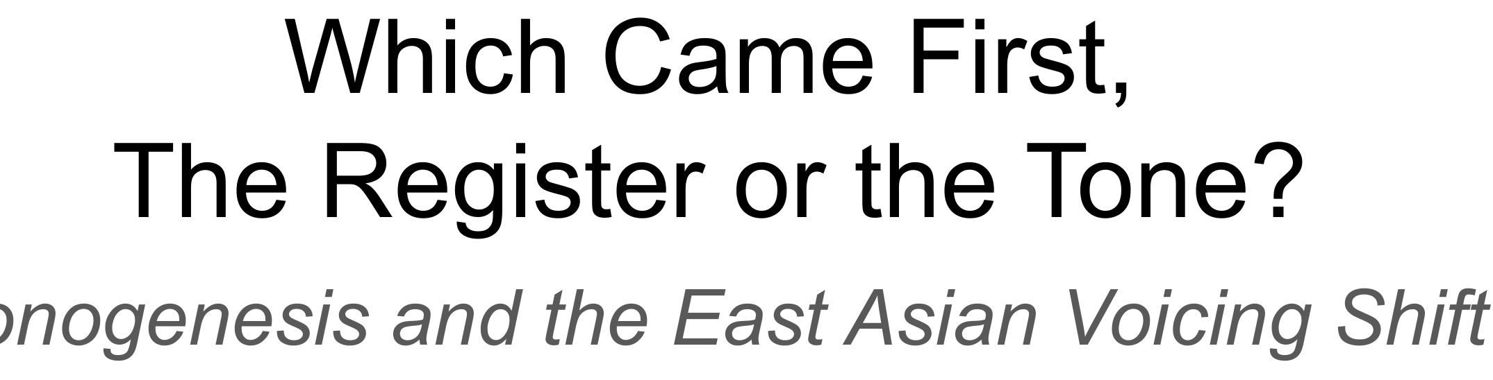 One such proposal is the concept of the East Asian Voicing Shift (EAVS), a massively crosslinguistic transphonologization of onset voicing contrasts as tones or registers that spread across GMSEA over the past millennium (Dockum 2019, Dockum & Gehrmann 2021). EAVS is integral to the received models of both tonogenesis and registrogenesis (Haudricourt 1954, Huffman 1976), but the question remains: why should EAVS produce clearly suprasegmental contrasts cued by pitch and voice quality (i.e. tones) in some languages and debatably suprasegmental contrasts cued by vowel quality and voice quality (i.e. registers) in others? We present two hypotheses here to address this question.