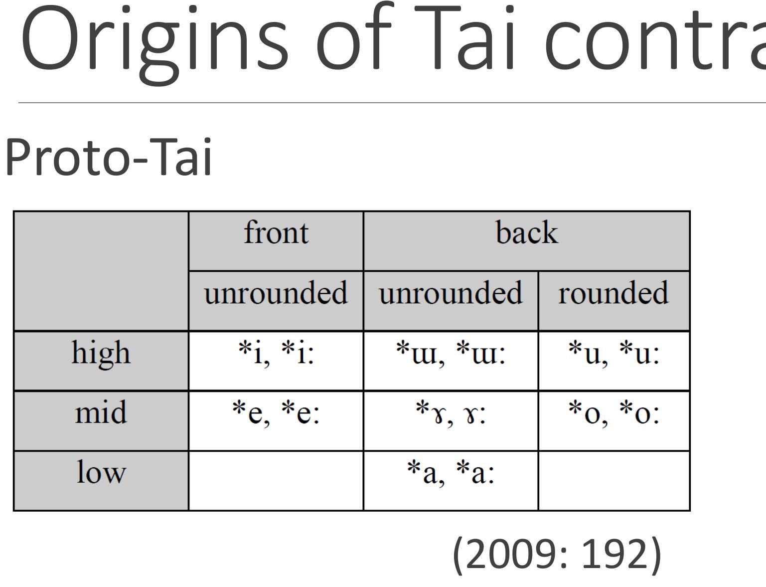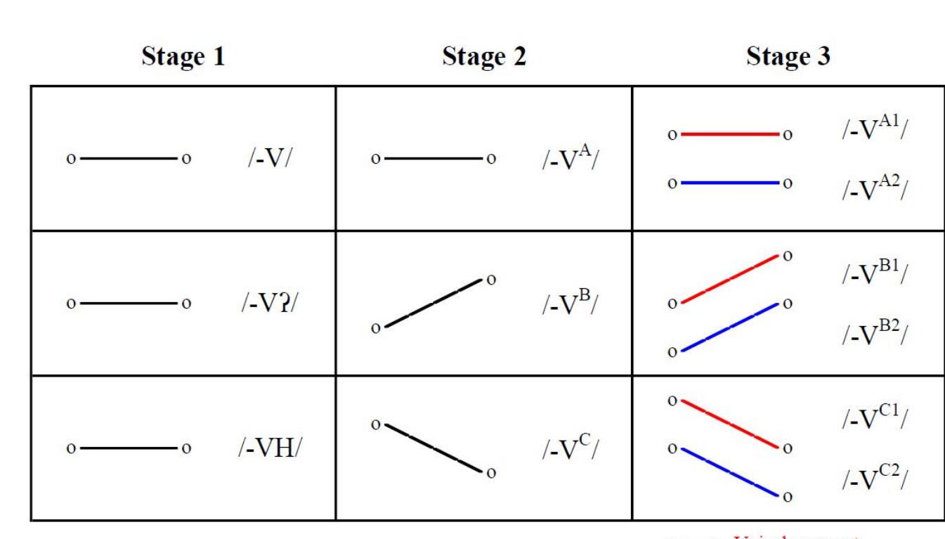 The Sequential Interpretation builds on the conventional explanations (Haudricourt 1965, Matisoff 1973) and predicts two outcomes when a language undergoes EAVS, depending on their suprasegmental typology: (1) If the language is non-tonal, it will become registral, but (2) if it has already developed tones under conditioning from historical coda laryngeal contrasts, it will undergo tone splits (cf. the ‘Great Tone Split’; Brown 1975). Thus, it is the relative historical ordering of EAVS with respect to tonogenetic events that determines the output.