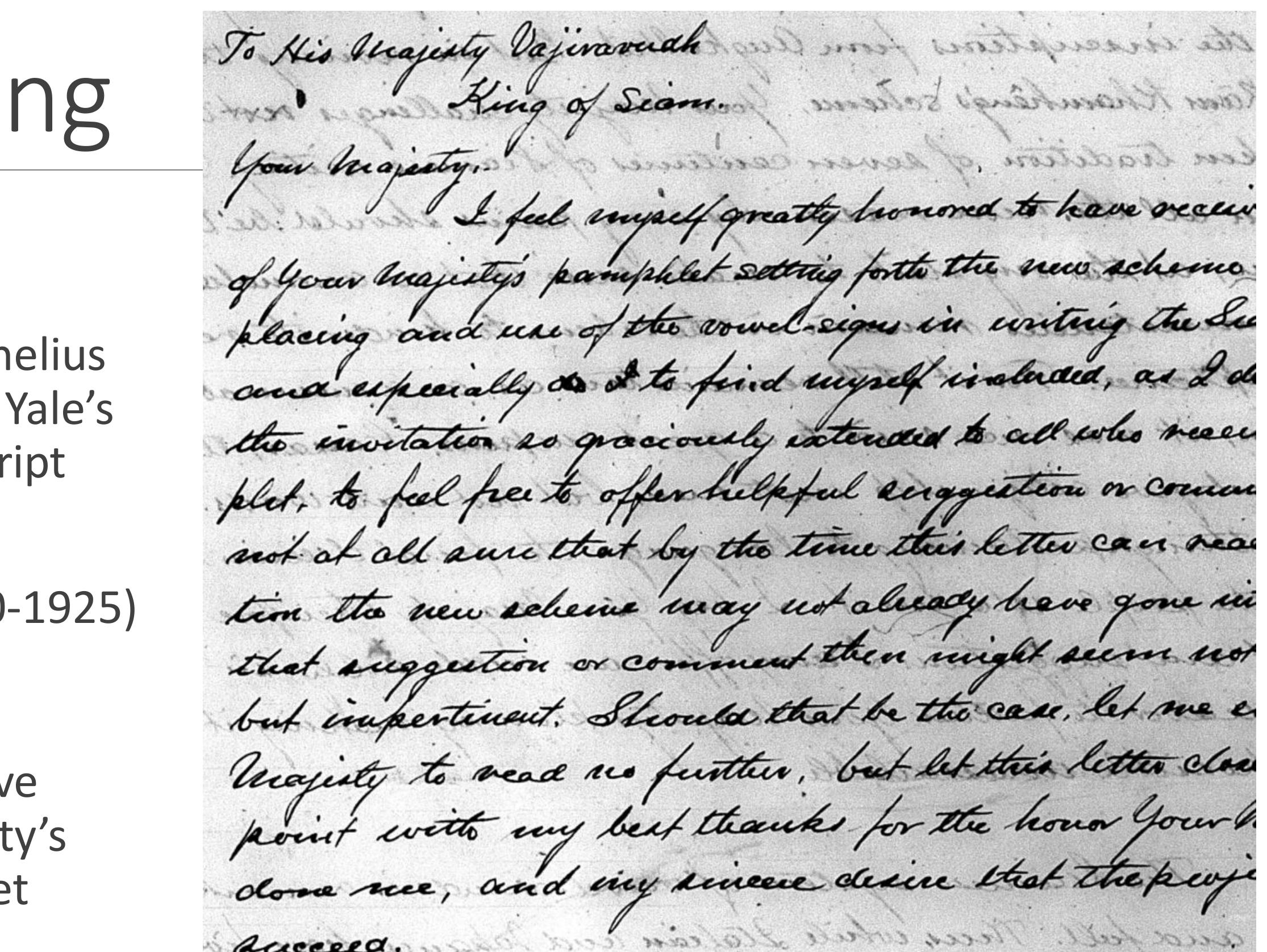 In 2005 a brief entry in an unpublished handlist from the British Museum Library was revealed to ... more In 2005 a brief entry in an unpublished handlist from the British Museum Library was revealed to be a hand-written Thai-English dictionary dating from the first half of the nineteenth century. On inspection, the microfilmed manuscript of “Or. 11828, 256 ff” yielded an extensive dictionary of nearly 10,000 entries, arranged in an authentic Thai alphabetical order not seen again until the publication of Dan Beach Bradley’s 1873 monolingual dictionary. The microfilm continued with what appeared to be an early draft of Rev. J. Caswell’s Treatise on the Tones of the Siamese Language, written in possibly the same hand.