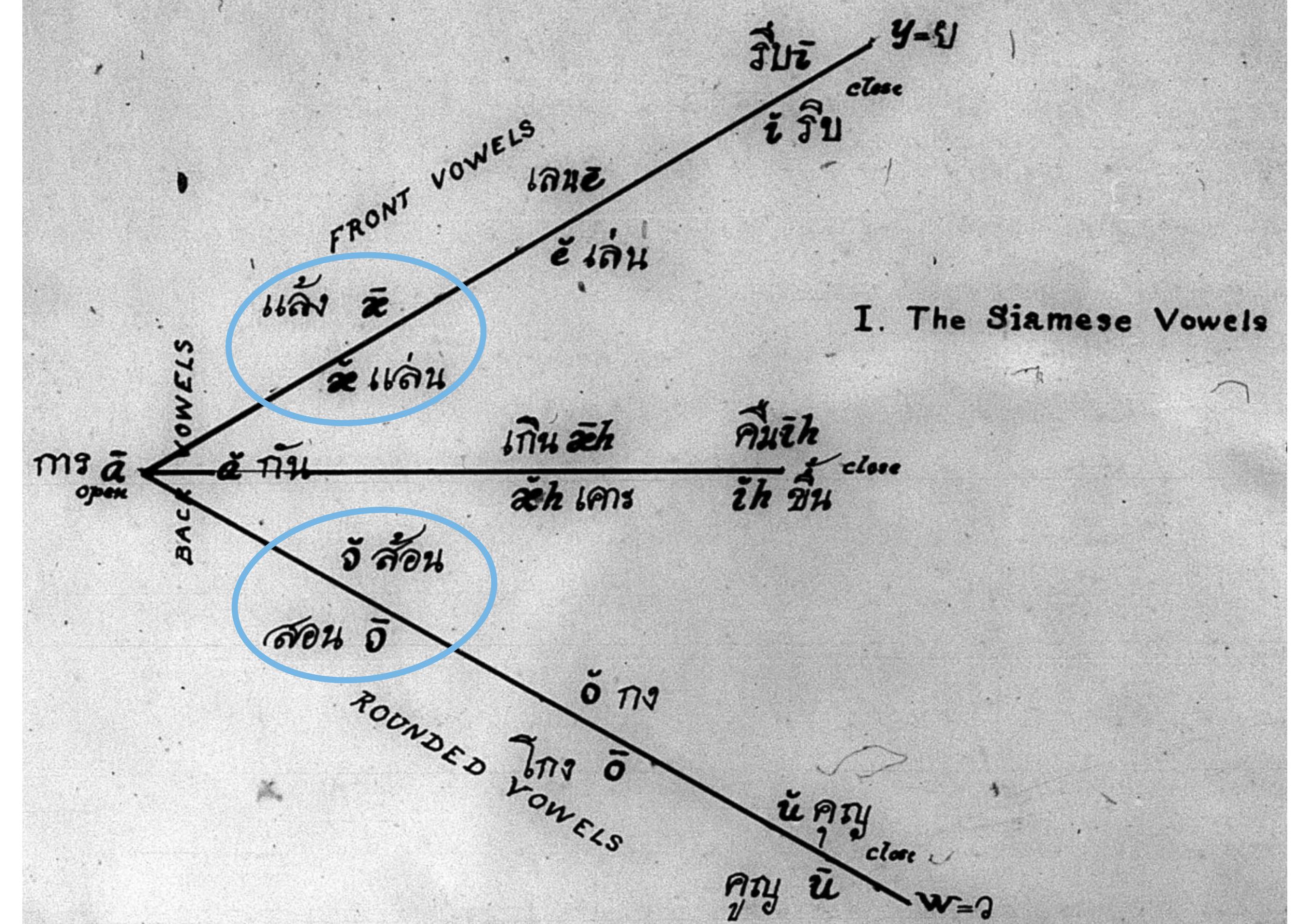 New textual evidence indicates a much earlier emergence of these contrasts. In a 1917 letter, Cornelius Beach Bradley wrote to His Majesty Vajiravudh of Siam, King Rama VI, to provide constructive feedback on proposed modifications to the Thai script, changes which in the end never saw wide adoption. One of the critiques Bradley offers is that the new system fails to capture all of the vowel length contrasts in Thai. This represents the earliest known explicit documentation of these as phonemic contrasts. Bradley also includes a hand-drawn diagram of the vowel phonemes in Thai, clearly indicating contrasts in both vowels, with example words (Figure 1). A second piece of previously overlooked evidence comes from Michell (1892). Although not clearly explained in the frontmatter, this dictionary also appears to indicate with some regularity short vowels in the same places they are found in modern Thai, through the use of <a> instead of <aa> in its quasi-phonemic romanized pronunciation guides (Figure 2).