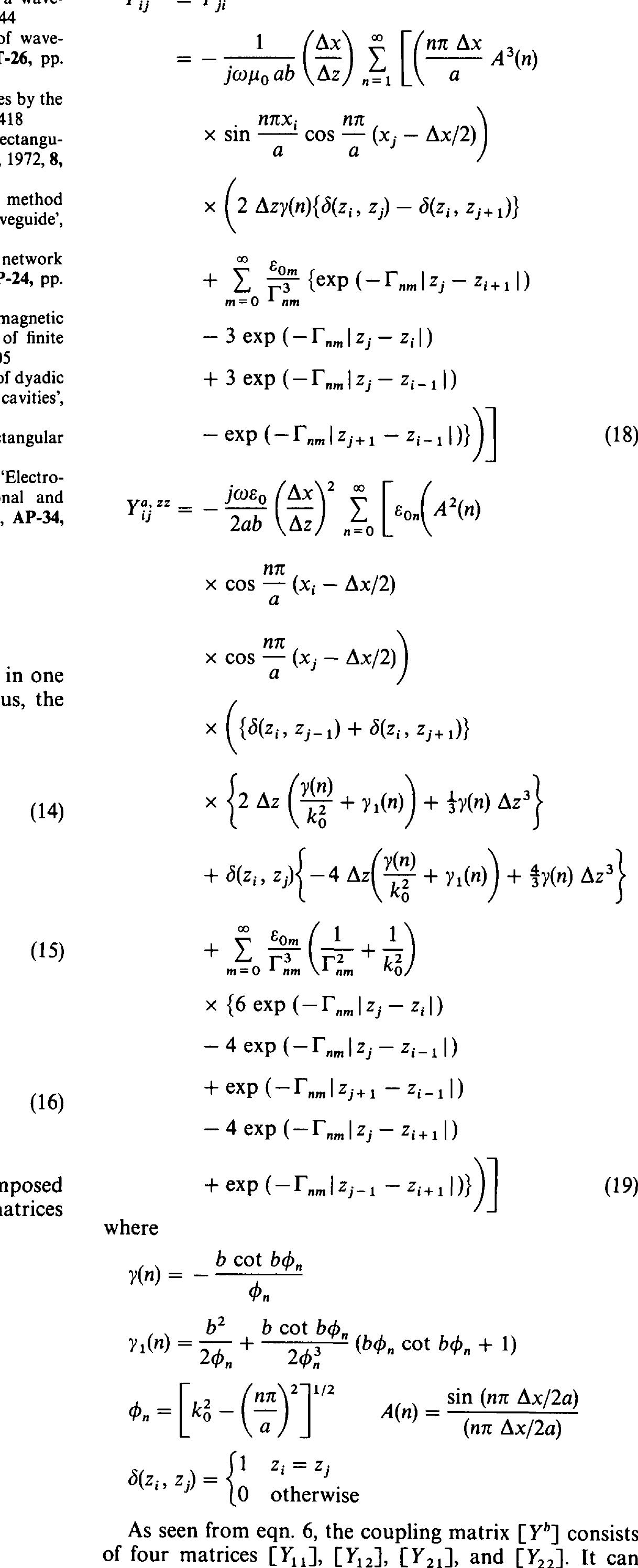 The paper considers the general problem of a waveguide coupled to an arbitrary region via a recta... more The paper considers the general problem of a waveguide coupled to an arbitrary region via a rectangular aperture of arbitrary dimensions in the thick common broad wall. An equivalence theorem is utilized to set up a pair of operator equations which are then reduced to matrix form using the method of moments. It is shown that only a part of the moment matrix needs to be recalculated for coupling to different regions. The basic procedure has been illustrated by considering the example of two identical waveguides coupled through an aperture in the common broad wall. further, a large number of subsections being needed to reasonably approximate the aperture field distribution. In order to reduce the computational effort, Lyon and Sangster [13] have utilised sinusoidal basis functions in their study of radiating slots. However, in both the methods the problems of longitudinal and transverse slots have to be analysed separately and, also, the effect of finite slot width is ignored. In this paper, we present an alternative moment procedure which is based upon the generalised network formulation for aperture problems [14] and can deal with slots of arbitrary dimensions. It is suggested that this formulation can form a basis for the generation of a common computer code to analyse a broad catagory of waveguide coupling problems.