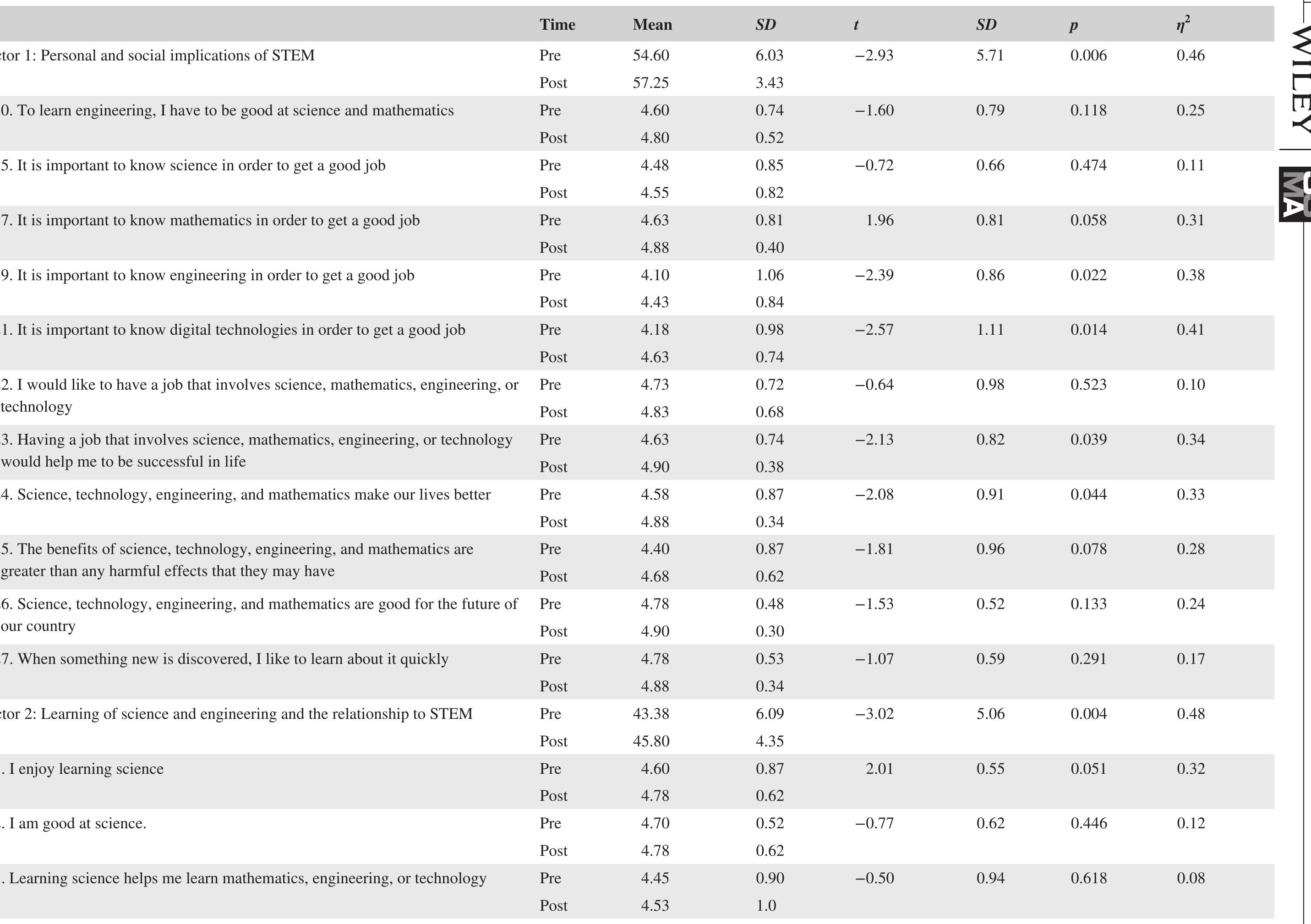 There is an increasing awareness of out-of-school program value in enhancing student interest and... more There is an increasing awareness of out-of-school program value in enhancing student interest and understanding of science, technology, engineering, and mathematics (STEM). This study examined the impact of an out-of-school STEM education program on student attitudes toward STEM disciplines and STEM careers. A STEM education program implemented at a public research university was designed to integrate STEM disciplines with hands-on problem-based activities. Design features included authentic learning contexts, engineering design processes, and content integration. Data sources included an attitude survey and interviews conducted with forty sixth grade middle school student participants. The analysis revealed significant differences between pre and posttests on student attitudes toward personal and social implications of STEM, science and engineering learning, and their relationship to STEM. Findings showed that the program contributed to students' developing interest in STEM fields, and helped them make connections between schoolwork and daily lives. Recommendations for future research on out-of-school STEM education programs were discussed. K E Y W O R D S attitudes, mixed methods, out-of-school, STEM careers, STEM education 2 | BARAN et Al.