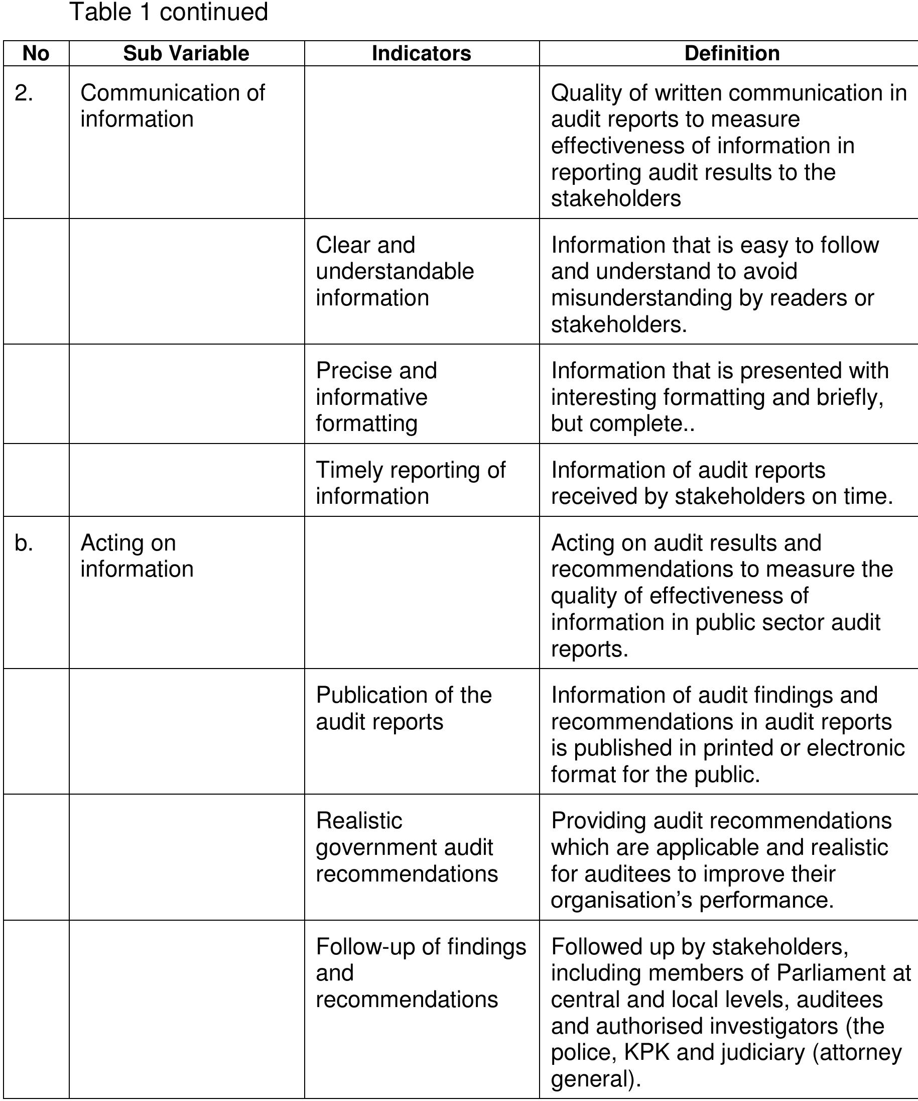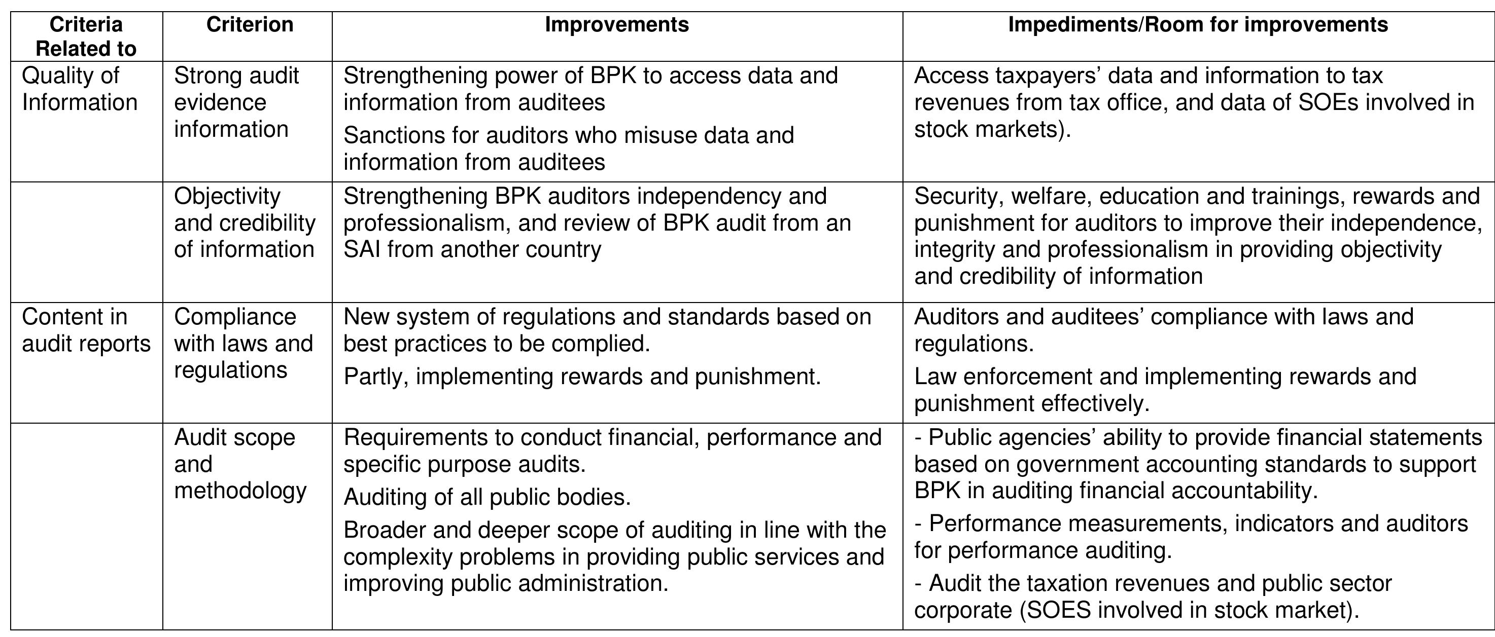 The research was undertaken through a comprehensive examination of scope of auditing on the quality of content information and the factors influencing to the quality of external public sector auditing reports that are provided by the Indonesian State Audit Institution (BPK). This study also made comparison between pre and post audit reform and applied qualitative method.