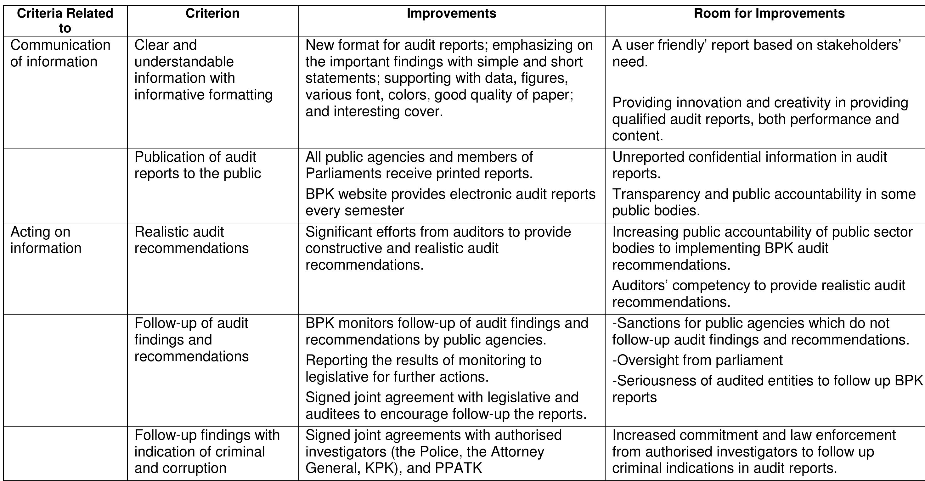 This study revealed that since reform, the media have been enthusiastic to draw public attention to audit report findings. As a result, the public has started to become aware about the importance of public sector auditing as means of saving public finances from inefficiency, ineffectiveness, fraud, money laundering and corruption. Besides, in terms of acting on the information in audit reports, this study also revealed significant changes in BPK’s publication of reports through the media and on the BPK website. Transparency builds public trust that resources are managing accountably. However, this study found ddissatisfied responses regarding publication indicated a lack of auditees’ accountability and transparency and evidence. BPK audit findings which are not reported with security and confidential reasons, and missing audit reports after arriving at BPK high levels of officials, are unacceptable to auditors and the public.