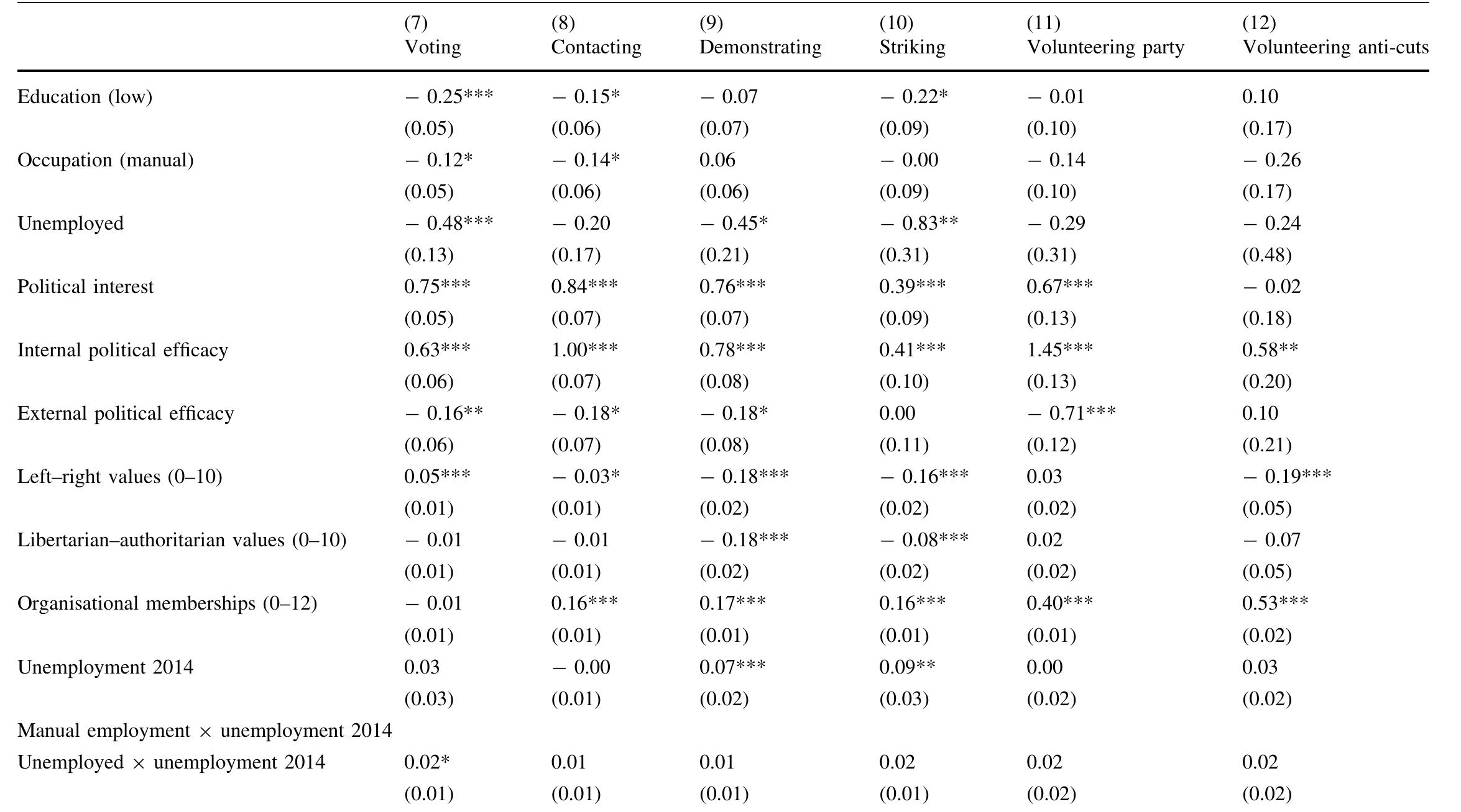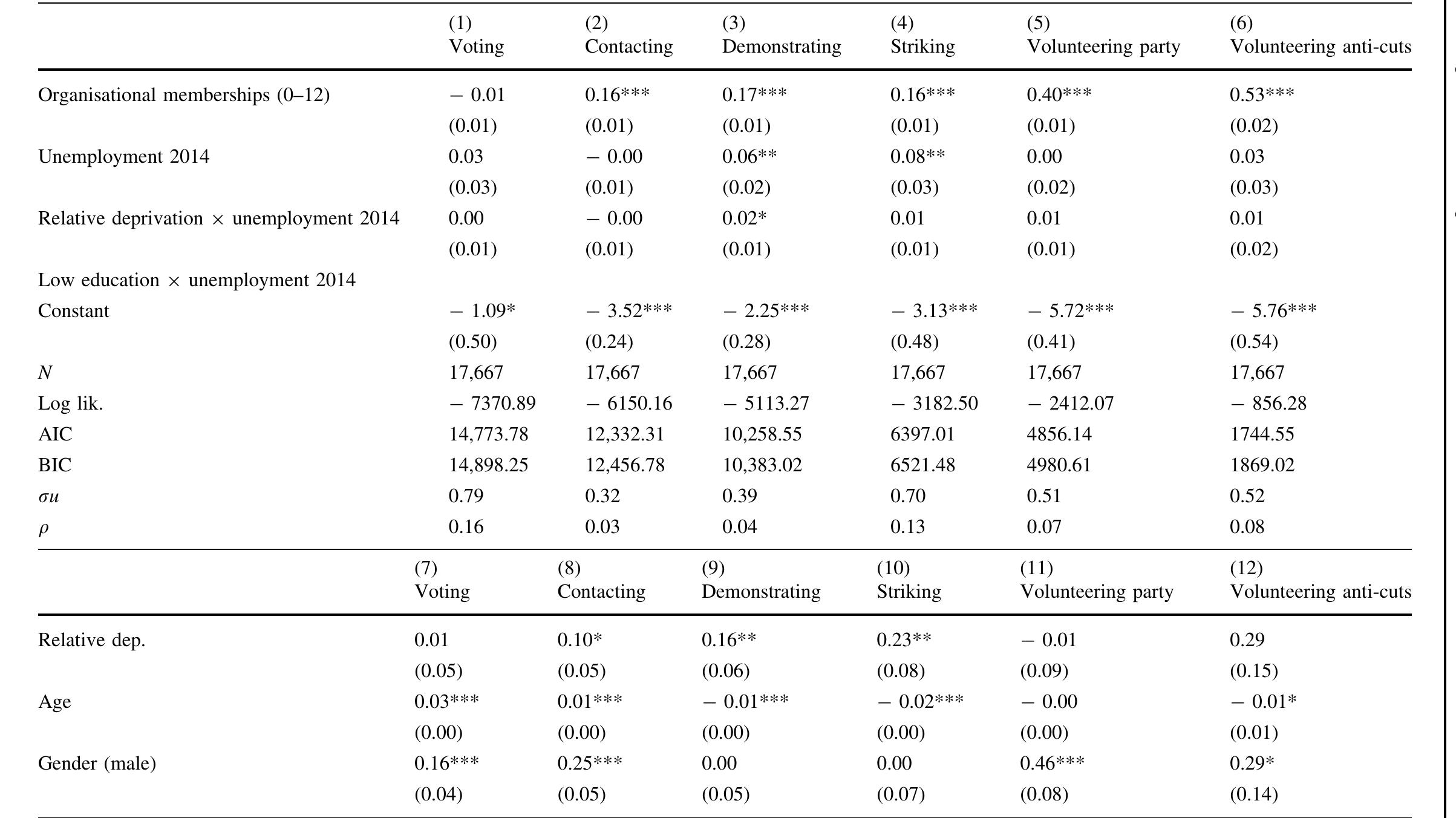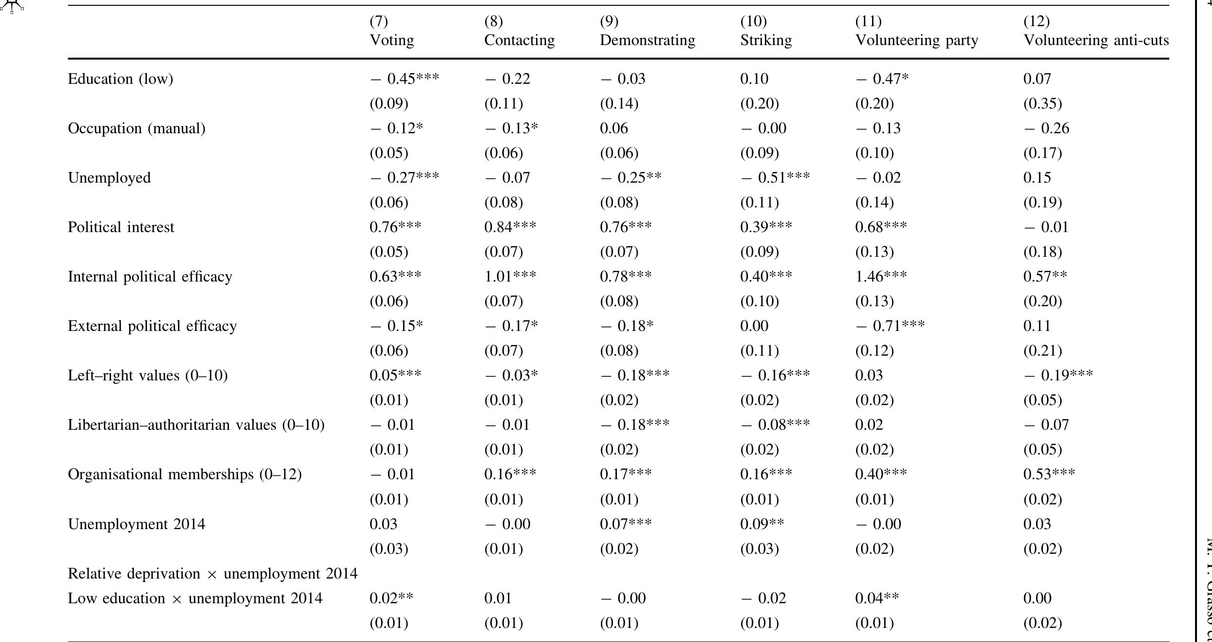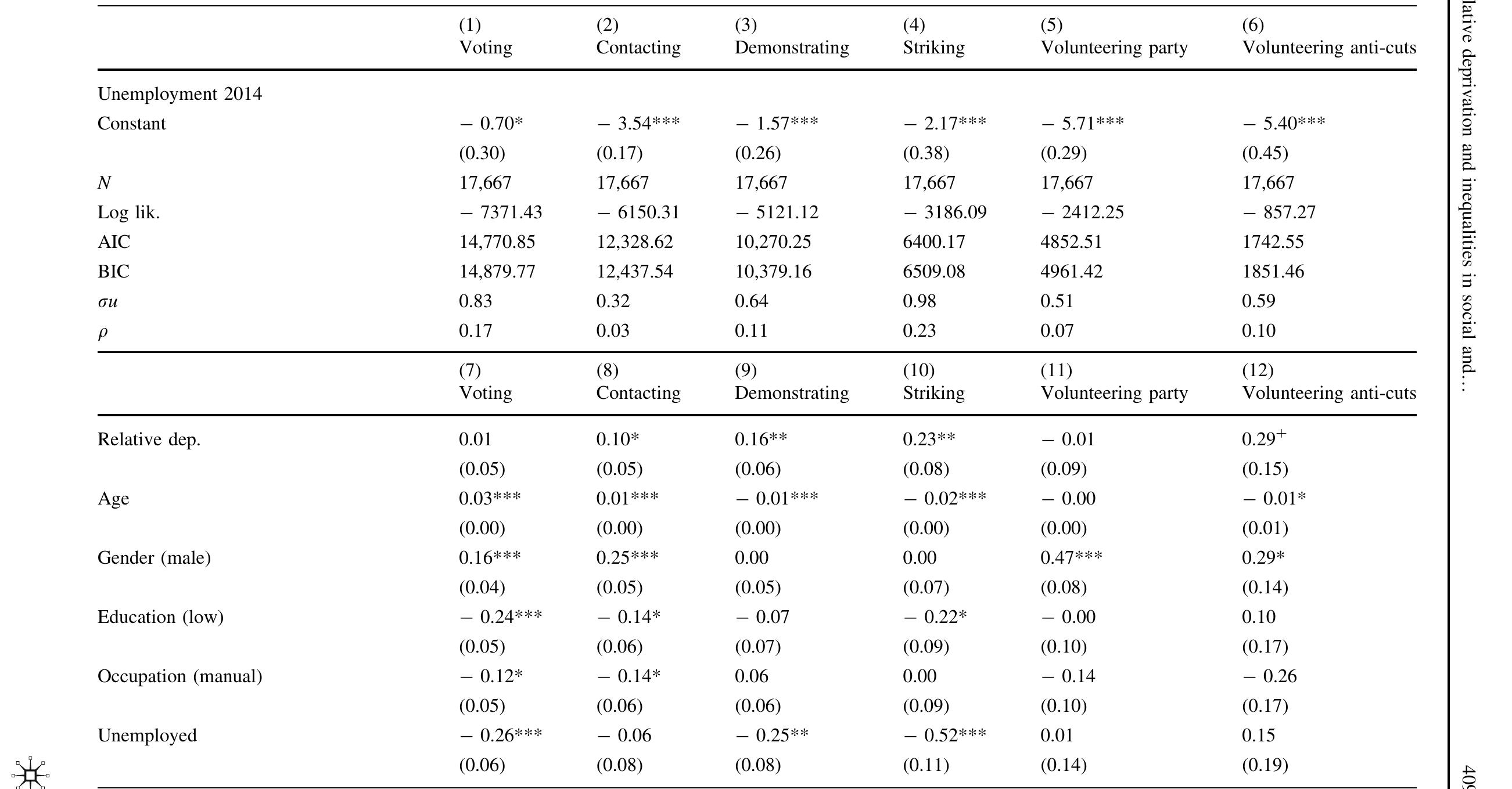 In this paper we analyse whether relative deprivation has divergent effects on different types of... more In this paper we analyse whether relative deprivation has divergent effects on different types of social and political action. We expect that it will depress volunteering with parties as well as different types of conventional political participation more generally while stimulating volunteering with anti-cuts organisations and engagement in various kinds of protest activism. There is little research into how relative deprivation impacts on different types of social and political action from the wide range of activities available to citizens in contemporary democracies as well as into how this relationship might vary based on the wider economic context. While many studies construct scales, we examine participation in specific activities and associations, such as parties or anti-cuts organisations, voting, contacting, demonstrating and striking to show that deprivation has divergent effects that depart from what is traditionally argued. We apply random effects models with cross-level...