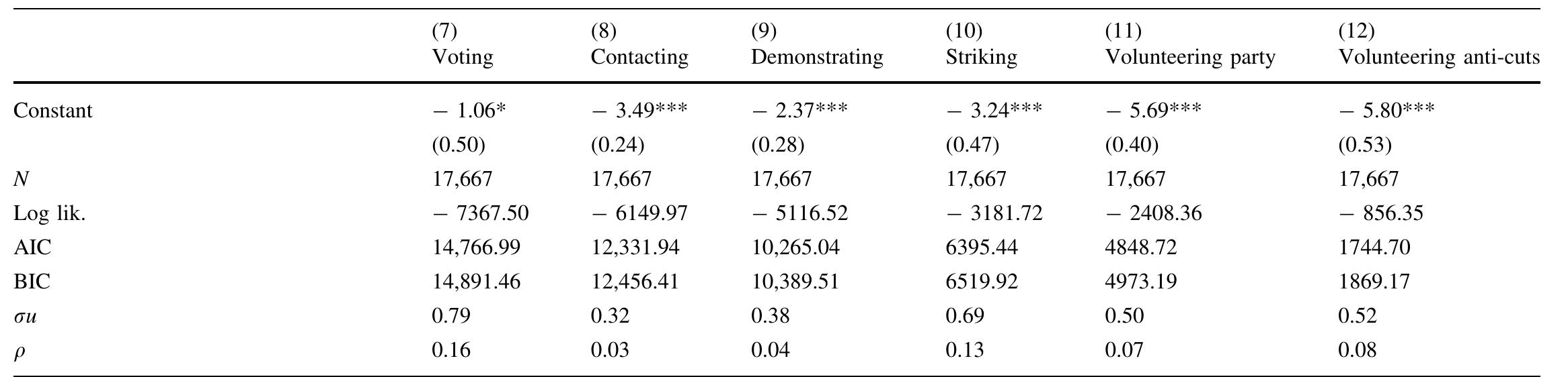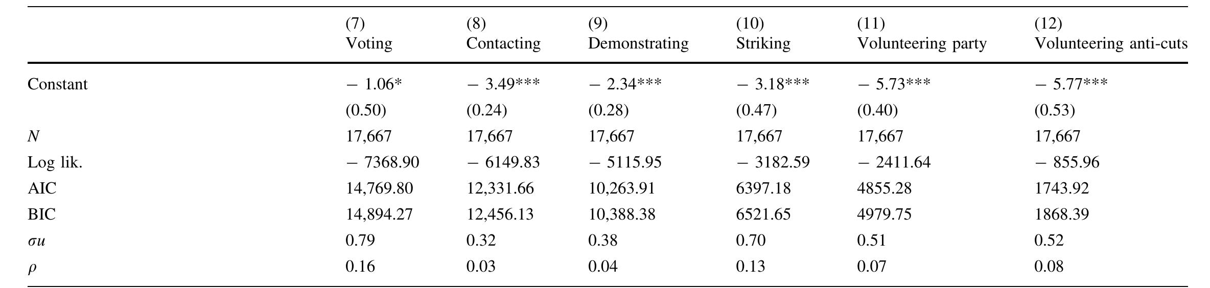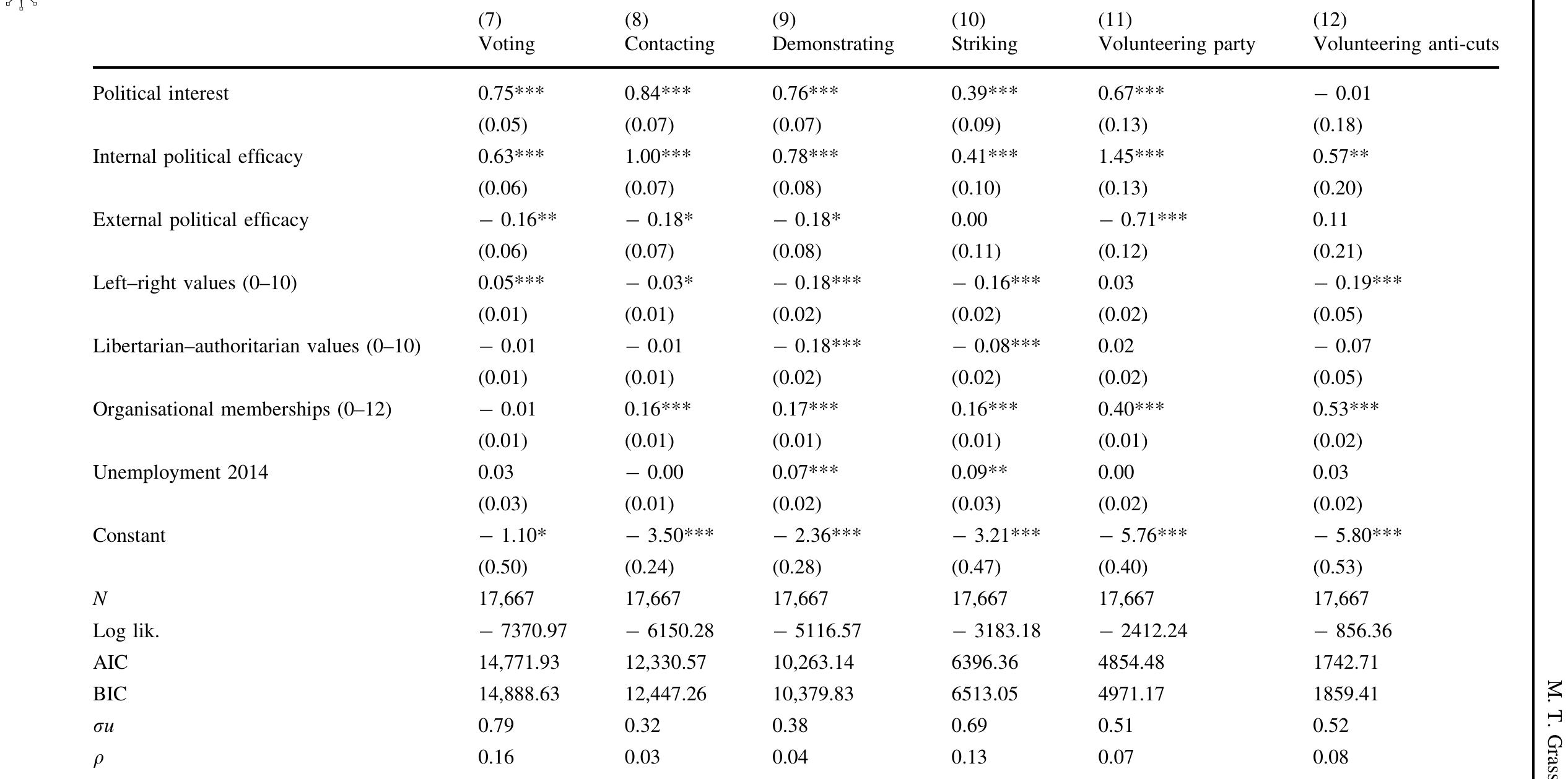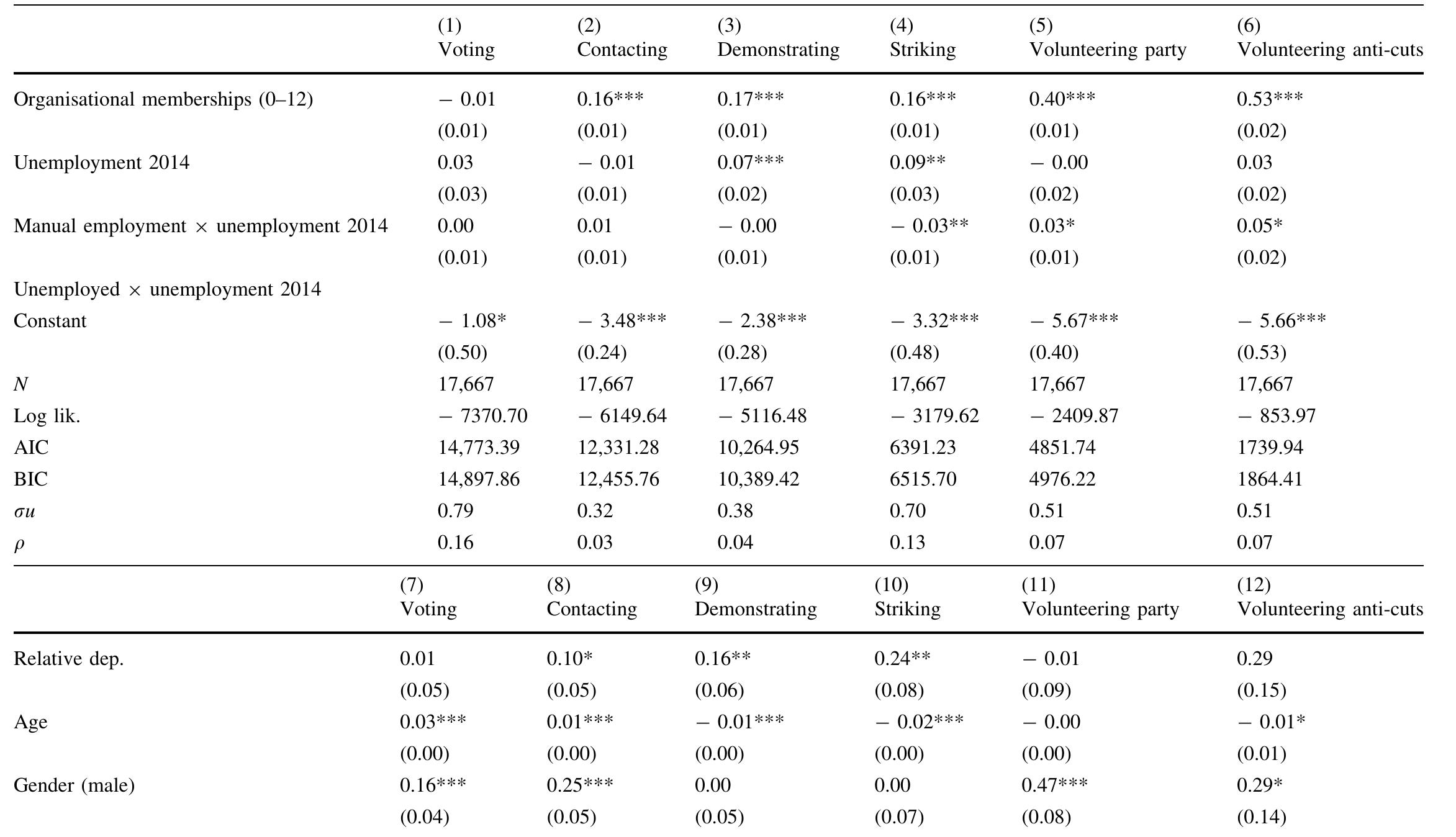 In this paper we analyse whether relative deprivation has divergent effects on different types of... more In this paper we analyse whether relative deprivation has divergent effects on different types of social and political action. We expect that it will depress volunteering with parties as well as different types of conventional political participation more generally while stimulating volunteering with anti-cuts organisations and engagement in various kinds of protest activism. There is little research into how relative deprivation impacts on different types of social and political action from the wide range of activities available to citizens in contemporary democracies as well as into how this relationship might vary based on the wider economic context. While many studies construct scales, we examine participation in specific activities and associations, such as parties or anti-cuts organisations, voting, contacting, demonstrating and striking to show that deprivation has divergent effects that depart from what is traditionally argued. We apply random effects models with cross-level...