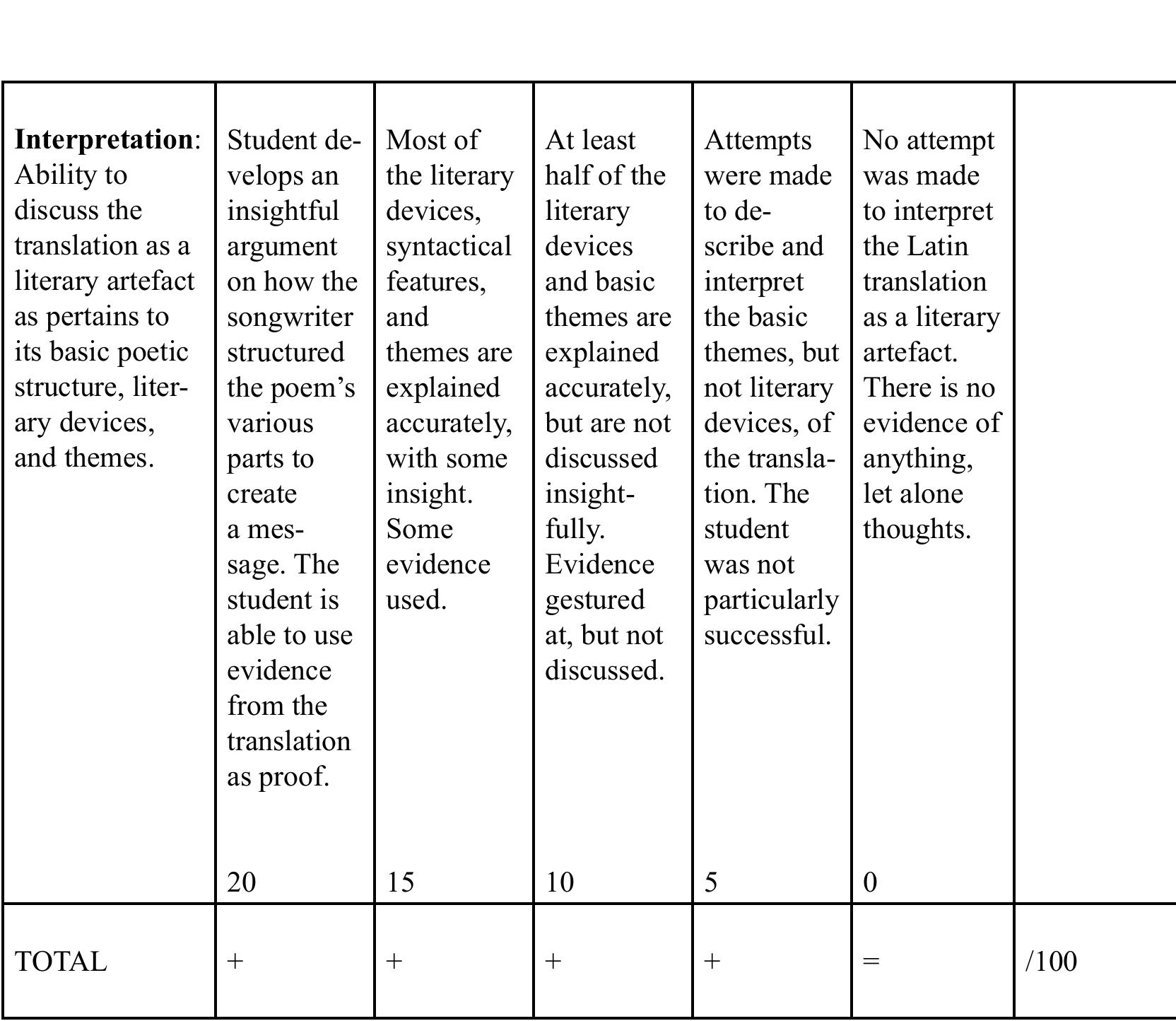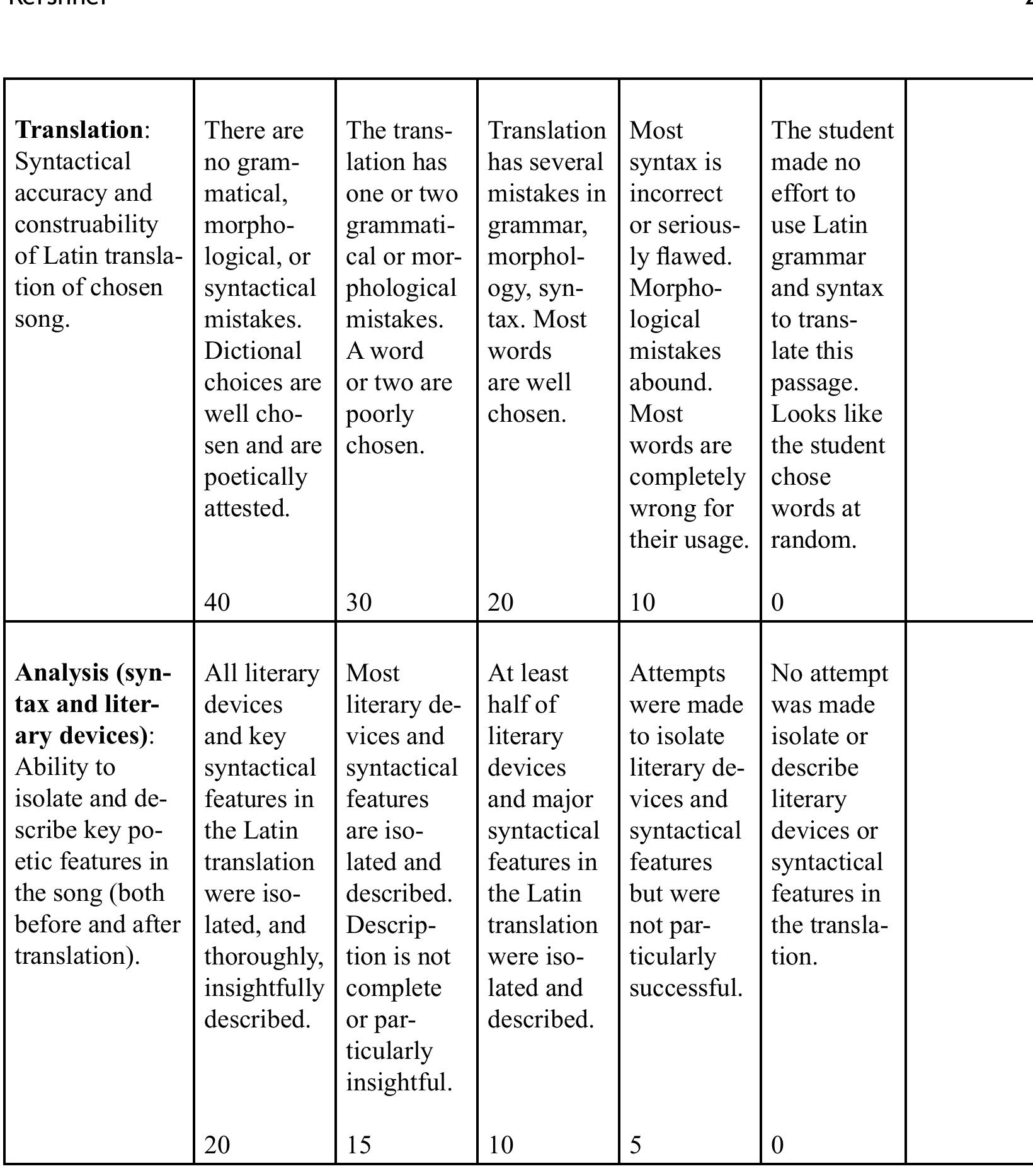 This article presents a method for developing and practicing both close reading skills and compos... more This article presents a method for developing and practicing both close reading skills and compositional skills as used in an undergraduate Latin Prose Composition course. By using contemporary popular music, students can learn how to recognize, comprehend, and use as a basis for analysis rhetorical and literary devices found in Latin poetry as well as poetic compositional style. When students translate popular songs that they know and understand into Latin and then analyze them according to basic philological processes, they are able to remove barriers to understanding deriving from cultural differences between the Roman world and their modern world. Further, this assignment also offers a solution to the critical problem that many students have no facility with poetic analysis of poetry in their native language. In addition to seeing extensive development of philological methods in students performing this assignment, results were also seen in advanced reading Latin courses in the form of better class discussion and more mature term papers.