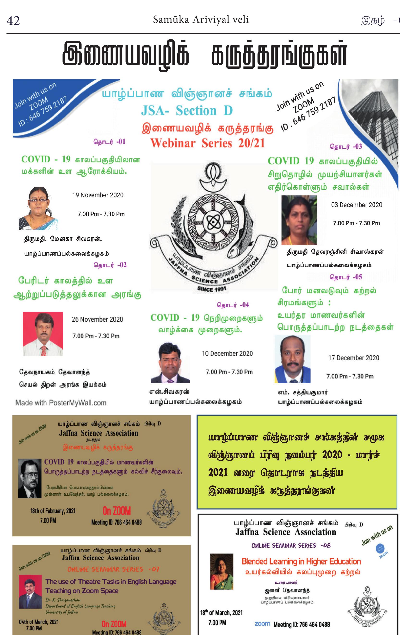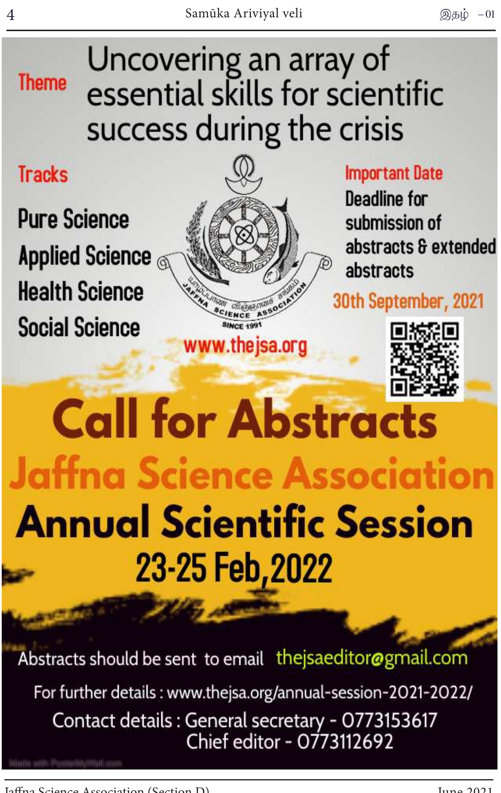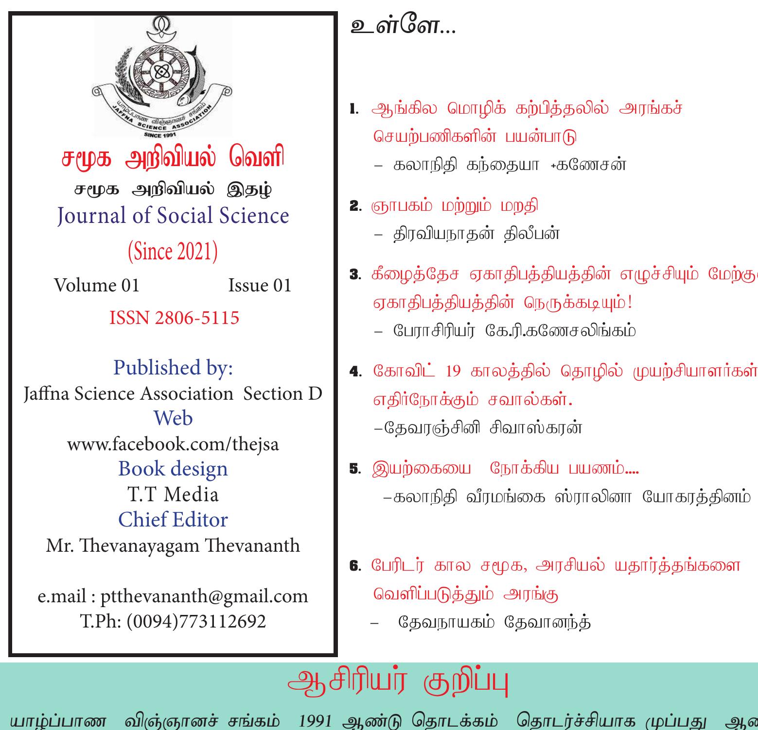 Samuka Ariviyal Veli Magazine is published by the Jaffna Science Association's Social Science division. It's consists of research papers in various fields. The editor of this magazine is Thevanayagam Thevananth and its first issue was published in June 2021.